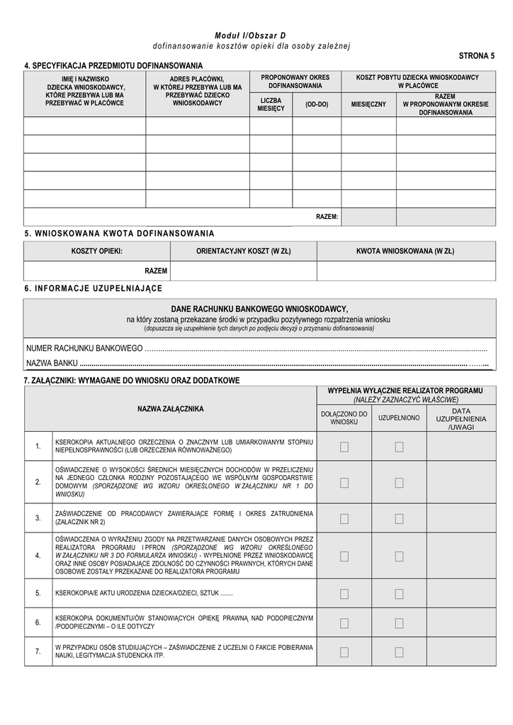 Moduł I / O bsza r D d of ina n so wan ie ko sztó w op ieki d la o so b y za le żne j STRONA 5 4. SPECYFIKACJA PRZEDMIOTU DOFINANSOWANIA IMIĘ I NAZWISKO DZIECKA WNIOSKODAWCY, KTÓRE PRZEBYWA LUB MA PRZEBYWAĆ W PLACÓWCE ADRES PLACÓWKI, W KTÓREJ PRZEBYWA LUB MA PRZEBYWAĆ DZIECKO WNIOSKODAWCY PROPONOWANY OKRES DOFINANSOWANIA LICZBA MIESIĘCY KOSZT POBYTU DZIECKA WNIOSKODAWCY W PLACÓWCE (OD-DO) MIESIĘCZNY RAZEM W PROPONOWANYM OKRESIE DOFINANSOWANIA RAZEM: 5. WNI OS KO WANA KWO TA DO FI NANS OWANI A KOSZTY OPIEKI: ORIENTACYJNY KOSZT (W ZŁ) KWOTA WNIOSKOWANA (W ZŁ) RAZEM 6. I NFORMACJE UZUP EŁNI AJ ĄCE DANE RACHUNKU BANKOWEGO WNIOSKODAWCY, na który zostaną przekazane środki w przypadku pozytywnego rozpatrzenia wniosku (dopuszcza się uzupełnienie tych danych po podjęciu decyzji o przyznaniu dofinansowania) NUMER RACHUNKU BANKOWEGO ……........................................................................................................................................................................ NAZWA BANKU ...................................................................................................................................................................................................... ……... 7. ZAŁĄCZNIKI: WYMAGANE DO WNIOSKU ORAZ DODATKOWE NAZWA ZAŁĄCZNIKA WYPEŁNIA WYŁĄCZNIE REALIZATOR PROGRAMU (NALEŻY ZAZNACZYĆ WŁAŚCIWE) DOŁĄCZONO DO WNIOSKU UZUPEŁNIONO 1. KSEROKOPIA AKTUALNEGO ORZECZENIA O ZNACZNYM LUB UMIARKOWANYM STOPNIU NIEPEŁNOSPRAWNOŚCI (LUB ORZECZENIA RÓWNOWAŻNEGO) 2. OŚWIADCZENIE O WYSOKOŚCI ŚREDNICH MIESIĘCZNYCH DOCHODÓW W PRZELICZENIU NA JEDNEGO CZŁONKA RODZINY POZOSTAJĄCEGO WE WSPÓLNYM GOSPODARSTWIE DOMOWYM (SPORZĄDZONE WG WZORU OKREŚLONEGO W ZAŁĄCZNIKU NR 1 DO WNIOSKU) 3. ZAŚWIADCZENIE OD PRACODAWCY ZAWIERAJĄCE FORMĘ I OKRES ZATRUDNIENIA (ZAŁACZNIK NR 2) 4. OŚWIADCZENIA O WYRAŻENIU ZGODY NA PRZETWARZANIE DANYCH OSOBOWYCH PRZEZ REALIZATORA PROGRAMU I PFRON (SPORZĄDZONE WG WZORU OKREŚLONEGO W ZAŁĄCZNIKU NR 3 DO FORMULARZA WNIOSKU) - WYPEŁNIONE PRZEZ WNIOSKODAWCĘ ORAZ INNE OSOBY POSIADAJĄCE ZDOLNOŚĆ DO CZYNNOŚCI PRAWNYCH, KTÓRYCH DANE OSOBOWE ZOSTAŁY PRZEKAZANE DO REALIZATORA PROGRAMU 5. KSEROKOPIA/E AKTU URODZENIA DZIECKA/DZIECI, SZTUK ........ 6. KSEROKOPIA DOKUMENTU/ÓW STANOWIĄCYCH OPIEKĘ PRAWNĄ NAD PODOPIECZNYM /PODOPIECZNYMI – O ILE DOTYCZY 7. W PRZYPADKU OSÓB STUDIUJĄCYCH – ZAŚWIADCZENIE Z UCZELNI O FAKCIE POBIERANIA NAUKI, LEGITYMACJA STUDENCKA ITP. DATA UZUPEŁNIENIA /UWAGI Moduł I / O bsza r D d of ina n so wan ie ko sztó w op ieki d la o so b y za le żne j STRONA 6 8. INNE ZAŁĄCZNIKI (NALEŻY WYMIENIĆ): 9. 10. OŚWIADCZAM, ŻE: 1. o wnioskowane w ramach niniejszego wniosku dofinansowanie ze środków PFRON, ubiegam się wyłącznie za pośrednictwem Miasta Jaworzna tak nie 2.informacje podane we wniosku i załącznikach są zgodne z prawdą oraz przyjmuję do wiadomości, że podanie informacji niezgodnych z prawdą, eliminuje wniosek z dalszego rozpatrywania, 3. zapoznałam(em) się z zasadami udzielania pomocy w ramach pilotażowego programu „Aktywny samorząd”, które przyjmuję do wiadomości i stosowania oraz przyjęłam(em) do wiadomości, że tekst programu jest dostępny pod adresem: www.pfron.org.pl, a także www.bip.jaworzno.pl. 4. w okresie ostatnich 3 lat uzyskałam(em) pomoc ze środków PFRON (w tym za pośrednictwem powiatu) na zakup wózka inwalidzkiego o napędzie elektrycznym: tak - nie, 5. posiadam środki finansowe na pokrycie udziału własnego w zakupie wózka inwalidzkiego o napędzie elektrycznym (w zależności od wysokości przyznanej pomocy finansowej – co najmniej 10% ceny brutto), 6. przyjmuję do wiadomości i stosowania, iż złożenie niniejszego wniosku o dofinansowanie nie gwarantuje uzyskania pomocy w ramach realizacji programu oraz, że warunkiem zawarcia umowy dofinansowania jest spełnianie warunków uczestnictwa określonych w programie także w dniu podpisania umowy, 7. przyjmuję do wiadomości i stosowania, że ewentualne wyjaśnienia, uzupełnienia zapisów lub brakujących załączników do wniosku należy dostarczyć niezwłocznie, w terminie wyznaczonym przez Realizatora programu oraz, że prawidłowo zaadresowana korespondencja, która pomimo dwukrotnego awizowania nie zostanie odebrana, uznawana będzie za doręczoną, 8. w ciągu ostatnich 3 lat byłem(am) stroną umowy dofinansowania ze środków PFRON i rozwiązanej z przyczyn leżących po mojej stronie: tak - nie, 9. przyjmuję do wiadomości i stosowania, iż w przypadku przyznanego dofinansowania, przelanie środków finansowych następuje na konto dostawcy przedmiotu zakupu, na podstawie przedstawionej i podpisanej przez Wnioskodawcę faktury VAT. Jaworzno, dnia …………………………………………………….. ............................................................ podpis Wnioskodawcy Wnioskodawca nie mogący pisać, lecz mogący czytać, zamiast podpisu może uczynić na dokumencie tuszowy odcisk palca, a obok tego odcisku inna osoba wypisze jej imię i nazwisko umieszczając swój podpis; zamiast Wnioskodawcy może także podpisać się inna osoba, z tym że jej podpis musi być poświadczony przez notariusza lub wójta (burmistrza, prezydenta miasta), starostę lub marszałka województwa z zaznaczeniem, że podpis został złożony na życzenie nie mogącego pisać, lecz mogącego czytać. Jaworzno, dnia …………………………………………………….. ............................................................ Podpis osoby przyjmującej Wniosek