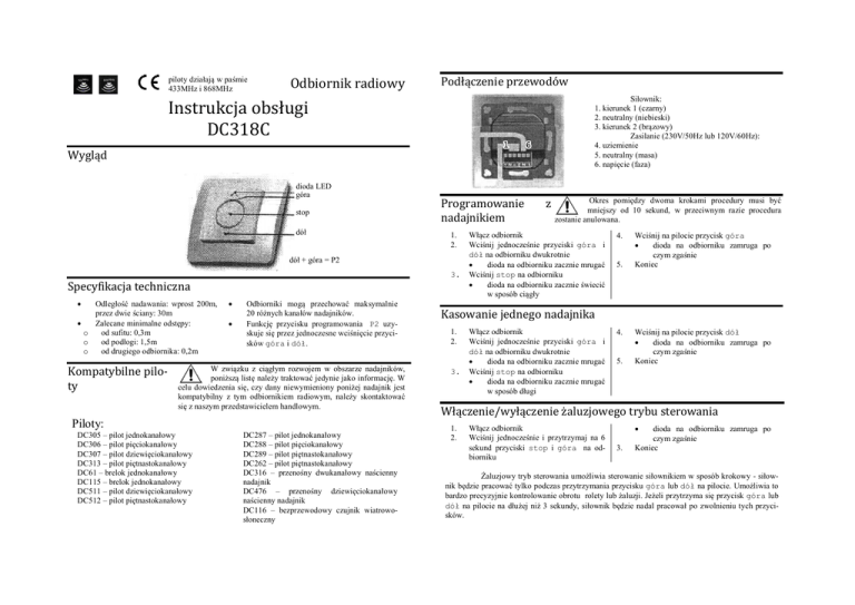 piloty działają w paśmie 433MHz i 868MHz Odbiornik radiowy Podłączenie przewodów Siłownik: 1. kierunek 1 (czarny) 2. neutralny (niebieski) 3. kierunek 2 (brązowy) Zasilanie (230V/50Hz lub 120V/60Hz): 4. uziemienie 5. neutralny (masa) 6. napięcie (faza) Instrukcja obsługi DC318C Wygląd dioda LED góra stop dół Programowanie nadajnikiem 1. 2. dół + góra = P2 3. Specyfikacja techniczna Odległość nadawania: wprost 200m, przez dwie ściany: 30m Zalecane minimalne odstępy: o od sufitu: 0,3m o od podłogi: 1,5m o od drugiego odbiornika: 0,2m Kompatybilne piloty Odbiorniki mogą przechować maksymalnie 20 różnych kanałów nadajników. Funkcję przycisku programowania P2 uzyskuje się przez jednoczesne wciśnięcie przycisków góra i dół. W związku z ciągłym rozwojem w obszarze nadajników, poniższą listę należy traktować jedynie jako informację. W celu dowiedzenia się, czy dany niewymieniony poniżej nadajnik jest kompatybilny z tym odbiornikiem radiowym, należy skontaktować się z naszym przedstawicielem handlowym. Piloty: DC305 – pilot jednokanałowy DC306 – pilot pięciokanałowy DC307 – pilot dziewięciokanałowy DC313 – pilot piętnastokanałowy DC61 – brelok jednokanałowy DC115 – brelok jednokanałowy DC511 – pilot dziewięciokanałowy DC512 – pilot piętnastokanałowy DC287 – pilot jednokanałowy DC288 – pilot pięciokanałowy DC289 – pilot piętnastokanałowy DC262 – pilot piętnastokanałowy DC316 – przenośny dwukanałowy naścienny nadajnik DC476 – przenośny dziewięciokanałowy naścienny nadajnik DC116 – bezprzewodowy czujnik wiatrowosłoneczny z Okres pomiędzy dwoma krokami procedury musi być mniejszy od 10 sekund, w przeciwnym razie procedura zostanie anulowana. Włącz odbiornik Wciśnij jednocześnie przyciski góra i dół na odbiorniku dwukrotnie dioda na odbiorniku zacznie mrugać Wciśnij stop na odbiorniku dioda na odbiorniku zacznie świecić w sposób ciągły 4. 5. Wciśnij na pilocie przycisk góra dioda na odbiorniku zamruga po czym zgaśnie Koniec Kasowanie jednego nadajnika 1. 2. 3. Włącz odbiornik Wciśnij jednocześnie przyciski góra i dół na odbiorniku dwukrotnie dioda na odbiorniku zacznie mrugać Wciśnij stop na odbiorniku dioda na odbiorniku zacznie mrugać w sposób długi 4. 5. Wciśnij na pilocie przycisk dół dioda na odbiorniku zamruga po czym zgaśnie Koniec Włączenie/wyłączenie żaluzjowego trybu sterowania 1. 2. Włącz odbiornik Wciśnij jednocześnie i przytrzymaj na 6 sekund przyciski stop i góra na odbiorniku 3. dioda na odbiorniku zamruga po czym zgaśnie Koniec Żaluzjowy tryb sterowania umożliwia sterowanie siłownikiem w sposób krokowy - siłownik będzie pracować tylko podczas przytrzymania przycisku góra lub dół na pilocie. Umożliwia to bardzo precyzyjnie kontrolowanie obrotu rolety lub żaluzji. Jeżeli przytrzyma się przycisk góra lub dół na pilocie na dłużej niż 3 sekundy, siłownik będzie nadal pracował po zwolnieniu tych przycisków. Kasowanie wszystkich nadajników 1. 2. Włącz odbiornik Wciśnij jednocześnie i przytrzymaj na 6 sekund przyciski stop i dół na odbiorniku 3. dioda na odbiorniku zamruga po czym zgaśnie Koniec
