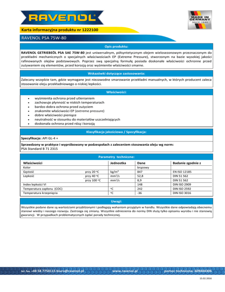 Karta informacyjna produktu nr 1222100 RAVENOL PSA 75W-80 Opis produktu: RAVENOL GETRIEBEÖL PSA SAE 75W-80 jest uniwersalnym, półsyntetycznym olejem wielosezonowym przeznaczonym do przekładni mechanicznych o specjalnych właściwościach EP (Extreme Pressure), stworzonym na bazie wysokiej jakości rafinowanych olejów podstawowych. Poprzez swą specjalną formułę posiada doskonałe właściwości ochronne przed zużywaniem się elementów, przed korozją oraz wyśmienite właściwości smarne. Wskazówki dotyczące zastosowania: Zalecany wszędzie tam, gdzie wymagane jest niezawodne smarowanie przekładni manualnych, w których producent zaleca stosowanie oleju przekładniowego o niskiej lepkości. Właściwości: • • • • • • • wyśmienita ochrona przed utlenianiem zachowuje płynność w niskich temperaturach bardzo dobra ochrona przed zużyciem znakomite właściwości EP (extreme pressure) dobre właściwości pieniące neutralność w stosunku do materiałów uszczelniających doskonała ochrona przed rdzą i korozją Klasyfikacja jakościowa / Specyfikacja: Specyfikacje: API GL-4 + Sprawdzony w praktyce i wypróbowany w podzespołach z zaleceniem stosowania oleju wg norm: PSA Standard B 71 2315 Parametry techniczne: Właściwości Kolor Gęstość Lepkość Index lepkości VI Temperatura zapłonu (COC) Temperatura krzepnięcia Jednostka przy 20 oC przy 40 oC przy 100 oC kg/m³ mm2/s mm2/s oC oC Dane Badanie zgodnie z brązowy 847 52,8 8,9 148 242 -36 EN ISO 12185 DIN 51 562 DIN 51 562 DIN ISO 2909 DIN ISO 2592 DIN ISO 3016 Uwagi: Wszystkie podane dane są wartościami przybliżonymi i podlegają wahaniom przyjętym w handlu. Wszystkie dane odpowiadają obecnemu stanowi wiedzy i naszego rozwoju. Zastrzega się zmiany. Wszystkie odniesienia do normy DIN służą tylko opisaniu wyrobu i nie stanowią gwarancji. W przypadkach problematycznych żądać porady technicznej. tel. fax. +48 58 7750115 [email protected] www.ravenol.pl pomoc techniczna: 609404306 15.02.2016