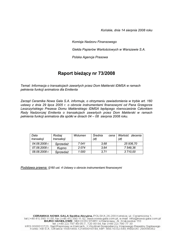 Końskie, dnia 14 sierpnia 2008 roku Komisja Nadzoru Finansowego Giełda Papierów Wartościowych w Warszawie S.A. Polska Agencja Prasowa Raport bieżący nr 73/2008 Temat: Informacja o transakcjach zawartych przez Dom Maklerski IDMSA w ramach pełnienia funkcji animatora dla Emitenta Zarząd Ceramika Nowa Gala S.A. informuje, o otrzymaniu zawiadomienia w trybie art. 160 ustawy z dnia 29 lipca 2005 r. o obrocie instrumentami finansowymi od Pana Grzegorza Leszczyńskiego Prezesa Domu Maklerskiego IDMSA będącego równocześnie Członkiem Rady Nadzorczej Emitenta o transakcjach zawartych przez Dom Maklerski w ramach pełnienia funkcji animatora dla spółki w dniach 04 – 08 sierpnia 2008 roku. Data transakcji 04.08.2008 r. 07.08.2008 r. 08.08.2008 r. Rodzaj transakcji Sprzedaż Kupno Sprzedaż Wolumen 7 041 2 074 1 000 Średnia (zł) cena Wartość zlecenia (zł) 3,68 3,64 3,71 Podstawa prawna: §160 ust. 4 Ustawy o obrocie instrumentami finansowymi 25 936,70 7 549,36 3 710,00