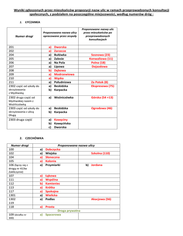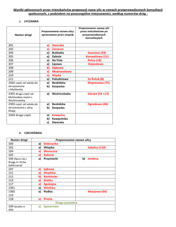 Wyniki zgłoszonych przez mieszkańców propozycji nazw ulic w ramach przeprowadzonych konsultacji społecznych, z podziałem na poszczególne miejscowości, według numerów dróg : 1. ŁYCZANKA Proponowana nazwa ulicy opracowane przez zespoły Numer drogi 201 202 204 205 206 207 208 209 210 211 2302 część od szkoły do a) a) a) a) a) a) b) a) a) a) a) b) skrzyżowania z Myśliwską 2302 druga część od Myśliwskiej razem z Woźńiczówką 2303 część od szkoły do skrzyżowania z ulicą Długą 2303 druga część Dworska Zarzecze Bułówka Zalesie Na Pola Lipowa Dębowa Modrzewiowa Wąska Południowa Beskidzka Karpacka Proponowane nazwy ulic przez mieszkańców po przeprowadzonych konsultacjach Sosnowa (23) Konwaliowa (11) Polna (18) Dojazdowa Za Potok (8) Ekspresowa (75) a) Woźniczówka Górska (54 +13) a) Beskidzka b) Karpacka Ogrodowa (46) a) Kawęciny b) Kawęcińska c) Dworska 2. CZECHÓWKA Numer drogi 100 102 104 105 106 (łączy się z a) a) a) a) a) Proponowana nazwa ulicy Dobczycka Wiejska Szkolna (110) Słoneczna Kolonia Przymiarki b) Jordana a) a) b) a) a) a) a) Łąkowa Wspólna Kamieniec Krótka Spokojna Wielicka Podlas drogą nr 413w Zakliczynie) 107 111 112 113 117 1301 1302 119 118 109 (działka nr 300) a) Prosta Droga prywatna a) Spacerowa Akacjowa (56) 3. ZAKLICZYN Numer drogi 401 część 401 druga część 401 trzecia część 403 404 405 406 część 406 druga część Proponowana nazwa ulicy a) Zadziele do cmentarza a) Ks. Wojciecha Brandysiewicza do skrzyżowania przy kościele a) Zagrody a) Kamionka b) Kamionkowa a) Starowiejska a) Nad Zalewem a) Górska b) Podgórska 407 408 409 410 a) a) a) a) a) b) Kościelna Podlesie Pakuz Św. Floriana Kobylak (22) Stolarska 412 413 (łączy się z a) Bieżanów a) Przymiarki Cichy Kącik (39) b) Jordana drogą Nr 106 w Czechówce) 415 418 419 423 429 3401 część 3401 druga część 111 Dz. nr 352 a) a) a) a) a) a) Czerwona Góra Widokowa Czarny Las Stroma Leśna Wacława Iwaszkiewicza do skrzyżowania a) Działy a) Wspólna Drogi prywatne a) Kasztanowa (18) b) Jodłowa Myślenicka (60) 4. SIEPRAW Numer drogi 303 a) 304 a) b) c) 307 a) b) a) b) a) a) a) a) 308 309 310 311 313 Proponowana nazwa ulicy Ks. Jana Przytockiego Długa (140) Główna A.Łacha i M.Jordana (121) Królewska Pod Kopytkiem Krzyszkowska Lipowa (35) Willowa Krakowska Anieli Salawy Granice Zacisze(16) Topolowa 314 315 318 319 320 część 320 druga część 321 322 a) a) a) a) b) a) Bukowa Graniczna Laskowa Wiśnicz Wiśniowa Gajówki 324 część a) a) a) b) a) b) c) a) 324 druga część 325 a) Na Wzgórzu a) Wisiołek 326 a) b) a) a) a) b) c) a) Jabłoniowa Rajska Olszowicka Dobra Myśliwska (24) Zawiła Łączna Wędoły a) a) a) b) a) b) Zachodnia Brzozowa Widokowa Na Stoku Do Potoka Pod Kopytkiem a) a) b) a) a) a) b) a) a) a) a) a) a) c) d) Kręta Łysa Góra Druga Za Krzyżem Kościelna Zielona Przemysłowa Dulska Boczna Sportowa Zakątek Młyńska Pasternik Łany Beskidzka Karpacka 323 327 328 329 330 331 332 335 337 i działka nr 212 340 341 342 343 344 346 351 363 366 2301 część 2301 druga część 2302 część od szkoły do skrzyżowania z Myśliwską 2302 druga część od Myśliwskiej razem z Woźńiczówką Zagórze Działy Brzeg Brzegowa Leśna (92) Kwiatowa Jana Pawła (78) Łysa Góra Druga Do skrzyżowania b) Za Krzyżem b) Woźniczówka Kalinowa Gajowa (22) Za Górą (26) Wrzosowa (55) Parkowa (107) Mostowa (13) Jagodowa (40) Św. Michała Archanioła (44) c) Pogodna Potok (13) Urocza (19) Parkowa (107) Św. Marcina Na Grobli Karpacka (105) Ekspresowa (75) Górska (54 +13) 2303 a) Kawęciny b) Kawęcińska c) Dworska 3402 część pierwsza do skrzyżowania z ulicą Laskową 3402 część druga Dz. nr 914 DZ. NR 1766/3 DZ. nr 92/11, 94/2, 92/8 a) Rzemieślnicza b) Zarusinki a) Południowa (49) Słowiańska (129) Azaliowa (15) Stawowa Rajska Drogi prywatne Dz. nr 290/13 Dz. nr 1089/6 Dz. nr 617 Dz. nr 2616/2, 2616/3, 2700 Dz. nr 1764/1 Dz. nr 1023 Różana (16) Panoramiczna (8) Cicha (6) Biskupia (7) Staropolska (4) ??? Legenda: Kolorem czarnym zostały zaznaczone nazwy proponowane przez powołane zespoły, a których nie zaakceptowali mieszkańcy. Kolorem czerwonym zaznaczono propozycje nazw ulic, które zaakceptowali mieszkańcy gminy. Kolorem zielonym oznaczono propozycje nazw ulic dla dróg prywatnych, co do których właściciele złożyli wnioski o nadanie nazw.
