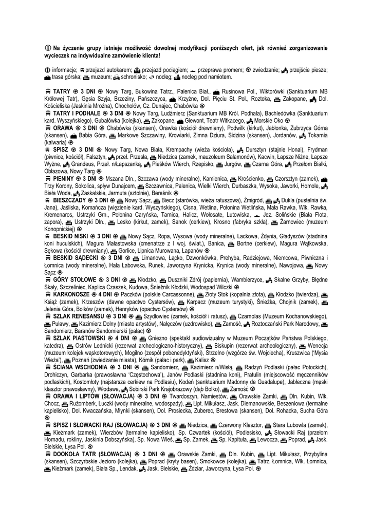 Na życzenie grupy istnieje możliwość dowolnej modyfikacji poniższych ofert, jak również zorganizowanie wycieczek na indywidualne zamówienie klienta! informacje; przejazd autokarem; przejazd pociągiem; przeprawa promem; zwiedzanie; przejście piesze; trasa górska; muzeum; schronisko; nocleg; nocleg pod namiotem. TATRY 3 DNI Nowy Targ, Bukowina Tatrz., Palenica Biał., Rusinowa Pol., Wiktorówki (Sanktuarium MB Królowej Tatr), Gęsia Szyja, Brzeziny, Pańszczyca, Krzyżne, Dol. Pięciu St. Pol., Roztoka, Zakopane, Dol. Kościeliska (Jaskinia Mroźna), Chochołów, Cz. Dunajec, Chabówka TATRY I PODHALE 3 DNI Nowy Targ, Ludźmierz (Sanktuarium MB Król. Podhala), Bachledówka (Sanktuarium kard. Wyszyńskiego), Gubałówka (kolejka), Zakopane, Giewont, Teatr Witkacego, Morskie Oko ORAWA 3 DNI Chabówka (skansen), Orawka (kościół drewniany), Podwilk (kirkut), Jabłonka, Zubrzyca Górna (skansen), Babia Góra, Markowe Szczawiny, Krowiarki, Zimna Dziura, Sidzina (skansen), Jordanów, Tokarnia (kalwaria) SPISZ 3 DNI Nowy Targ, Nowa Biała, Krempachy (wieża kościoła), Dursztyn (stajnie Honai), Frydman (piwnice, kościół), Falsztyn, przeł. Przesła, Niedzica (zamek, mauzoleum Salamonów), Kacwin, Łapsze Niżne, Łapsze Wyżne, Grandeus, Przeł. n/Łapszanką, Pieśków Wierch, Rzepisko, Jurgów, Czarna Góra, Przełom Białki, Obłazowa, Nowy Targ PIENINY 3 DNI Mszana Dln., Szczawa (wody mineralne), Kamienica, Krościenko, Czorsztyn (zamek), Trzy Korony, Sokolica, spływ Dunajcem, Szczawnica, Palenica, Wielki Wierch, Durbaszka, Wysoka, Jaworki, Homole, Biała Woda, Zaskalskie, Jarmuta (sztolnie), Bereśnik BIESZCZADY 3 DNI Nowy Sącz, Biecz (starówka, wieża ratuszowa), Żmigród, Dukla (pustelnia św. Jana), Jaśliska, Komańcza (więzienie kard. Wyszyńskiego), Cisna, Wetlina, Połonina Wetlińska, Mała Rawka, Wlk. Rawka, Kremenaros, Ustrzyki Grn., Połonina Caryńska, Tarnica, Halicz, Wołosate, Lutowiska, Jez. Solińskie (Biała Flota, zapora), Ustrzyki Dln., Lesko (kirkut, zamek), Sanok (cerkiew), Krosno (fabryka szkła), Żarnowiec (muzeum Konopnickiej) BESKID NISKI 3 DNI Nowy Sącz, Ropa, Wysowa (wody mineralne), Lackowa, Żdynia, Gładyszów (stadnina koni huculskich), Magura Małastowska (cmenatrze z I woj. świat.), Banica, Bortne (cerkiew), Magura Wątkowska, Sękowa (kościół drewniany), Gorlice, Lipnica Murowana, Łapanów BESKID SĄDECKI 3 DNI Limanowa, Łącko, Dzwonkówka, Prehyba, Radziejowa, Niemcowa, Piwniczna i Łomnica (wody mineralne), Hala Łabowska, Runek, Jaworzyna Krynicka, Krynica (wody mineralne), Nawojowa, Nowy Sącz GÓRY STOŁOWE 3 DNI Kłodzko, Duszniki Zdrój (papiernia), Wambierzyce, Skalne Grzyby, Błędne Skały, Szczeliniec, Kaplica Czaszek, Kudowa, Śnieżnik Kłodzki, Wodospad Wilczki KARKONOSZE 4 DNI Paczków (polskie Carcassonne), Złoty Stok (kopalnia złota), Kłodzko (twierdza), Książ (zamek), Krzeszów (dawne opactwo Cystersów), Karpacz (muzeum turystyki), Śnieżka, Chojnik (zamek), Jelenia Góra, Bolków (zamek), Henryków (opactwo Cystersów) SZLAK RENESANSU 3 DNI Szydłowiec (zamek, kościół i ratusz), Czarnolas (Muzeum Kochanowskiego), Puławy, Kazimierz Dolny (miasto artystów), Nałęczów (uzdrowisko), Zamość, Roztoczański Park Narodowy, Sandomierz, Baranów Sandomierski (pałac) SZLAK PIASTOWSKI 4 DNI Gniezno (spektakl audiowizualny w Muzeum Początków Państwa Polskiego, katedra), Ostrów Lednicki (rezerwat archeologiczno-historyczny), Biskupin (rezerwat archeologiczny), Wenecja (muzeum kolejek wąskotorowych), Mogilno (zespół pobenedyktyński), Strzelno (wzgórze św. Wojciecha), Kruszwica (‘Mysia Wieża’), Poznań (zwiedzanie miasta), Kórnik (pałac i park), Kalisz ŚCIANA WSCHODNIA 3 DNI Sandomierz, Kazimierz n/Wisłą, Radzyń Podlaski (pałac Potockich), Drohiczyn, Garbarka (prawosławna ‘Częstochowa’), Janów Podlaski (stadnina koni), Pratulin (miejscowość męczenników podlaskich), Kostomłoty (najstarsza cerkiew na Podlasiu), Kodeń (sanktuarium Madonny de Guadalupe), Jabłeczna (męski klasztor prawosławny), Włodawa, Sobirski Park Krajobrazowy (dąb Bolko), Zamość ORAWA I LIPTÓW (SŁOWACJA) 3 DNI Twardoszyn, Namiestów, Orawskie Zamki, Dln. Kubin, Wlk. Chocz, Rużomberk, Luczki (wody mineralne, wodospady), Lipt. Mikułasz, Jask. Diemanowskie, Beszeniowa (termalne kąpielisko), Dol. Kwaczańska, Młynki (skansen), Dol. Prosiecka, Zuberec, Brestowa (skansen), Dol. Rohacka, Sucha Góra SPISZ I SŁOWACKI RAJ (SŁOWACJA) 3 DNI Niedzica, Czerwony Klasztor, Stara Lubowla (zamek), Kieżmark (zamek), Wierzbów (termalne kąpielisko), Sp. Czwartek (kościół), Podlesisko, Słowacki Raj (przełom Hornadu, rokliny, Jaskinia Dobszyńska), Sp. Nowa Wieś, Sp. Zamek, Sp. Kapituła, Lewocza, Poprad, Jask. Bielskie, Łysa Pol. DOOKOŁA TATR (SŁOWACJA) 3 DNI Orawskie Zamki, Dln. Kubin, Lipt. Mikułasz, Przybylina (skansen), Szczyrbskie Jezioro (kolejka), Poprad (kryty basen), Smokowce (kolejka), Tatrz. Łomnica, Wlk. Łomnica, Kieżmark (zamek), Biała Sp., Lendak, Jask. Bielskie, Żdziar, Jaworzyna, Łysa Pol. TATRY BIELSKIE (SŁOWACJA) 3 DNI Łysa Pol., Jaworzyna (dworek myśliwski), Koperszady Zadnie, Przeł. p/Kopą Bielską, Koperszady Przednie, schr. ‘Szarotka’, Jask. Bielskie, Żdziar, Dol. Mąkowa, Szeroka Przeł. Bielska TATRY WYSOKIE (SŁOWACJA) 3 DNI Łysa Pol., Stary Smokowiec, Siodełko (kolejka), Wodospady Zimnej Wody, Dol. Pięciu St. Spiskich (schr. Tery’ego), Czerwona Ławka, Dol. Staroleśna, Wlk. Łomnica, Szczyrbskie Jez., Przednie Solisko (kolejka), Dol. Furkotna, Bystry Przechód, Dol. Młynicy, Poprad (kryty basen), Dol. Kieżmarska, Dol. Białych Stawów, Koperszady, schr. ‘Szarotka’, Jask. Bielskie NIŻNE TATRY I WIELKA FATRA (SŁOWACJA) 2 DNI Dln. Kubin, Rużomberk, Wilkoliniec (skansen), Lipt. Łużna, Praszywa, Hiadelska Przeł., Korytnica (wody mineralne), Rewucza, Ploszka, Ostredok, Krzyżna NIŻNE TATRY (SŁOWACJA) 3 DNI Dln. Kubin, Lipt. Mikułasz, Jask. Di