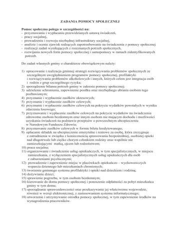 ZADANIA POMOCY SPOŁECZNEJ Pomoc społeczna polega w szczególności na: - przyznawaniu i wypłacaniu przewidzianych ustawą świadczeń, - pracy socjalnej, - prowadzeniu i rozwoju niezbędnej infrastruktury socjalnej, - analizie i ocenie zjawisk rodzących zapotrzebowanie na świadczenia z pomocy społecznej - realizacji zadań wynikających z rozeznanych potrzeb społecznych, - rozwijaniu nowych form pomocy społecznej i samopomocy w ramach zidentyfikowanych potrzeb. Do zadań własnych gminy o charakterze obowiązkowym należy: 1) opracowanie i realizacja gminnej strategii rozwiązywania problemów społecznych ze szczególnym uwzględnieniem programów pomocy społecznej, profilaktyki i rozwiązywania problemów alkoholowych i innych, których celem jest integracja osób i rodzin z grup szczególnego ryzyka; 2) sporządzenie bilansu potrzeb gminy w zakresie pomocy społecznej; 3) udzielenie schronienia, zapewnienie posiłku oraz niezbędnego ubrania osobom tego pozbawionym; 4) przyznanie i wypłacenie zasiłków okresowych; 5) przyznanie i wypłacenie zasiłków celowych; 6) przyznanie i wypłacenie zasiłków celowych na pokrycie wydatków powstałych w wyniku zdarzenia losowego; 7) przyznawanie i wypłacenie zasiłków celowych na pokrycie wydatków na świadczenia zdrowotne osobom bezdomnym oraz innym osobom nie mającym dochodu i możliwości uzyskania świadczeń na podstawie przepisów o powszechnym ubezpieczeniu w Narodowym Funduszu Zdrowia; 8) przyznawanie zasiłków celowych w formie biletu kredytowanego; 9) opłacanie składek na ubezpieczenie emerytalne i rentowe za osobę, która zrezygnuje z zatrudnienia w związku z koniecznością sprawowania bezpośredniej, osobistej opieki nad długotrwale lub ciężko chorym członkiem rodziny oraz wspólnie nie zamieszkującymi matką, ojcem lub rodzeństwem; 10) praca socjalna; 11) organizowanie i świadczenie usług opiekuńczych, w tym specjalistycznych, w miejscu zamieszkania, z wyłączeniem specjalistycznych usług opiekuńczych dla osób z zaburzeniami psychicznymi; 12) prowadzenie i zapewnienie miejsc w placówkach opiekuńczo – wychowawczych wsparcia dziennego lub mieszkaniach chronionych; 13) tworzenie gminnego systemu profilaktyki i opieki nad dzieckiem i rodziną; 14) dożywianie dzieci; 15) sprawienie pogrzebu, w tym osobom bezdomnym; 16) kierowanie do domu pomocy społecznej i ponoszenie odpłatności za pobyt mieszkańca gminy w tym domu; 17) sporządzanie sprawozdawczości oraz przekazywanie jej właściwemu wojewodzie, również w wersji elektronicznej, z zastosowaniem systemu informatycznego; 18) utworzenie i utrzymywanie ośrodka pomocy społecznej, w tym zapewnienie środków na wynagrodzenia pracowników. Do zadań własnych gminy należy: 1) przyznawanie i wypłacanie zasiłków specjalnych celowych; 2) przyznawanie i wypłacanie pomocy na ekonomiczne usamodzielnienie w formie zasiłków, pożyczek oraz pomocy w naturze; 3) prowadzenie i zapewnienie miejsc w domach pomocy społecznej i ośrodkach wsparcia o zasięgu gminnym oraz kierowanie do nich osób wymagających opieki; 4) podejmowanie innych zadań z zakresu pomocy społecznej wynikających z rozeznanych potrzeb gminy, w tym tworzenie i realizacja programów osłonowych; 5) współpraca z Powiatowym Urzędem Pracy w zakresie upowszechnienia ofert pracy oraz informacji o wolnych miejscach pracy , upowszechnienia informacji o usługach, poradnictwa zawodowego i o szkoleniach. Do zadań zleconych z zakresu administracji rządowej realizowanych przez gminę należy: 1) przyznawanie i wypłacanie zasiłków stałych; 2) opłacanie składek na ubezpieczenie zdrowotne określonych w przepisach o powszechnym ubezpieczeniu w Narodowym Funduszu Zdrowia; 3) organizowanie i świadczenie specjalistycznych usług opiekuńczych w miejscu zamieszkania dla osób z zaburzeniami psychicznymi; 4) przyznawanie i wypłacanie zasiłków celowych na pokrycie wydatków związanych z klęską żywiołową lub ekologiczną; 5) prowadzenie i rozwój infrastruktury środowiskowych domów samopomocy dla osób z zaburzeniami psychicznymi; 6) realizacja zadań wynikających z rządowych programów pomocy społecznej, mających na celu ochronę poziomu życia osób, rodzin i grup społecznych oraz rozwój specjalistycznego wsparcia. 7) przyznawanie i wypłacanie zasiłków celowych, a także udzielanie schronienia, posiłku oraz niezbędnego ubrania cudzoziemcom. ZLECANIE REALIZACJI ZADAŃ Z ZAKRESU POMOCY SPOŁECZNEJ Organy administracji rządowej i samorządowej mogą zlecać realizację zadań z zakresu pomocy społecznej, udzielając dotacji na finansowanie lub dofinansowanie realizacji zadania: - organizacjom pozarządowym prowadzącym działalność w zakresie pomocy społecznej, - osobom prywatnym i jednostkom organizacyjnym działającym na podstawie przepisów o stosunku państwa do Kościoła Katolickiego w RP, stosunku Państwa do innych kościołów i związków wyznaniowych oraz o gwarancji wolności sumienia i wyznania, jeżeli ich cele statutowe obejmują prowadzenie działalności w zakresie pomocy społecznej. Zlecenie zadań nie może obejmować ustalania uprawnień do świadczeń, opłacania składek na ubezpieczenie społeczne i zdrowotne oraz wypłaty świadczeń pieniężnych. Zlecenie realizacji zadań odbywa się po uprzednim przeprowadzeniu konkursu ofert, który odbywa się przy uwzględnieniu zasady pomocniczności, efektywności, uczciwej konkurencji i jakości. Organ planujący zlecenie zadania ogłasza otwarty konkurs ofert z terminem składania ofert nie krótszym niż 30 dni. Ogłoszenie o konkursie ofert powinno zawierać informacje o: 1) 2) 3) 4) 5) 6) rodzaju zadania, wysokości dotacji na realizację zadania, warunkach przyznawania dotacji, terminie i warunkach realizacji zadania, terminie składania ofert, terminie, trybie i kryteriach stosowanych przy wyborze oferty. Oferta podmiotu uprawnionego powinna zawierać: 1) szczegółowy zakres rzeczowy 
