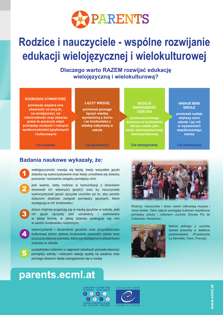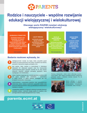 PARENTS Rodzice i nauczyciele - wspólne rozwijanie edukacji wielojęzycznej i wielokulturowej Dlaczego warto RAZEM rozwijać edukację wielojęzyczną i wielokulturową? ROZBUDZA OTWARTOŚĆ ŁĄCZY WIEDZĘ BUDUJE ŚWIADOMOŚĆ DZIECKA NADAJE SENS SZKOLE ponieważ wspiera ona otwartość na innych, na mniejszości, na różnorodność oraz stwarza przez to poczucie więzi pomiędzy osobami i rożnymi społecznościami językowymi i kulturowymi ponieważ pomaga łączyć wiedzę wyniesioną z domu i ze środowiska z wiedzą nabywaną w szkole ponieważ pomaga dzieciom w budowaniu obrazu siebie jako istoty wielowymiarowej, wielowarstwowej ponieważ nadaje większy sens szkole i jej roli w wyzwaniach współczesnego świata Cel socjalny Cel poznawczy Cel emocjonalny Cel edukacyjny Badania naukowe wykazały, że: 1 wielojęzyczność rozwija się lepiej, kiedy wszystkie języki dziecka są wykorzystywane oraz kiedy umożliwia się dziecku poznanie i tworzenie związku pomiędzy nimi; 2 jest ważne, żeby rodzice w komunikacji z dzieckiem stosowali ich własny(e) język(i) oraz by nauczyciele wykorzystywali języki ojczyste uczniów po to, aby pomóc dzieciom dostrzec związek pomiędzy językami, które występują w ich środowisku; 3 dzieci chętniej angażują się w naukę języków w szkole, jeśli ich język ojczysty jest uznawany i szanowany w takiej formie, w jakiej dziecko posługuje się nim w swoim środowisku rodzinnym; 4 wykorzystanie i docenienie języków oraz przynależności kulturowej dzieci ułatwia budowanie pewności siebie oraz poczucia własnej wartości, które są niezbędnymi składnikami sukcesu w szkole; 5 uczestnictwo rodziców w zajęciach szkolnych pozwala stworzyć pomiędzy szkołą i rodzicami relację opartą na zaufaniu oraz pomaga dzieciom lepiej zaangażować się w naukę. Rodzice, nauczyciele i dzieci razem odkrywają muzykę i tańce świata. Takie zajęcia pomagają budować współpracę pomiędzy szkolą i rodzinami uczniów (Escola Pia de Catalunya, Hiszpania). Babcia jednego z uczniów śpiewa piosenkę w dialekcie prowansalskim (Przedszkole La Serinette, Tulon, Francja). EUROPEAN CENTRE FOR MODERN LANGUAGES CENTRE EUROPEEN POUR LES LANGUES VIVANTES www.ecml.at parents.ecml.at Rodzice i nauczyciele mogą wspólnie rozwijać edukację wielojęzyczną i wielokulturową Jakie zajęcia można prowadzić z dziećmi? Poznanie znaczenia imion i ich symboliki Śpiewanie piosenek w różnych językach Wzajemna wymiana przepisami Odkrywanie rytuałów i świąt (ślub, wejście w dorosłość, urodziny) Odkrywanie innego alfabetu Odkrywanie podań, baśni i legend z rożnych krajów Nauka tańców z różnych krajów Rodzice – bądźcie pewni – nie musicie znać perfekcyjnie języka nauczania, aby uczestniczyć w życiu szkoły: obrazy, mimika i gesty również mogą być środkiem komunikacji. Nauczyciele, którzy zostali odpowiednio przeszkoleni z edukacji wielojęzycznej i wielokulturowej mogą pomóc Wam przygotować ciekawe zajęcia. Nawet, jeśli znacie tylko jeden język, nadal możecie się nim podzielić poprzez akcent, sposób mówienia czy też umiejętności kulinarne, artystyczne lub zawodowe. Różnorodność jest wszędzie! Rozbudzanie zainteresowania innością jest bardzo ważne w procesie poznania i zrozumienia świata. Jeśli myślicie, że programy szkolne są już teraz zbyt obciążające dla dzieci zapewniamy, że zajęcia z wielojęzyczności i wielokulturowości nie będą dodatkowym ciężarem a doskonałym uzupełnieniem przyswajanej wiedzy i kompetencji, których rozwój i tak jest przewidziany w programach nauczania. Takie zajęcia rozwijają zdolności, które ułatwiają naukę języków (zarówno języka nauczania jak i języków obcych), literatury, historii, geografii czy sztuki. Pomagają również rozwijać umiejętności, które przydają się w wielu dziedzinach np. stawianie hipotez i pytań, porównywanie, odkrywanie reguł i zasad. Edukacja wielojęzyczna i wielokulturowa przygotowuje dzieci do funkcjonowania w międzykulturowym świecie. Taka edukacja przyczynia się do kształtowania bardziej sprawiedliwego, harmonijnego i solidarnego świata. Kwiat złożony z powitania „Dzień dobry“ w rożnych językach. Projekt ten został zrealizowany w jednej ze świetlic socjalnych i miał na celu miał na celu umożliwić mieszkańcom lepsze poznanie ich własnej dzielnicy, jej pejzażu językowego i kulturowego (Awinion, Francja). Opowiadanie historii w rożnych językach Odkrywanie innego sposobu liczenia (liczby i gesty) Zrealizowanie projektu ukazującego różnorodność językową dzielnicy lub miasta Stworzenie plakatu z powitaniem «Dzień dobry» w różnych językach PARENTS Jeśli chcą Państwo dowiedzieć się więcej o projekcie CARAP PARENTS zapraszamy na stronę: http://parents.ecml.at Rosyjskojęzyczna mama zachęca przedszkolaki do zapoznania się z językiem rosyjskim. Takie zajęcia pozwalają uwrażliwić dzieci na inne dźwięki i różnorodność językową (szkoła La Serinette, Tulon, Francja) OSOBY, Z KTÓRYMI MOŻNA SKONTAKTOWAĆ SIĘ W EUROPIE: Philippe Blanchet (Francja), Damien Boisset (Francja), Stéphanie Clerc (koordynatorka, Francja), Anna Maria Curci (Włochy), Katarzyna Cybulska (Polska), Barbara Day (Dania), Viktoria Dimitrova (Bułgaria), Gaid Evenou (Francja), Maia Feldman (Dania), Arantxa Garcia de Sola (Hiszpania), Brigitte Gerber (Szwajcaria), Dagmar Gilly (Austria), Carmen González André (Katalonia, Hiszpania), Kristine Grigoryan (Armenia), Déirdre Kirwan (Irlandia), Lora Koleva (Bułgaria), Janko Korošec (Słowenia), Natasa Korošec (Słowenia), Georgia Kouma (Cypr), Arja Krauchenberg (Austria), Adena Kulukčija (Bośnia i Hercegowina), Fabio Leoni (Szwajcaria), Rodica Mighiu (Rumunia), Kę́stutis Mikolajùnas (Litwa), Argyro Moumtzidou (Grecja), Honoratte Muhanzi Kashale (Norwegia), Laila Nutti (Norwegia), Jaume Pallarols i Rusca (Katalonia, Hiszpania), Xavier Pasc