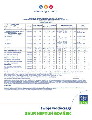 www.sng.com.pl KOMUNIKAT MIASTA GDAŃSKA I SAUR NEPTUN GDAŃSK W SPRAWIE JAKOŚCI WODY PRZEZNACZONEJ DO SPOŻYCIA PRZEZ LUDZI WODOCIĄG m. GDAŃSKA miesiąc: styczeń 2017 r. Wskaźnik jakości wody Źródło, rejon zasilania p-kt kontrolny Stacja Uzdatniania Wody STRASZYN Woda podawana do sieci Sieć wodociągowa zasilana wodą z SUW Straszyn i SUW Zakoniczyn Zapach akceptowalny Chlor Dwutlenek Amonowy wolny chloru Żelazo Mangan jon mg/l mg/l ug/l ug/l mg/l 0,32 0,02 <10 <5 <0,05 dz. Suchanino akceptowalny <0,02 <0,02 22 <5 <0,05 dz. Ujeścisko akceptowalny 0,12 <0,02 <10 <5 dz. Brętowo akceptowalny <0,02 <0,02 19 <5 dz. Chełm mg/l Al < 0,02 Se < 0,001 Hg < 0,0003 Cr < 0,0004 Ni < 0,003 As < 0,003 CHCl3 ug/l 2,7 nb CCl4 mg/l <0,05 Ca - 65 Przewodność - 422 nb <0,05 1,9 <0,05 Przewodność - 477 <0,05 Al < 0,02 Hg < 0,0003 Ni < 0,003 Se < 0,001 Cr < 0,0004 As < 0,003 8,7 <0,05 Przewodność - 465 Al < 0,11 Hg < 0,0003 Ni < 0,003 Przewod ność uS/cm Se < 0,001 Cr < 0,0004 As < 0,003 5,6 <0,05 Przewodność - 467 Wapń Sód Potas Magnez Siarczany mg/l mg/l mg/l mg/l mg/l 80 <0,02 <0,02 12 <5 <0,05 Zapach Twardość 0 metale inne wskaźniki Al < 0,02 Al < 0,02 Se < 0,001 Hg < 0,0003 Cr < 0,0004 Ni < 0,003 As < 0,003 akceptowalny Ujęcia wgłębne wodociąg centralny Mikrozanieczyszczenia Chlorki Żelazo Mangan Fluor N mg/l ug/l ug/l mg/l Przewodność - 464 Ca - 79 Ca - 74 Ca - 73 SUW Czarny Dwór - woda pleistoceńska akceptowalny 13 51 12 <5 0,3 674 106 42 4 13 SUW Zaspa - woda pleistoceńska akceptowalny 13 31 <10 <5 0,7 709 82 60 4 7 74 SUW Lipce - woda pleistoceńska akceptowalny 9 23 <10 <5 0,4 630 89 40 5 14 48 SUW Osowa - woda pleistoceńska akceptowalny 10 7 <10 <5 0,1 352 62 4 2 5 22 SUW Zakoniczyn - woda pleistoceńska akceptowalny 16 14 28 17 0,2 562 93 8 4 14 50 SUW Dolina Radości - woda pleistoceńska akceptowalny 11 10 44 <5 0,3 447 70 7 2 9 26 SUW Pręgowo -woda drenażowa Ujęcia wgłębne akceptowalny 16 11 <10 <5 0,2 554 95 8 2 12 40 SUW Smęgorzyno - woda pleistoceńska Ujęcie Ocz. Wschód (Płonia Wielka) - woda kredowa akceptowalny 13 15 <10 <5 0,2 496 80 6 2 9 85 akceptowalny 2,5 18 80 6 1,1 608 12 117 5 3 20 Najwyższe dopuszczalne stężenia wskaźników wg zał.nr 2, 3B i 4 do Rozporządzenia Ministra Zdrowia z dnia 13 listopada 2015 r. (Dziennik Ustaw 2015 poz. 1989). Zapach - akceptowalny przez konsumentów i bez nieprawidłowych zmian; Twardość [CaCO3]- od 60 do 500mg/l tj 3,4 - 28°N; Przewodność -2500mikroS/cm; Żelazo - 200ug/l, Mangan - 50ug/l, Amonowy jon- 0,50mg/l, Glin[Al]- 0,200mg/l, Sód[Na]- 200mg/l, Fluorki[F]- 1,5mg/l, Chlorki - 250mg/l, Siarczany - 250mg/l, Miedź[Cu]- 2,0mg/l, Ołów[ Pb]- 0,010mg/l, Nikiel[Ni]- 0,020mg/l, Rtęć[Hg]- 0,001mg/l, Bor [B] - 1,0 mg/l Kadm[Cd]- 0,005mg/l, Arsen[As]-0,010mg/l, Selen[Se]-0,010mg/l, Chloroform[CHCl3]- 30ug/l, Czterochlorek węgla[CCL4]- 2ug/l; Chlor wolny [Cl2] w punkcie czerpalnym u konsumenta - 0,3mg/l nb- nie badano Laboratorium SNG zgodnie z Ustawą z dnia 7.06.2001 r. Dz.U.2001.72.747 (tekst jednolity Dz.U. 2015 poz. 139) o zbiorowym zaopatrzeniu w wodę i odprowadzaniu ścieków może wykonywać badania wody przeznaczonej do spożycia przez ludzi. System jakości zatwierdzony przez PPIS w Gdańsku - Decyzja Nr SE.HK-30/4710/Lab/138/BZ/16. Zamieszczone w tabeli wyniki pochodzą z Laboratorium Centralnego Saur Neptun Gdańsk SA., które posiada kompetencje techniczne do wykonywania badań jakości wody zgodnie z normą PN-EN ISO/IEC 17025, potwierdzone certyfikatem akredytacji PCA nr AB 216. Posiadany certyfikat świadczy o rzetelności i obiektywności prowadzonych przez laboratorium badań. KOMENTARZ Jakość wody podawanej mieszkańcom z podstawowych ujęć wgłębnych i ujęcia powierzchniowego Straszyn spełniała wymagania dotyczące jakości wody przeznaczonej do spożycia przez ludzi. Państwowy Powiatowy Inspektor Sanitarny w Gdańsku zezwolił warunkowo na podawanie wody z ujęcia lokalnego ocz. Wschód. Zbadano pod względem bakteriologicznym wodę ze wszystkich ujęć m. Gdańska oraz w sieci wodociągowej [69 prób]. edo/komunikaty o jakosci.xls www.sng.com.pl KOMUNIKAT SAUR NEPTUN GDAŃSK W SPRAWIE JAKOŚCI WODY PRZEZNACZONEJ DO SPOŻYCIA PRZEZ LUDZI WODOCIĄG m. SOPOT miesiąc: styczeń 2017 r. Źródło, Wskaźnik jakości wody Zapach Twardość 0 p-kt kontrolny N Chlorki Żelazo Mangan Fluor mg/l ug/l ug/l mg/l Przewod ność uS/cm Wapń Sód Potas Magnez Siarczany mg/l mg/l mg/l mg/l mg/l SUW.Bitwy pod Płowcami - woda pleistoceńska i mioceńska akceptowalny 13 31 <10 <5 0,2 505 96 19,0 3,9 9,1 59 SUW Brodwino - woda mioceńska akceptowalny 9 4 <10 <5 0,3 345 59 6,9 2,8 7,1 <1 Ujęcie Nowe Sarnie Wzgórze - woda pleistoceńska akceptowalny 10 27 58 36 0,3 384 56 11,5 1,2 8,7 25 Najwyższe dopuszczalne stężenia wskaźników wg zał.nr 2, 3B i 4 do Rozporządzenia Ministra Zdrowia z dnia 13 listopada 2015 r. (Dziennik Ustaw 2015 poz. 1989). Zapach - akceptowalny przez konsumentów i bez nieprawidłowych zmian; Twardość [CaCO3]- od 60 do 500mg/l tj 3,4 - 28oN; Przewodność -2500mikroS/cm; Żelazo - 200ug/l, Mangan - 50ug/l, Sód - 200mg/l, Fluorki - 1,5mg/l, Chlorki - 250mg/l, Siarczany - 250mg/l nb- nie badano Laboratorium SNG zgodnie z Ustawą z dnia 7.06.2001 r. Dz.U.2001.72.747 (tekst jednolity Dz.U. 2015 poz. 139) o zbiorowym zaopatrzeniu w wodę i odprowadzaniu ścieków może wykonywać badania wody przeznaczonej do spożycia przez ludzi. System jakości zatwierdzony przez PPIS w Gdańsku - Decyzja Nr SE.HK30/4710/Lab/138/BZ/16. Zamieszczone w tabeli wyniki pochodzą z Laboratorium Centralnego Saur Neptun Gdańsk SA., które posiada kompetencje techniczne do wykonywania badań jakości wody zgodnie z normą PN-EN ISO/IEC 17025, potwierdzone certyfikatem akredytacji PCA nr AB 216. Posiadany certyfikat świadczy o rzetelności i obiektywności prowadzonych przez laboratorium badań. KOMENTARZ Jakość wody podawanej mieszkańcom spełniała wymagania fizykochemicz