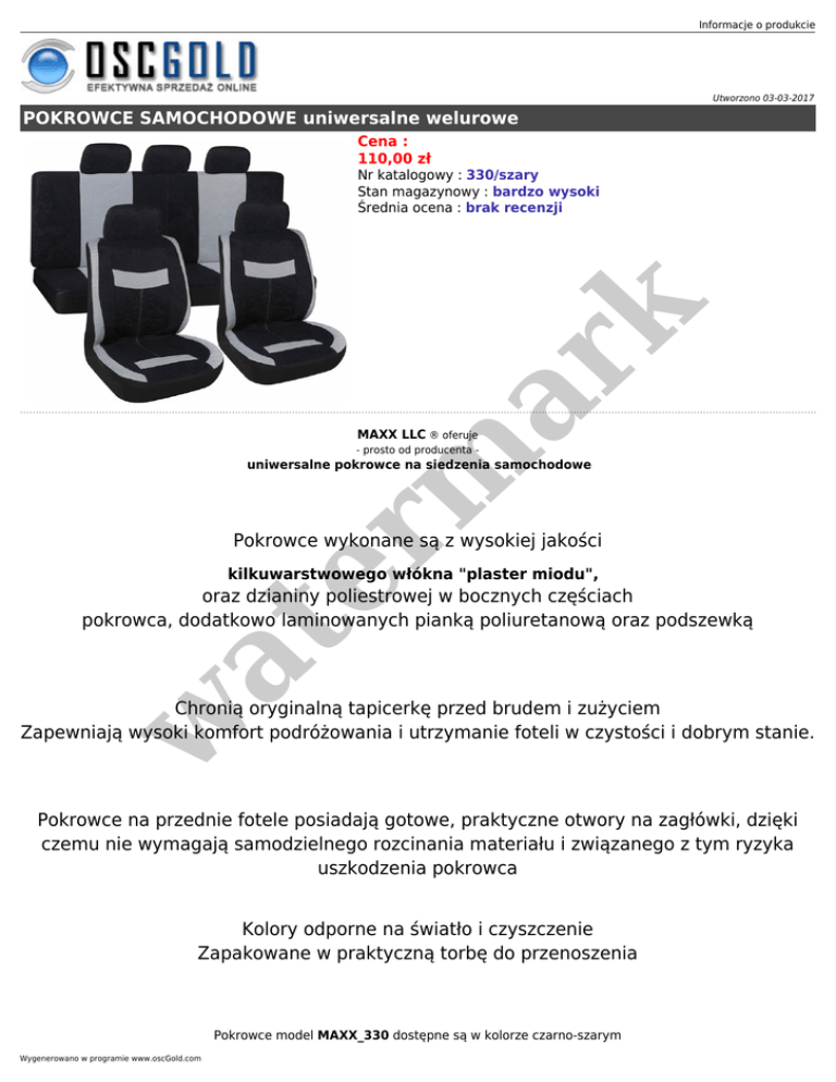 Informacje o produkcie Utworzono 03-03-2017 POKROWCE SAMOCHODOWE uniwersalne welurowe Cena : 110,00 zł er m ar k Nr katalogowy : 330/szary Stan magazynowy : bardzo wysoki Średnia ocena : brak recenzji MAXX LLC ® oferuje - prosto od producenta - uniwersalne pokrowce na siedzenia samochodowe Pokrowce wykonane są z wysokiej jakości kilkuwarstwowego włókna "plaster miodu", at oraz dzianiny poliestrowej w bocznych częściach pokrowca, dodatkowo laminowanych pianką poliuretanową oraz podszewką w Chronią oryginalną tapicerkę przed brudem i zużyciem Zapewniają wysoki komfort podróżowania i utrzymanie foteli w czystości i dobrym stanie. Pokrowce na przednie fotele posiadają gotowe, praktyczne otwory na zagłówki, dzięki czemu nie wymagają samodzielnego rozcinania materiału i związanego z tym ryzyka uszkodzenia pokrowca Kolory odporne na światło i czyszczenie Zapakowane w praktyczną torbę do przenoszenia Pokrowce model MAXX_330 dostępne są w kolorze czarno-szarym Wygenerowano w programie www.oscGold.com er m ar k at w w at er m ar k Informacje o produkcie Wygenerowano w programie www.oscGold.com Komplet zawiera: er m ar k 2 pokrowce na przednie fotele 1 pokrowiec na oparcie tylne 1 pokrowiec na siedzisko tylne 5 pokrowce na zagłówki haczyki montażowe OSIADAJĄ VARIO SYSTEM+ - można stosować do kanap dzielonych i niedzielonych. w at Posiadają zamki w tylnej kanapie dzięki czemu pasują do większości dzieleń dostępnych na rynku, nie blokują użycia podłokietnika - Pokrowiec można założyć również na niedzieloną tylną kanapę. Informacje o produkcie UWAGA!!! OTWORY NA ZAGŁÓWKI, OTWORY NA DŹWIGNIE DO PODNOSZENIA FOTELA, OTWORY NA POKRĘTŁA REGULACYJNE, OTWORY NA OSŁONY PASÓW BEZPIECZEŃSTWA I INNE WYSTAJĄCE CZĘŚCI FOTELI WYKONUJEMY SAMEMU PODCZAS MONTAŻU. ************************************************************************************* ● ● ● ● ● ● ● ● ● ● ● ● ● ● ● ● ● ● ● ● ● ● ● ● ● ● ● ● ● ● ● ● ● ● ALFA ROMEO 33 - 145 - 146 - 147 - 155 - 156 - 159 - 166 - ALFASUD - ALFETTA - GUILETTA AUDI 50 - 80 - 90 - 100 - A2 - A3 - A4 - A6 - A8 AUSTIN MINI AUTOBIANCHI A112 - Y10 BMW SERIE 1 - 2 - 3 - 7 3 X3 - X5 CHRYSLER 300 - NEON - PT CRUISER - SEBRING CITROEN AX - BX - C3 - C4 - C5 - CX - SAXO - XANTIA - XM - XSARA - ZX DACIA LOGAN - DUSTER - SANDERO DAEWOO - CHEVROLET ESPERO - KALOS - LANOS - LEGANZA - MATIZ - LACETTI - NEXIA - NUBIRA - EVANDA DAIHATSU CHARADE - GRAN MOVE - MOVE - SIRION - TERIOS FIAT 126 - 133 - BRAVA - BRAVO - CROMA - CINQUECENTO - MAREA - PALIO - PANDA - DOBLO - IDEA - PUNTO - RITMO SEICENTO - STILO - TEMPRA - TIPO - UNO - GRANDE PUNTO FORD ESCORT - COUGAR - FIESTA - FOCUS - FUSION - KA - MONDEO - ORION - PROBE - PUMA - SCORPIO - SIERRA HONDA JAZZ - ACCORD - CIVIC - CONCERTO - CRV - HRV - LEGEND - LOGO - PRELUDE - QUINTET HYUNDAI ACCENT - GUETZ - ATOS - MATRIX - XG - TERRACAN - GALLOPER - LANTRA - PONY - SCOUPE - SONATA - SANTA FE - TUCSON INNOCENTI 85 - 90 - 120 - DE TOMASO - MINI - MINITRL KIA SEPHIA - PICANTO - CERATO - OPIRUS - RIO - SORENTO - CARENS - MAGENTIS - SHUMA - SPORTAGE LADA 110 - 111 - NIVA - SAMARA LANCIA BETA - DEDRA - KAPPA - LYBRA - PRISMA - THEMA - Y - Y10 - THESIS - MUSA LEXUS GS - LS MAZDA 121 - 323 - 626 - 929 - RX - DEMIO - XEDOS MERCEDES 190 - 200 - 300 - CLASS A - CLASS C - CLASS E - CLASS ML - CLASS B MITSUBISCHI CARISMA - COLT - GALANT - LANCER - SPACE RUNNER - OUTLANDER - SPACE STAR NISSAN ALMERA - BLUEBIRD - MAXIMA - MICRA - MURANO - X TRAIL - PATHFINDER - TINO - SERENA - PRIMERA - SUNNY TERRANO OPEL ASCONA - SIGNUM - AGILA - ASTRA - CALIBRA - CITY - CORSA - FRONTIERA - KADETT - OMEGA - VECTRA - ZAFIRA PEUGEOT 106 - 206 - 207 - 305 - 306 - 307 - 405 - 406 - 407 - 505 - 1007 - 605 - 607 RENAULT CLIO - EXPRESS - LAGUNA - LAGUNA 2 - MEGANE - R4 - R5 - R9 - R11 - R19 - R21 - R25 - SAFRANE ROVER 25 - 45 - 75 - MONTEGO - SERIA 100 - 200 - 400 - 600 - 800 SAAB 9.3 - 9.5 SEAT ALTEA - AROSA - CORDOBA - FURA - IBIZA - LEON - MALAGA - MARBELLA - TOLEDO SKODA FAVORIT - FELICIA - FABIA - OCTAVIA - SUPERB - RAPID - CITYGO SMART FORFOUR SUBARU FORESTER - OUTBACK - IMPREZA - LEGACY SUZUKI ALTO - LIANA - IGNIS - WAGON R - BALENO - JIMNY - SWIFT - VITARA TOYOTA PRIUS - AVENSIS - COROLLA - STARLET - YARIS - RAV4 VOLKSWAGEN BORA - DERBY - FOX - GOLF - JETTA - LUPO - NEW - BEETLE - PASSAT - POLO - SIROCCO - SANTANA - VENTO VOLVO S40 - S60 - S70 - S80 - S90 - SERIA V at ● w ● er m ar k Pokrowce dostępne w rozmiarze uniwersalnym. Pasują m.in. do modeli: Wygenerowano w programie www.oscGold.com