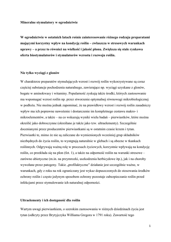 Mineralne stymulatory w ogrodnictwie W ogrodnictwie w ostatnich latach rośnie zainteresowanie różnego rodzaju preparatami mającymi korzystny wpływ na kondycję roślin – zwłaszcza w stresowych warunkach uprawy – a przez to również na wielkość i jakość plonu. Zwiększa się stale rynkowa oferta biostymulatorów i stymulatorów wzrostu i rozwoju roślin. Nie tylko wyciągi z glonów W charakterze preparatów stymulujących wzrost i rozwój roślin wykorzystywane są coraz częściej substancje pochodzenia naturalnego, zawierające np. wyciągi uzyskane z glonów, bogate w aminokwasy i witaminy. Popularność zyskują także środki, których zastosowanie ma wspomagać wzrost roślin np. przez stworzenie optymalnej równowagi mikrobiologicznej w podłożu. Nie można jednak zapominać, że na prawidłowy wzrost i rozwój roślin zasadniczy wpływ ma ich poprawne nawożenie i dostarczenie im kompletnego zestawu makro- i mikroelementów, a także – na co wskazują wyniki wielu badań – pierwiastków, które można określić jako dobroczynne (określano je także jako tzw. ultraelementy). Szczególnie docenianymi przez producentów pierwiastkami są w ostatnim czasie krzem i tytan. Pierwiastki te, mimo że nie są zaliczane do wymienionych wcześniej grup składników niezbędnych do życia roślin, to występują naturalnie w glebach i są obecne w tkankach roślinnych. Odgrywają ważną rolę w procesach życiowych, korzystnie wpływają na kondycję roślin, co przekłada się na plon (fot. 1), a także na odporność roślin na warunki stresowe – zarówno abiotyczne (m.in. na przymrozki, uszkodzenia herbicydowe itp.), jak i na choroby wywołane przez patogeny. Takie „profilaktyczne” działanie jest szczególnie ważne, w warunkach, gdy z roku na rok ograniczany jest wykaz dopuszczonych do stosowania środków ochrony roślin i często jedynym sposobem ochrony pozostaje zabezpieczanie roślin przed infekcjami przez stymulowanie ich naturalnej odporności. Ultraelementy i ich dostępność dla roślin Wartym uwagi pierwiastkiem, o szerokim zastosowaniu w różnych dziedzinach życia jest tytan (odkryty przez Brytyjczyka Williama Gregora w 1791 roku). Zawartość tego 1 pierwiastka w roślinach analizowano już w latach 30-tych ubiegłego wieku. Z badań prowadzonych przez m.in. Terlikowskiego i Górnickiego wynika, że np. rośliny zbożowe mogą zawierać 10-20 mg tytanu w kilogramie suchej masy, rośliny motylkowe 20-80 mg, a okopowe do 120 mg na kg s.m. Co ciekawe – zwiększoną tendencję do akumulowania się tytanu wykazuje się w tkankach zawierających także krzem (m.in. skrzyp, pokrzywa). W glebach występujących w Polsce udział jonów tytanu waha się od 0,79% (ilaste, mady i rędziny) do poziomu poniżej 0,04% (gleby torfowe). Dostępność i przyswajalność dla roślin tytanu zawartego w glebie uzależniona jest od jej odczynu – im jest on bardziej alkaliczny (wyższa wartość pH), jego dostępność zmniejsza się. Również im wyższa zawartość materii organicznej, tym dostępność jonów tytanu dla roślin jest mniejsza. W takich sytuacjach dobre efekty przynieść może pozakorzeniowe podawanie tego pierwiastka – poprzez opryskiwanie roślin nawozami mającymi w swoim składzie ten pierwiastek. Wielokierunkowe działanie tytanu i krzemu Korzystny wpływ tytanu na procesy życiowe roślin, a przez to na wielkość plonu (uzyskiwano wzrost plonu o 10–20%, a w pewnych przypadkach nawet o 30%) oraz jego jakość i trwałość, jest już stosunkowo dobrze poznany (fot. 2). Przejawia się on najsilniej w warunkach stresowych dla roślin, a związany jest z co najmniej 4 mechanizmami działania. Tytan wpływa na zwiększenie aktywności jonów żelaza w komórkach. Na ten aspekt stymulującego działania tytanu zwracali uwagę między innymi naukowcy z Instytutu Warzywnictwa w Skierniewicach – doc. dr. hab. Jan Borkowski i doc. dr hab. Barbara Dyki. Twierdzą oni, że dolistne nawożenie tytanem (stosowali w swoich doświadczeniach nawóz zawierający 8,5 g Ti w litrze) powoduje zwiększenie (od 16% nawet do 65%) zawartości w roślinach chlorofilu, którego powstawanie stymulują właśnie jony żelaza. Można także wnioskować, że dzięki zwiększeniu aktywności żelaza wzrasta intensywność fotosyntezy. Również z doświadczeń prowadzonych przez dr Andrzeja Grendę wynikało, że poprzez dolistne wprowadzenie jonów tytanu jednoznacznie zwiększa się: synteza chlorofilu, intensywność fotosyntezy oraz wzrasta aktywność takich enzymów, jak: katalaza czy peroksydaza, odpowiedzialnych za likwidowanie wolnych rodników. Udowodniono również, że tytan wpływa na wzrost aktywności lipoksygenazy – enzymu związanego z utlenianiem kwasu linolowego i linolenowego. Fakt ten nabiera 2 znaczenia w przypadku młodych, rozwijających się roślin, gdyż doprowadza do stabilizacji ich membran cytoplazmatycznych. Istnieje korelacja pomiędzy zwiększeniem zawartości jonów tytanu w roślinach, a intensywnością procesów lignifikacji, stymulowanych przez jony żelaza. Korzystne działanie tytanu na rośliny przejawia się również we wpływie na tempo pobierania składników pokarmowych. Doc. dr hab. Paweł Wójcik z Instytutu Ogrodnictwa w Skierniewicach wykazał, że po dolistnym podaniu nawozu zawierającego tytan nastąpiło zwiększenie tempa pobierania składników pokarmowych, zarówno dostarczonych dolistnie, jak i z roztworu glebowego. Związane to jest między innymi z wcześniej wspomnianymi czynnikami oraz ze zwiększeniem ciśnienia osmotycznego w komórkach nadziemnej części rośliny. Organizm roślinny dążąc do wyrównania ciśnienia pobiera poprzez system korzeniowy większe ilości wody i składników pokarmowych w niej zawartych. Skutkuje to tym, że lepiej odżywione rośliny, w których dodatkowo intensywniej przebiega fotosynteza, wytwarzają większa masę zieloną i dają wyższy plon, o większej zawarto