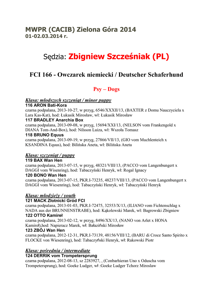 MWPR (CACIB) Zielona Góra 2014 01-02.03.2014 r. Sędzia: Zbigniew Szcześniak (PL) FCI 166 - Owczarek niemiecki / Deutscher Schaferhund Psy – Dogs Klasa: młodszych szczeniąt / minor puppy 116 ARON Bati-Kora czarna podpalana, 2013-10-27, w przyg, 6546/XXXII/13, (BAXTER z Domu Nauczyciela x Lara Kas-Kat), hod: Łukasik Mirosław, wł: Łukasik Mirosław 117 BRADLEY Anarchia Box czarna podpalana, 2013-09-08, w przyg, 15694/XXI/13, (NELSON vom Frankengold x DIANA Tom-And-Box), hod: Nilsson Luiza, wł: Wszoła Tomasz 118 BRUNO Equus czarna podpalana, 2013-09-19, w przyg, 27866/VII/13, (GIO vom Muchlenteich x KSANDINA Equus), hod: Bilińska Aneta, wł: Bilińska Aneta Klasa: szczeniąt / puppy 119 BAX Wan Hen czarna podpalana, 2013-07-15, w przyg, 48321/VIII/13, (PACCO vom Langenbungert x DAGGI vom Wisenring), hod: Tabaczyński Henryk, wł: Rogal Ignacy 120 BONO Wan Hen czarna podpalana, 2013-07-15, PKR.I-73235, 48237/VIII/13, (PACCO vom Langenbungert x DAGGI vom Wiesenring), hod: Tabaczyński Henryk, wł: Tabaczyński Henryk Klasa: młodzieży / youth 121 MACK Złotnicki Gród FCI czarna podpalana, 2013-01-03, PKR.I-72475, 32553/X/13, (ILIANO vom Fichtenschlag x NADA aus der BRUNNENSTRABE), hod: Kąkolewski Marek, wł: Bagrowski Zbigniew 122 OTTO Kamireł czarna podpalana, 2013-02-12, w przyg, 8496/XX/13, (NANO von Arlet x HONA Kamireł),hod: Napieracz Marek, wł: Bałaziński Mirosław 123 ZBÓJ Wan Hen czarna podpalana, 2012-12-31, PKR.I-73139, 48156/VIII/12, (BARU di Croce Santo Spirito x FLOCKE von Wiesenring), hod: Tabaczyński Henryk, wł: Rakowski Piotr Klasa: pośrednia / intermediate 124 DERRIK vom Trompetersprung czarna podpalana, 2012-08-13, sz 2283927, , (Conbarhieran Uno x Oduscha vom Trompetersprung), hod: Goeke Ludger, wł :Goeke Ludger Tchorz Miroslaw Klasa: otwarta / open 125 AZIR Jarkowski Dwór czarna podpalana, 2011-09-12, PKR.I-69833, 29418/II/11, (URBO vom Leithwald x ZENA von der Sanosteinkuste),hod: Opozda Jarosław, wł: Niemiec Dorota 126 PAKROS van Contra czarna podpalana, 2011-09-27, PKR.I-73705, 14906/XV/11, (DUX von der Glockenheide x Wendy van Contra), hod: Szeplaki Dora, wł: Famuła Bernard 127 ROCKY Honajzer (IPO,1), wilczasta, 2010-02-20, PKR.I-68518, 5642/XLII/10, (Szarik Golan Nalag x Onta Honajzer), hod: Slavić Jiri, wł: Frąckiewicz Dariusz Klasa: użytkowa / working 128 ZINO vom Holtkamper Tor czarna podpalana, 2009-10-17, 105848, 8497/XX/09, (PEIK vom Holtkamper Tor x WIRA vom Nordteich), hod: Nedergassel Klaus, wł: Bałaziński Mirosław Klasa: championów / champion 129 SAVER Equus (IPO-1; Ch.PL), czarna podpalana, 2010-12-31, PKR.I-67813, 26353/VII/10, (CASSIUS CLAY Equus x KSANDINA Equus), hod: Bilińska Aneta, wł: Hołownia Iwona Suki – Bitches Klasa: szczeniąt / puppy 130 FINA vom Waldfurter Wald czarna podpalana, 2013-08-25, w przyg, 15637/XXI/13, (Buonanotte de Domus Didacus x Luna vom Frankengold), hod: Giele Patryk, wł: Wszoła Tomasz 131 PATI Kas-Kat wilczasta, 2013-08-09, w przyg, 6529/XXXII/13, (LARUS Kenola x KATI Kas-Kat), hod Bułka Janusz, wł: Łukasik Mirosław Klasa: młodzieży / youth 132 AJLA Walcommon czarna podpalana, 2012-10-10, PKR.I-71763, 35002/XXII/12, (FRITZ vom Kuckucksland x BAXI V-Max), hod: Walocha Tomasz,wł: Walocha Tomasz 133 CELI Dobrzyków czarna podpalana, 2012-11-05, PKR.I-71787, 14650/XV/12, (JENNO von Panoniansee x NORMA von Aspenhaus), hod: Famuła Bernard, wł: Bonczyński Stanisław Klasa: pośrednia / intermediate 135 DAYLA Szenbergczarna podpalana, 2012-08-29, PKR.I-72582, 27536/VII/12, (ZICO von der Wannsee x DIANA vom Finkenschlag), hod: Kowalski Wiktor, wł: Kowalski Wiktor 136 HERA Tom-And-Box czarna podpalana, 2012-09-05, PKR.I-71986, 15241/XXI/12, (RIO Mavic Poland x DIANA Tom-And-Box), hod: Wszoła Tomasz, wł: Wszoła Tomasz 137 NELLY Marko Carras czarna podpalana, 2012-08-16, PKR.I-71594, 14619/XV/12, (NELSON vom Frankengold x IRA Marko Carras), hod: Wencel Marek wł: Famuła Bernard 138 TIGRA Wolf Jar czarna podpalana, 2012-07-12, PKR.I-71528, 47586/VIII/12, (FULZ di Zenevredo x Quorli vom Osterberger Land), hod: Zgorzelski Marek, wł: Tabaczyński Henryk 139 vom Schwarzwald Poland UNKA czarna podpalana, 2012-07-21, PKR.I-72466, 6827/XXVII/12, (Canyon Von Der Lars-Aue x COFFIE z Borowna), hod: Filipecka Jolanta, wł: Sosinski Antoni Klasa: otwarta / open 140 ARIKA Jarkowski Dwór czarna podpalana, 2011-09-10, PKR.I-69835, 29419/iII/11, (QATTRO vom Fichtenschlag x KARMA Vitaxis), hod: Opozda Jarosław, wł: Niemiec Dorota 142 IGA Makaro czarna podpalana, 2011-04-16, PKR.I-71338, 14599/XV/11, (CAD Sądeckie Lachy x LANA Dobrzykow), hod: Rogożyński Mariusz, wł: Rogożyński Mariusz 143 IRA TOMBO czarna podpalana, 2011-07-22, PKR.I-70591, 32156/X/11, (QUATTRO von der Partnachklamm x LINKA v.d.Zomerdijkslanden), hod: Bogucki Tomasz, wł: Wachowiak Wiesław 144 ODA Wan-Hen czarna podpalana, 2008-07-26, PKR.I-63079, 44229/VIII/08, (CEDRIC vom Amur x PUMA z Lintichu), hod: Tabaczyński Henryk, wł: Szambor Roman 145 PUMA z Klanu Prajzendanca czarna podpalana, 2008-10-21, PKR.I-70368, 6714/XXVII/08, (Joy Wolf-Gang x Quanta vom Uckerstrom), hod: Prajzendanc Maciej, wł: Schulz Krzysztof 146 XANDIA vom Szwarzwald Poland czarna podpalana, 2012-09-14, PKR.I-71555, 6478/XXX II/12, (YUGO vom Altenberger Land x FARIE Team V-Max), hod: Filipecka Joanna, wł: Biegańska Gabriela 147 ZETA z Chojniczanki FCI (MłCh), czarna podpalana, 2012-02-20, PKR.I-70958, 3707/XXXI/12, (MAJK z Weselskiej Zagrody x LIRA z Chojniczanki FCI), hod: Spichalski Waldemar, wł: Spichalski Waldemar Spichalski Wojciech Sędzia: Zbigniew Szcześniak (PL) FCI 166 - Owczarek niemiecki długowłosy / Deutscher Schaferhund Lang. Psy – Dogs Klasa: pośrednia / intermediate 148 LUCYFER Tensor (MŁCH), czarna podpalana, 2012-08-27, PKR.I-71305, 3853/XL/12, (BARU di Croce Santo Spirito x EFENDI vom Frankengold), hod: Domańscy Adam Joanna, wł: Roszczak Konrad 149 XENNON Equus czarna podpalana, 2012-09-16, PKR.I-72485, 8410/XX/