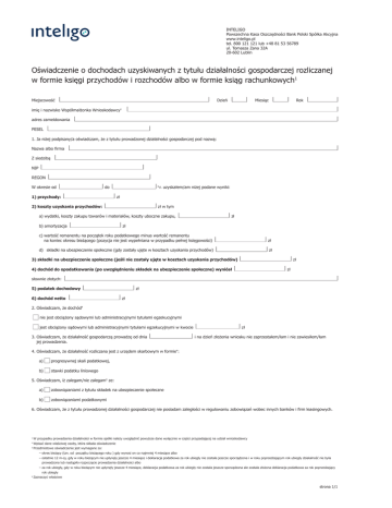 INTELIGO Powszechna Kasa Oszczędności Bank Polski Spółka Akcyjna www.inteligo.pl tel. 800 121 121 lub +48 81 53 56789 ul. Tomasza Zana 32A 20-602 Lublin Oświadczenie o dochodach uzyskiwanych z tytułu działalności gospodarczej rozliczanej w formie księgi przychodów i rozchodów albo w formie ksiąg rachunkowych1 Miejscowość Dzień imię i nazwisko Współmałżonka Wnioskodawcy Miesiąc Rok 1 adres zameldowania PESEL 1. Ja niżej podpisany/a oświadczam, że z tytułu prowadzonej działalności gospodarczej pod nazwą: Nazwa albo firma Z siedzibą NIP REGON W okresie od do 1) przychody: 3 r. uzyskałem/am niżej podane wyniki: zł 2) koszty uzyskania przychodów: zł w tym a) wydatki, koszty zakupu towarów i materiałów, koszty uboczne zakupu, b) amortyzacja zł zł c) wartość remanentu na początek roku podatkowego minus wartość remanentu na koniec okresu bieżącego (pozycja nie jest wypełniana w przypadku pełnej księgowości) zł d) składki na ubezpieczenie społeczne (gdy zostały ujęte w kosztach uzyskania przychodów) zł 3) składki na ubezpieczenie społeczne (jeśli nie zostały ujęte w kosztach uzyskania przychodów) zł 4) dochód do opodatkowania (po uwzględnieniu składek na ubezpieczenie społeczne) wyniósł zł słownie złotych: 5) podatek dochodowy zł 6) dochód netto zł 2. Oświadczam, że dochód 4 nie jest obciążony sądowymi lub administracyjnymi tytułami egzekucyjnymi jest obciążony sądowymi lub administracyjnymi tytułami egzekucyjnymi w kwocie 3. Oświadczam, że działalność gospodarczą prowadzę od dnia jej prowadzenia. zł i na dzień złożenia wniosku nie zaprzestałem/łam i nie zawiesiłem/łam 4. Oświadczam, że działalność rozliczana jest z urzędem skarbowym w formie4: a) progresywnej skali podatkowej, b) stawki podatku liniowego 5. Oświadczam, iż zalegam/nie zalegam4 ze: a) zobowiązaniami z tytułu składek na ubezpieczenie społeczne b) zobowiązaniami podatkowymi 6. Oświadczam, że z tytułu prowadzonej działalności gospodarczej nie posiadam zaległości w regulowaniu zobowiązań wobec innych banków i firm leasingowych. 1 W przypadku prowadzenia działalności w formie spółki należy uwzględnić powyższe dane wyłącznie w części przypadającej na udział wnioskodawcy 2 Wpisać dane właściwej osoby, która składa oświadczenie 3 Przedmiotowe oświadczenie jest wymagane za: – okres bieżący (tzn. od początku bieżącego roku ) gdy wynosi on co najmniej 4 miesiące albo – ostatnie 12 m-cy, gdy w roku bieżącym nie upłynęły jeszcze 4 miesiące i deklaracja podatkowa za rok ubiegły nie została jeszcze sporządzona i w roku poprzedzającym rok ubiegły działalność nie była prowadzona lub nastąpiło rozpoczęcie prowadzenia działalności albo – za rok ubiegły, gdy w roku bieżącym nie upłynęły jeszcze 4 miesiące, deklaracja podatkowa za rok ubiegły nie została jeszcze sporządzona ale została złożona deklaracja podatkowa za rok poprzedzający rok ubiegły 4 Zaznaczyć właściwe strona 1/1 7. Oświadczam, że w roku ubiegłym i/lub4 roku bieżącym a) korzystałem/korzystam4 z ulg w opłacaniu składek na ubezpieczenie społeczne. b) nie korzystałem/nie korzystam4 z ulg w opłacaniu składek na ubezpieczenie społeczne. Wiarygodność powyższych danych stwierdzam własnoręcznym podpisem pod rygorem odpowiedzialności karnej z art. 297 Ustawy z dnia 6 czerwca 1997 r. Kodeks karny (Dz. U. Nr 88, poz. 553 z późn. zm.). Oświadczam jednocześnie, że informacje zawarte w przedstawionych przeze mnie dokumentach są zgodne ze stanem faktycznym i prawnym. Upoważniam PKO BP SA do weryfikacji danych zawartych w niniejszym oświadczeniu. Przyjmuję do wiadomości, że oświadczenie wypełnione niewłaściwie, niekompletnie lub nieczytelnie nie będzie honorowane. Niniejsze oświadczenie zachowuje swoją ważność przez okres 30 dni od daty wystawienia. Podpis Współmałżonka Wnioskodawcy5 Pieczątka i podpis osoby odpowiedzialnej za prowadzenie księgowości6 5 Podpis osoby, której dotyczy oświadczenie 6 W przypadku przedsiębiorcy prowadzącego ewidencję w formie pełnej księgowości oświadczenie powinno dodatkowo zostać podpisane przez osobę odpowiedzialną za prowadzenie księgowości (np.: główną księgową, dyrektora finansowego) strona 2/2