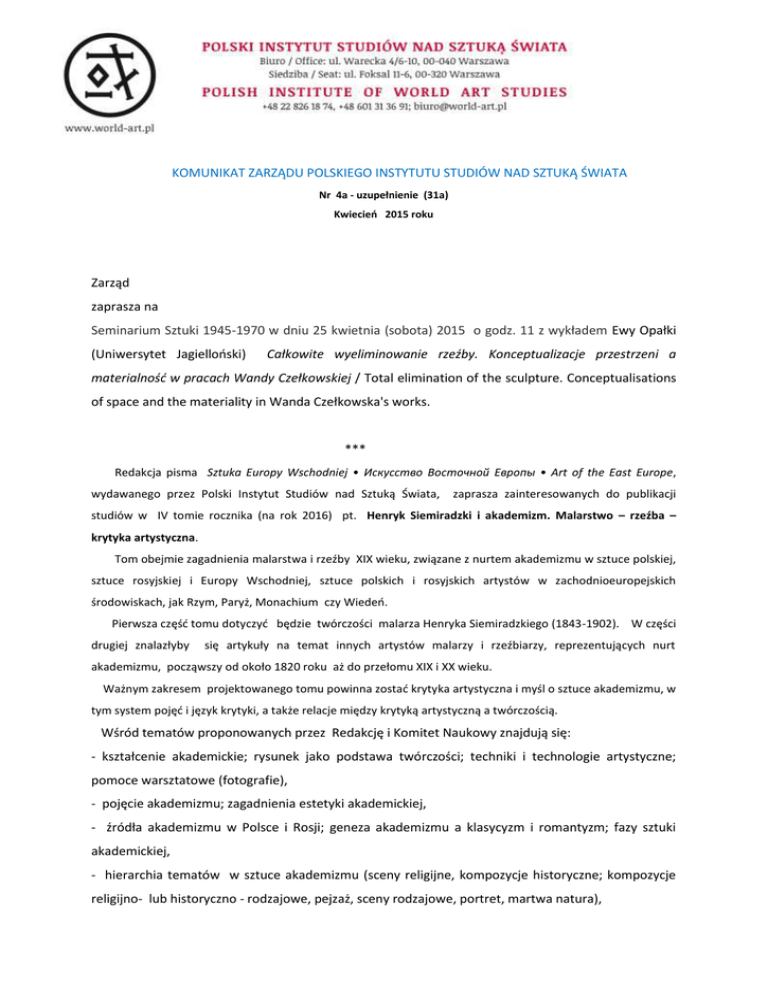 KOMUNIKAT ZARZĄDU POLSKIEGO INSTYTUTU STUDIÓW NAD SZTUKĄ ŚWIATA Nr 4a - uzupełnienie (31a) Kwiecień 2015 roku Zarząd zaprasza na Seminarium Sztuki 1945-1970 w dniu 25 kwietnia (sobota) 2015 o godz. 11 z wykładem Ewy Opałki (Uniwersytet Jagielloński) Całkowite wyeliminowanie rzeźby. Konceptualizacje przestrzeni a materialność w pracach Wandy Czełkowskiej / Total elimination of the sculpture. Conceptualisations of space and the materiality in Wanda Czełkowska's works. *** Redakcja pisma Sztuka Europy Wschodniej • Искусство Восточной Европы • Art of the East Europe, wydawanego przez Polski Instytut Studiów nad Sztuką Świata, zaprasza zainteresowanych do publikacji studiów w IV tomie rocznika (na rok 2016) pt. Henryk Siemiradzki i akademizm. Malarstwo – rzeźba – krytyka artystyczna. Tom obejmie zagadnienia malarstwa i rzeźby XIX wieku, związane z nurtem akademizmu w sztuce polskiej, sztuce rosyjskiej i Europy Wschodniej, sztuce polskich i rosyjskich artystów w zachodnioeuropejskich środowiskach, jak Rzym, Paryż, Monachium czy Wiedeń. Pierwsza część tomu dotyczyć będzie twórczości malarza Henryka Siemiradzkiego (1843-1902). W części drugiej znalazłyby się artykuły na temat innych artystów malarzy i rzeźbiarzy, reprezentujących nurt akademizmu, począwszy od około 1820 roku aż do przełomu XIX i XX wieku. Ważnym zakresem projektowanego tomu powinna zostać krytyka artystyczna i myśl o sztuce akademizmu, w tym system pojęć i język krytyki, a także relacje między krytyką artystyczną a twórczością. Wśród tematów proponowanych przez Redakcję i Komitet Naukowy znajdują się: - kształcenie akademickie; rysunek jako podstawa twórczości; techniki i technologie artystyczne; pomoce warsztatowe (fotografie), - pojęcie akademizmu; zagadnienia estetyki akademickiej, - źródła akademizmu w Polsce i Rosji; geneza akademizmu a klasycyzm i romantyzm; fazy sztuki akademickiej, - hierarchia tematów w sztuce akademizmu (sceny religijne, kompozycje historyczne; kompozycje religijno- lub historyczno - rodzajowe, pejzaż, sceny rodzajowe, portret, martwa natura), - inspiracje ideowe; treści dzieła sztuki; alegoria i symbol; wartości symboliczne, kosmopolityzm i patriotyzm; mit „złotego wieku”; synkretyzm kulturowy, - źródła ikonograficzne, historyczne i literackie do twórczości i interpretacji dzieł malarskich (Biblia, dzieła literackie, prace naukowe, studia oryginalnych motywów i zabytków), - akademizm a humanistyka XIX wieku (Hippolyte Taine, Ernest Renan; Ludwig Feuerbach, Karl Rosenkranz, Wilhelm Dilthey; Henryk Struve); koncepcje ujęcia procesu historycznego, - wizualna rekonstrukcja antyku, średniowiecza, świata Orientu, prehistorii; „cytaty” ze sztuki m.in. starożytnej, wczesnochrześcijańskiej, orientalnej, - proces twórczy; inspiracje formalne; styl, kompozycja i konwencje artystyczne dzieła; szkice, warianty, kopie autorskie; cykle, - ekspresja artystyczna; stylizacja malarska; idealizacja i elementy brzydoty; realność i fantastyka; malowniczość i dekoracyjność, - sztuka a etyka; oddziaływanie moralne na odbiorcę; interpretacje postaci Jezusa Chrystusa (Chrystus - Żyd, Chrystus - rewolucjonista), - hedonizm; miłość i perwersja seksualna; immoralizm; dekadentyzm i zapowiedzi upadku cywilizacji w akademizmie, - akademizm polski i rosyjski a sztuka akademicka Europy Zachodniej - inspiracje i relacje, - akademizm a realizm i naturalizm; nastrojowość i spirytualizm; związki genetyczne symbolizmu z akademizmem, - krytyka artystyczna wobec akademizmu; krytyka jako źródło nowych interpretacji, - recepcja społeczna sztuki akademickiej; salony i życie artystyczne; instytucje sztuki, - interpretacja polityczno-ideologiczna twórczości akademickiej; nacjonalizm, rasizm i imperializm (np. w przedstawieniach Rzymu), - krytyczna analiza znaczeń nadbudowanych nad dziełami akademizmu od XIX wieku do dziś; współczesny kontekst komunikacyjny twórczości akademickiej XIX wieku. Objętość około 10 stron znormalizowanego tekstu (około 18 000 znaków ze spacjami i przypisami na stronę) oraz 5 ilustracji. W przypadku większej ilości tekstu lub ilustracji Redakcja prosi o wcześniejszy kontakt. Języki publikacji: polski lub rosyjski (ze streszczeniem w języku angielskim); dla autorów z innych środowisk język angielski. Dokładne informacje dla autorów, a także spisy treści poprzednich tomów, na stronie: www.world-art.pl / publikacje / czasopisma i serie wydawnicze / Sztuka Europy Wschodniej • Искусство Восточной Европы • Art of the East Europe. Redakcja prosi o przesyłanie zgłoszeń - tytułów artykułów i krótkich informacje o nich do 30 maja 2015 roku do sekretarza naukowego pisma Iriny Gavrash [email protected] lub za pośrednictwem strony internetowej Polskiego Instytutu Studiów nad Sztuką Świata [email protected]. Po akceptacji przez Redakcję i Komitet Naukowy artykuły przyjmowane będą do druku do 31 lipca 2015 roku. *** Zarząd Instytutu zaprasza zainteresowanych do publikacji w II tomie studiów The art of the Islamic world and the artistic relationships between Poland and Islamic countries. In the 600th anniversary of the establishment of diplomatic relations between Poland and Turkey In 1414, który ukaże się w 2016 roku w prowadzonej przez Instytut serii wydawniczej Conferences and Studies on the Polish Institute of World Art Studies (vol. XIX). Objętość około 10 stron znormalizowanego tekstu (około 18 000 znaków ze spacjami i przypisami na stronę) oraz 5 ilustracji. W przypadku większej ilości tekstu lub ilustracji Redakcja prosi o wcześniejszy kontakt. Język publikacji angielski. Dokładne informacje dla autorów, a także spisy treści poprzednich tomów, na stronie: www.world-art.pl / publikacje / czasopisma i serie wydawnicze / Conferences and Studies. Redakcja prosi o przesyłanie zgłoszeń - 