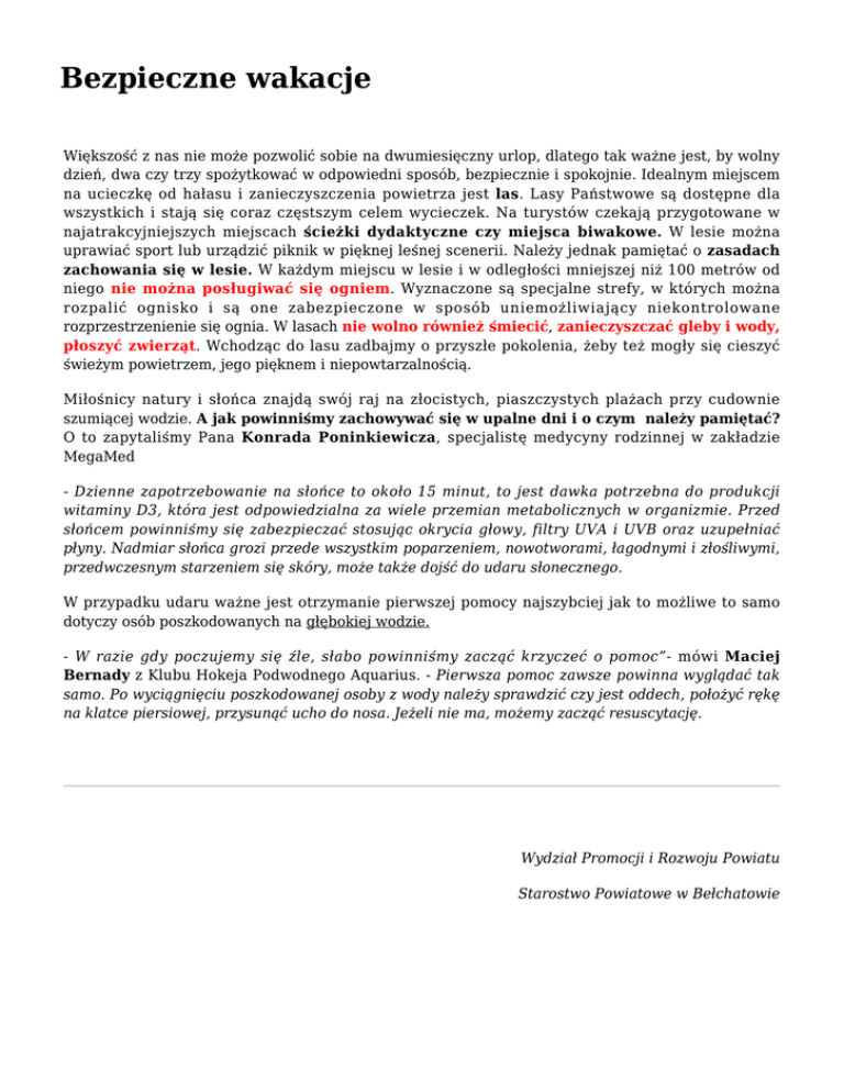 Bezpieczne wakacje Większość z nas nie może pozwolić sobie na dwumiesięczny urlop, dlatego tak ważne jest, by wolny dzień, dwa czy trzy spożytkować w odpowiedni sposób, bezpiecznie i spokojnie. Idealnym miejscem na ucieczkę od hałasu i zanieczyszczenia powietrza jest las. Lasy Państwowe są dostępne dla wszystkich i stają się coraz częstszym celem wycieczek. Na turystów czekają przygotowane w najatrakcyjniejszych miejscach ścieżki dydaktyczne czy miejsca biwakowe. W lesie można uprawiać sport lub urządzić piknik w pięknej leśnej scenerii. Należy jednak pamiętać o zasadach zachowania się w lesie. W każdym miejscu w lesie i w odległości mniejszej niż 100 metrów od niego nie można posługiwać się ogniem. Wyznaczone są specjalne strefy, w których można rozpalić ognisko i są one zabezpieczone w sposób uniemożliwiający niekontrolowane rozprzestrzenienie się ognia. W lasach nie wolno również śmiecić, zanieczyszczać gleby i wody, płoszyć zwierząt. Wchodząc do lasu zadbajmy o przyszłe pokolenia, żeby też mogły się cieszyć świeżym powietrzem, jego pięknem i niepowtarzalnością. Miłośnicy natury i słońca znajdą swój raj na złocistych, piaszczystych plażach przy cudownie szumiącej wodzie. A jak powinniśmy zachowywać się w upalne dni i o czym należy pamiętać? O to zapytaliśmy Pana Konrada Poninkiewicza, specjalistę medycyny rodzinnej w zakładzie MegaMed - Dzienne zapotrzebowanie na słońce to około 15 minut, to jest dawka potrzebna do produkcji witaminy D3, która jest odpowiedzialna za wiele przemian metabolicznych w organizmie. Przed słońcem powinniśmy się zabezpieczać stosując okrycia głowy, filtry UVA i UVB oraz uzupełniać płyny. Nadmiar słońca grozi przede wszystkim poparzeniem, nowotworami, łagodnymi i złośliwymi, przedwczesnym starzeniem się skóry, może także dojść do udaru słonecznego. W przypadku udaru ważne jest otrzymanie pierwszej pomocy najszybciej jak to możliwe to samo dotyczy osób poszkodowanych na głębokiej wodzie. - W razie gdy poczujemy się źle, słabo powinniśmy zacząć krzyczeć o pomoc”- mówi Maciej Bernady z Klubu Hokeja Podwodnego Aquarius. - Pierwsza pomoc zawsze powinna wyglądać tak samo. Po wyciągnięciu poszkodowanej osoby z wody należy sprawdzić czy jest oddech, położyć rękę na klatce piersiowej, przysunąć ucho do nosa. Jeżeli nie ma, możemy zacząć resuscytację. Wydział Promocji i Rozwoju Powiatu Starostwo Powiatowe w Bełchatowie