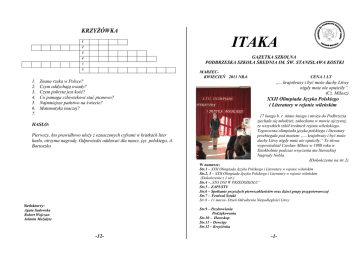 KRZYŻÓWKA ITAKA 1 2 3 GAZETKA SZKOLNA PODBRZESKA SZKOŁA ŚREDNIA IM. ŚW. STANISŁAWA KOSTKI 4 5 6 1. 2. 3. 4. 5. 6. 7. MARZECKWIECIEŃ 2011 NR.6 Znana rzeka w Polsce? Czym oddychają owady? Czym pokryta jest kość? Co pomaga człowiekowi stać pionowo? Najmniejsze państwo na świecie? Matematyka inaczej? CENA 1 LT „... krajobrazy i być może duchy Litwy nigdy mnie nie opuściły”. (Cz. Miłosz) XXII Olimpiada Języka Polskiego i Literatury w rejonie wileńskim 17 lutego b. r. mimo śniegu i mrozu do Podbrzezia zjechała się młodzież, zakochana w mowie ojczystej, ze wszystkich szkół średnich rejonu wileńskiego. Tegoroczna olimpiada języka polskiego i literatury przebiegała pod mottem: „... krajobrazy i być może duchy Litwy nigdy mnie nie opuściły.” Te słowa wypowiedział Czesław Miłosz w 1980 roku w Sztokholmie podczas wręczenia mu literackiej Nagrody Nobla. (Dokończenie na str.2) HASŁO: Pierwszy, kto prawidłowo ułoży z oznaczonych cyframi w kratkach liter hasło, otrzyma nagrodę. Odpowiedzi oddawać dla naucz. jęz. polskiego, A. Bartoszko W numerze: Str.1 – XXII Olimpiada Języka Polskiego i Literatury w rejonie wileńskim Str.2, 3 – XXII Olimpiada Języka Polskiego i Literatury w rejonie wileńskim (Dokończenie z 1 str.) Str.4 –„STO DNI W PRZEDSZKOLU” Str.5 – ZAPUSTY Str.6 – Spotkanie przyszłych pierwszoklasistów oraz dzieci grupy przygotowawczej Str.7 – Festiwal Sztuki Str.8 – 11 marca- Dzień Odrodzenia Niepodległości Litwy Redaktorzy: Agata Sadowska Robert Wojczan Jolanta Mażulyte Str.9 – Pozdrowienia Podziękowania Str.10 – Horoskop Str.11 – Dowcipy Str.12 – Krzyżówka -12- -1- (Dokończenie ze str. 1) Na uroczyste otwarcie olimpiady przybyły mer rejonu wileńskiego, pani Maria Rekść, kierownik Wydziału Oświaty rejonu wileńskiego, pani Lilia Andruszkiewicz, wieloletnia pracowniczka Ministerstwa, organizatorka olimpiad języka polskiego i literatury, pani Barbara Kosinskienė, wykładowczyni Uniwersytetu Pedagogicznego, doktor Halina Turkiewicz oraz starszy specjalista Wydziału Oświaty, pani Nijola Ragucka. Po króciutkim programie artystycznym i ciepłym przywitaniu słowa udzielono przewodniczącemu komisji oceniającej, panu Wiktorowi Kirkiewiczowi, który otworzył koperty i przeczytał tematy prac pisemnych. Każdy z uczestników mógł wykazać się swoimi zdolnościami twórczymi oraz przelać na papier nie tylko swoje myśli, ale także swoje uczucia i emocje. Po napisaniu interpretacji uczestnicy otrzymali dwustronicowy test, który wymagał od ucznia znajomości praktycznego użycia języka. Nauczycielki, które przybyły wraz ze swoimi uczniami do Podbrzeskiej Szkoły Średniej im. św. Stanisława Kostki miały zaszczyt wysłuchać wykład o Czesławie Miłoszu pani Haliny Turkiewicz. W drugim dniu olimpiady młodzież wypowiadała się na zawczasu wybrane tematy z zakresu literatury i językoznawstwa. Po trudnej pracy nadszedł czas na odpoczynek. Wszyscy uczestnicy, nauczyciele i gości mogli obejrzeć program artystyczny „Spacer po Wilnie”, przyszykowany przez uczniów klas 10 i 12 Podbrzeskiej Szkoły Średniej im. św. Stanisława Kostki pod kierownictwem nauczycieli języka polskiego, muzyki i plastyki. W tym czasie komisja oceniająca na czele z panem przewodniczącym podsumowywała wyniki. Po wyłonieniu najlepszych wszyscy uczestnicy otrzymali podziękowania i prezenty, a dwunastka najlepszych została uhonorowana dyplomami. Dowcipy Ksiądz jedzie do chorego. Zatrzymuje go policjant: - Bez świateł! Mandat 50 złotych. - Synu, jadę do chorego z Panem Bogiem... - Co?! We dwóch na rowerze?! 100 złotych... Ksiądz płaci, odjeżdża i myśli: „Jakie to szczęście, że nie wiedział, że Bóg jest w trzech osobach”. * * * Policjant zatrzymuje pijanego kierowcę: - Dmuchnij pan!!! - A gdzie boli? * * * - Jak byłeś mały, czy tata bił cię, gdy byłeś niegrzeczny? - Tak. - A tato dziadka też go bił?- dopytuje się dalej Jasio. - Tak, ale dlaczego pytasz? - Bo chciałbym w końcu wiedzieć, kto zaczął! * * * Do sypialni wpada mąż i woła do leżącej w łóżku żony: - Ubieraj się szybko! Pożar!!! Z szafy przerażony męski głos: - Meble! Ratujcie meble! Dowcipy dobrała Grażyna Baczul, 6c -2- -11- Horoskop RYBY – 19 lutego-20 marca Rybami będą miotać różne emocje ukierunkowane głównie na osoby z bliskiego otoczenia. Nie będą zauważać, ze wywracają wszystko do góry nogami. Będą szukać winnych wokół siebie, podczas gdy same będą winne. Będą musiały do połowy roku zapanować nad sobą, bo w przeciwnym razie mogą zepsuć to ,na czym im najbardziej zależy. W finansach będą musiały walczyć o wszystko i będą musiały się upominać o swoje. W pracy powinny zadbać o dobrą komunikację i rzetelne informacje. Należy uważać, kto najbardziej będzie pochlebiać, gdyż ta osoba może narobić najwięcej problemów. W rodzinie wszystko idzie w dobrą stronę. W sytuacjach trudnych można będzie na rodzinie polegać. W miłości Ryby powinny zadbać o utrzymanie tego, co posiadają. Zmiany pod wpływem impulsu mogą okazać się dużym błędem. Los będzie wymagać od Ryb jasnych i przemyślanych ruchów. BARAN - 21 marzec-20 kwietnia Do tej dwunastki weszli: Jelena Kudelina- Szkoła Średnia im. Stanisława Moniuszki w Kowalczukach (nauczycielka Regina Jaświn), Dorota Jodko- Szkoła Średnia im. ks. Józefa Obrembskiego w Mejszagole (nauczycielka Walentyna Tomaszun), Agnieszka Malinauskaitė- Szkoła Średnia w Zujunach (nauczycielka Irena Bortkiewicz), Faustyna Sipowicz- Gimnazjum im. Ferdynanda Ruszczyca w Rudominie (nauczycielka Ilona Herman), Inesa Czajkowska- Szkoła Średnia im. św. Jana Bosko w Jałówce (nauczycielka Krystyna Dejnarowicz), Iwona Jarmolovičiūtė- Szkoła Średnia w Rukojniach (nauczycielka Regina Iwaszko), Karolina Banel- Szkoła Średnia w Ławaryszkach (nauczycielka Anna Burbo), Agata Szuszkiewicz- Szkoła 