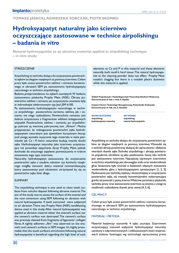 Implantoprotetyka 2009, tom X, nr 4 (37) TOMASZ Janicki, AGNIESZKA Sobczak, PIOTR Skomro Hydroksyapatyt naturalny jako ścierniwo oczyszczające zastosowane w technice airpolishingu – badania in vitro Natural hydroxyapatite as an abrasive material applied in airpolishing technique – in vitro study Streszczenie Airpolishing to technika służąca do oczyszczania powierzchni zębów ze złogów nazębnych za pomocą ścierniwa. Celem pracy była ocena powierzchni szkliwa i cementu korzeniowego w obrazach SEM po zastosowaniu hydroksyapatytu naturalnego w technice airpolishingu. Badania przeprowadzono na zębach usuniętych. W badaniu zastosowano piaskarkę Prophy Mate (NSK). Obrazy powierzchni szkliwa i cementu po oczyszczeniu oceniane były w mikroskopie elektronowym typ Jeol JSM 6100. Po zastosowaniu hydroksyapatytu naturalnego w technice airpolishingu powierzchnia zarówno szkliwa, jak i cementu nie ulega uszkodzeniu. Powierzchnia cementu jest dobrze oczyszczona z fragmentów włókien kolagenowych więzadeł. Powierzchnie szkliwa i cementu po airpolishingu pokryte są warstwą pokrywową tzw. „filmem”. Można przypuszczać, że wzbogacenie powierzchni zęba hydroksyapatytem naturalnym jest zjawiskiem korzystnym biorąc pod uwagę wysokie wysycenie tego materiału w takie pierwiastki jak Ca i P, które naturalnie budują twarde tkanki zęba. Hydroksyapatyt naturalny jako ścierniwo oczyszczające nie powoduje zapychania dyszy Prophy Mate, jednak dochodzi do znacznego zapylenia pomieszczenia w trakcie stosowania tego typu ścierniwa. Naturalny hydroksyapatyt zastosowany do oczyszczania powierzchni zęba z osadów, nalotów czy kamienia nazębnego mógłby stanowić dobry materiał remineralizacyjny, który zastosowany pod ciśnieniem utrzymywał by się na powierzchni zęba dość długo. - - - - - Summary The airpolishing technique is one used to clean teeth surfaces from calculus deposit following abrasive material. The aim of the study was to assess the surface of the enamel and the root cementum using SEM following air abrasion with natural hydroxyapatite. 4 teeth extracted were subjected to air abrasion. There was Prophy Mate (NSK) sandblasting device used in this study. After natural hydroxyapatite was applied as abrasive material either the enamel’s surface nor the cement’s surface was destroyed. The cement’s surface was precisely cleaned from fragments of ligaments’ collagen fibres. A tightly adherent „film” was observed on the enamel’s and cement’s surfaces in SEM images. It’s highly presumable that the tooth surface’s enrichment following natural hydroxyapatite is beneficial regarding the high level of such 30 elements as Ca and P in this material and these elements naturally built tooth’s hard tissue. The natural hydroxyapatite as the cleaning powder does not effect Prophy Mate nozzle’s clogging but there is a notable place’s dustiness while this material is applied. Zakład Propedeutyki i Fizykodiagnostyki Pomorskiej Akademii Medycznej Kierownik: prof. dr hab. n med. K. Opalko Instytut Chemii i Technologii Nieorganicznej, Politechnika Krakowska Kierownik: prof. dr hab. inż. Z. Kowalski Słowa kluczowe airpolishing, hydroksyapatyt naturalny Key words airpolishing, natural hydroxyapatite Airpolishing to technika służąca do oczyszczania powierzchni zębów ze złogów nazębnych za pomocą ścierniwa. Wywodzi się z techniki abrazji powietrznej służącej do opracowania i żłobienia twardych tkanek zęba. Technika airpolishingu i abrazja powietrzna popularnie określane są jako piaskowanie. Istotą obu technik jest zastosowane ścierniwo. Najczęściej używanym ścierniwem w technice airpolishingu jest dwuwęglan sodu oraz wodorotlenek glinu. Stosowana była również w badaniach własnych mieszanina wodorotlenku glinu z hydroksyapatytem syntetycznym [1, 2, 3]. Piaskowanie jest techniką szybszą i skuteczniejszą w oczyszczaniu powierzchni zęba, niż metody konwencjonalne wykorzystujące gumki, szczoteczki z pastą ścierna.Właściwe parametry piaskarek, technika pracy oraz zastosowane ścierniwo są istotne, z uwagi na możliwość uszkodzenia tkanek jamy ustnej [4, 5, 6]. Cel pracy Celem pracy była ocena powierzchni szkliwa i cementu korzeniowego w obrazach SEM po zastosowaniu hydroksyapatytu naturalnego w technice airpolishingu. Materiał i metoda Materiał badawczy stanowiły 4 zęby usunięte. Ścierniwem oczyszczający stanowił wyłącznie hydroksyapatyt naturalny uzyskany z odproteinowanych i odtłuszczonych kości wieprzowych (szlamu kostnego) wg technologii opracowanej przez - - - - - 2009, tom X, nr 4 (37) Implantoprotetyka Ryc.1. Obraz SEM hydroksyapatytu naturalnego w powiększeniu 2000x. Ryc. 4. Obraz SEM cementu zęba przed airpolishingiem w powiększeniu 100x. Ryc. 2. Punktowe widmo EDS hydroksyapatytu naturalnego. Ryc. 5. Obraz SEM szkliwa zęba po airpolishingu w powiększeniu 100x. Ryc. 3. Obraz SEM szkliwa przed airpolishingiem w powiększeniu 100x. Ryc. 6. Obraz SEM cementu zęba po airpolishingu w powiększeniu 100x. Instytut Chemii i Technologii Nieorganicznej Politechniki Krakowskiej. Materiał poddano procesowi dwuetapowej kalcynacji w temperaturach 600°C i 850°C, odpowiednio dla pierwszego i drugiego etapu. Czas przetrzymywania materiału w maksymalnej temperaturze wynosił 2,5 h. Proces kalcynacji przeprowadzono w piecu komorowym w atmosferze powietrza. Do wszystkich badań użyto frakcji sitowej poniżej 0,063 mm. Skład pierwiastkowy próbki hydroksyapatytu naturalnego oceniono metodą mikroanalizy rentgenowskiej EDS. Zawartość fosforu określono metodą dyferencyjno-fotometryczną przy użyciu spektrometru UVVIS Marcel Media po uprzedniej mineralizacji w mieszaninie stężonych kwasów solnego i azotowego. Wapń oznaczono metodą miareczkową wobec wskaźnika mieszanego – kal- ceiny i tymoloftaleiny. Skład fazowy zbadano metodą rentgenograficzną za pomocą Dyfraktometru Philips X’Pert (Philips)
