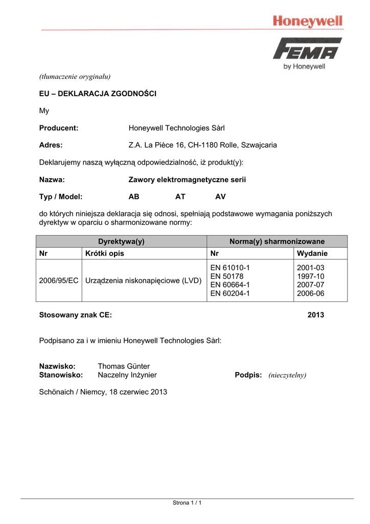 (tłumaczenie oryginału) EU – DEKLARACJA ZGODNOŚCI My Producent: Honeywell Technologies Sàrl Adres: Z.A. La Pièce 16, CH-1180 Rolle, Szwajcaria Deklarujemy naszą wyłączną odpowiedzialność, iż produkt(y): Nazwa: Zawory elektromagnetyczne serii Typ / Model: AB AT AV do których niniejsza deklaracja się odnosi, spełniają podstawowe wymagania poniższych dyrektyw w oparciu o sharmonizowane normy: Dyrektywa(y) Nr Norma(y) sharmonizowane Krótki opis 2006/95/EC Urządzenia niskonapięciowe (LVD) Nr Wydanie EN 61010-1 EN 50178 EN 60664-1 EN 60204-1 2001-03 1997-10 2007-07 2006-06 Stosowany znak CE: 2013 Podpisano za i w imieniu Honeywell Technologies Sàrl: Nazwisko: Stanowisko: Thomas Günter Naczelny Inżynier Podpis: (nieczytelny) Schönaich / Niemcy, 18 czerwiec 2013 Strona 1 / 1
