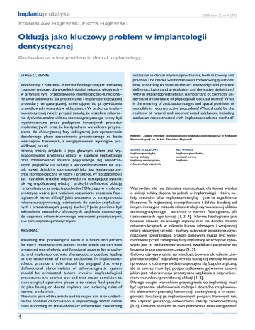Implantoprotetyka 2009, tom X, nr 4 (37) Stanisław Majewski, PIOTR MAJEWSKI Okluzja jako kluczowy problem w implantologii dentystycznej Occlussion as a key problem in dental implantology Streszczenie Wychodząc z założenia, iż norma fizjologiczna jest podstawą i stanowi wzorzec dla wszelkich działań rekonstrukcyjnych – w artykule tym przedstawiono morfologiczno-funkcjonalne uwarunkowania dla protetycznej i implantoprotetycznej procedury terapeutycznej, zmierzającej do przywrócenia prawidłowych warunków okluzyjnych. W praktyce implantoprotetycznej należy przyjąć zasadę, że wszelkie zaburzenia dysfunkcjonalne układu stomatognatycznego winny być wyeliminowane przed podjęciem inwazyjnych procedur implantacyjnych oraz, że kardynalnym warunkiem przystąpienia do chirurgicznej fazy zabiegowej jest opracowanie docelowego planu zaopatrzenia protetycznego na bazie wszczepów filarowych, z uwzględnieniem wymogów prawidłowej okluzji. Istotną treścią artykułu i jego głównym celem jest wyeksponowanie problemu okluzji w aspekcie implantologii oraz zdefiniowanie aparatu pojęciowego wg współczesnych poglądów na okluzję z uprzywilejowaniem na użytek nowej dziedziny stomatologii jaką jest implantoprotetyka stomatologiczna w teorii i praktyce. W szczególności zaś czytelnik znajdzie odpowiedzi na następujące pytania: jak wg współczesnej wiedzy i praktyki definiować okluzję i artykulację oraz pojęcia pochodne? Dlaczego w implantoprotetyce ważne jest właściwe rozumienie znaczenia fizjologicznych norm okluzji? Jakie znaczenie w postępowaniu rekonstrukcyjnym mają odniesienia do stanów artykulacyjnych i przestrzennych pozycji żuchwy? Jakie powinno być odniesienie stosunków okluzyjnych uzębienia naturalnego do uzębienia rekonstruowanego metodami protetycznymi, a w tym implantoprotetycznymi? - - - - - Abstract Assuming that physiological norm is a basics and pattern for every reconstructive action - in the article authors have presented morphologic and functional aspects for prosthetic and implantoprosthetic therapeutic procedure leading to the restoration of normal occlussion. In implantoprosthetic practice a rule should be engaged that every disfunctional abnormalities of sthomatognatic system should be eliminated before invasive implantological procedures are carried out and that major condition to start surgical operative phase is to create final prosthetic plan basing on dental implants and including rules of normal occlussion. The main part of the article and its major aim is to underline the problem of occlussion in implantology and to define rules according to state-of-the-art information concerning 4 occlusion in dental implantoprosthetics, both in theory and practice.The reader will find answers to following questions: how, according to state-of-the-art knowledge and practice define occlusion and articulation and derivative definitions? Why in implantoprosthetics it is implartant ot correctly understand importance of physiolgicall occlusal norms? What is the meaning of articluation satges and spatial positions of mandible in reconstructive procedure? What should be the realition of natural and reconstructed occlusion, including occlusion reconstructed with implantoprosthetic method? Katedra i Zakład Protetyki Stomatologicznej Instytutu Stomatologii UJ w Krakowie Kierownik: prof. zw. dr hab. Stanisław Majewski Słowa kluczowe implantoprotetyka, normy okluzji, implanty dentystyczne, rekonstrukcja uzębienia KEY WORDS implanto-prosthetics, occlusal norms, implants Wprawdzie nie ma dziedziny stomatologii, dla której wiedza o okluzji byłaby zbędna, to jednak w implantologii – którą należy rozumieć jako implantoprotetykę – jest to zagadnienie kluczowe. To najbardziej skomplikowana i daleko bardziej od innych inwazyjna metoda rekonstrukcji czynnościowej układu stomatognatycznego – zarówno w normie fizjologicznej, jak i zaburzeniach jego funkcji [1, 2, 3]. Norma fizjologiczna jest bowiem stanem, do którego dążymy m.in. na drodze działań rekonstrukcyjnych w zakresie łuków zębowych i wzajemnej relacji okluzyjnej szczęki i żuchwy, natomiast zaburzenia czynnościowe towarzyszące brakom zębowym muszą być wyeliminowane przed zabiegową fazą implantacji wszczepów zębowych. Jest to podstawowy warunek kwalifikacji pacjentów do leczenia implantoprotetycznego [1, 3]. Celowo używamy takiej terminologii, bowiem określenie „implantoprotetyka” najtrafniej wyraża istotę tej metody leczenia i procedury, która wprawdzie rozpoczyna się fazą chirurgiczną, ale ta zawsze musi być podporządkowana głównemu celowi, jakim jest rekonstrukcja protetyczna uzębienia z przywróceniem warunków prawidłowej okluzji [1, 2]. Dlatego drugim warunkiem przystąpienia do implantacji musi być uprzednie zdefiniowanie rodzaju i dokładne rozplanowanie elementów przyszłej konstrukcji protetycznej, a w szczególności lokalizacji jej implantowanych podparć filarowych tak, aby uzyskać gwarancję odtworzenia okluzji zrównoważonej [3, 4]. Oznacza to także, że owo planowanie musi uwzględniać - - - - - 2009, tom X, nr 4 (37) sytuację nie tylko w rejonie implantacji, lecz obejmować całość łuków zębowych w szczęce i żuchwie wraz z ich wzajemnymi relacjami przestrzennymi, a w szczególności kontaktami okluzyjnymi. Postępowanie odwrotne, sprowadzające się do implantacji wszczepów tam, gdzie są najlepsze warunki kostne – bez przemyślenia, jakie będzie docelowe rozwiązanie protetyczne – jest karygodnym, a niestety często w praktyce spotykanym błędem. Warto w tym momencie przypomnieć oczywisty fakt: powodem, dla którego pacjent zgłasza się do naszego gabinetu nie jest chęć poddania się zabiegowi „implantacji” (którego efektem jest umieszczenie w kości śrub), lecz uzyskanie estetycznego i sprawnego funkcjonalnie, a przy tym trwałego uzębienia. Warto też pamiętać, że współczesne zaawansowane techni