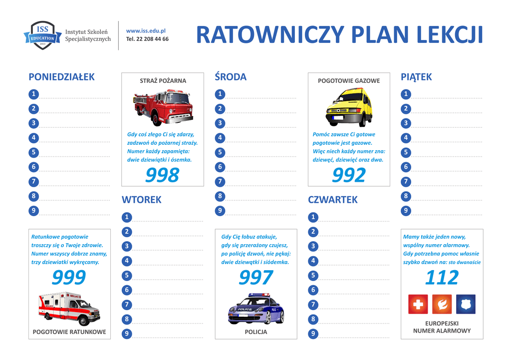 ISS 2013 Instytut Szkoleń Specjalistycznych PONIEDZIAŁEK www.iss.edu.pl Tel. 22 208 44 66 RATOWNICZY PLAN LEKCJI STRAŻ POŻARNA ŚRODA POGOTOWIE GAZOWE PIĄTEK 1 ......................................... 1 ......................................... 1 ......................................... 2 ......................................... 2 ......................................... 2 ......................................... 3 ......................................... 3 ......................................... 3 ......................................... 4 ......................................... 5 ......................................... 6 ......................................... 7 ......................................... 8 ......................................... 9 ......................................... Ratunkowe pogotowie troszczy się o Twoje zdrowie. Numer wszyscy dobrze znamy, trzy dziewiatki wykręcamy. 999 POGOTOWIE RATUNKOWE Gdy coś złego Ci się zdarzy, zadzwoń do pożarnej straży. Numer każdy zapamięta: dwie dziewiątki i ósemka. 998 WTOREK 1 ......................................... 2 ......................................... 3 ......................................... 4 ......................................... 5 ......................................... 6 ......................................... 4 ......................................... 5 ......................................... 6 ......................................... 7 ......................................... 8 ......................................... 9 ......................................... Gdy Cię łobuz atakuje, gdy się przerażony czujesz, po policję dzwoń, nie pękaj: dwie dziewątki i siódemka. 997 Pomóc zawsze Ci gotowe pogotowie jest gazowe. Więc niech każdy numer zna: dziewęć, dziewięć oraz dwa. 992 CZWARTEK 1 ......................................... 2 ......................................... 3 ......................................... 4 ......................................... 5 ......................................... 6 ......................................... 7 ......................................... 7 ......................................... 8 ......................................... 8 ......................................... 9 ......................................... POLICJA 9 ......................................... 4 ......................................... 5 ......................................... 6 ......................................... 7 ......................................... 8 ......................................... 9 ......................................... Mamy także jeden nowy, wspólny numer alarmowy. Gdy potrzebna pomoc własnie szybko dzwoń na: sto dwanaście 112 EUROPEJSKI NUMER ALARMOWY