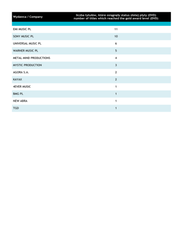 Wydawca / Company liczba tytułów, które osiągnęły status złotej płyty (DVD) number of titles which reached the gold award level (DVD) EMI MUSIC PL 11 SONY MUSIC PL 10 UNIVERSAL MUSIC PL 6 WARNER MUSIC PL 5 METAL MIND PRODUCTIONS 4 MYSTIC PRODUCTION 3 AGORA S.A. 2 KAYAX 2 4EVER MUSIC 1 BMG PL 1 NEW ABRA 1 TGD 1