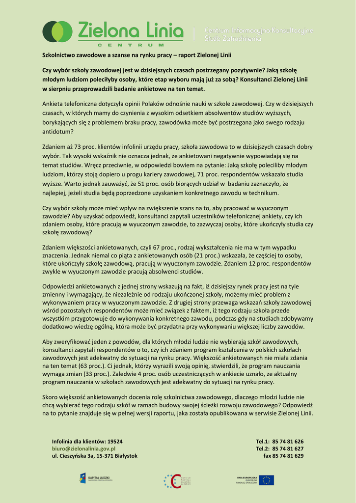 Szkolnictwo zawodowe a szanse na rynku pracy – raport Zielonej Linii Czy wybór szkoły zawodowej jest w dzisiejszych czasach postrzegany pozytywnie? Jaką szkołę młodym ludziom poleciłyby osoby, które etap wyboru mają już za sobą? Konsultanci Zielonej Linii w sierpniu przeprowadzili badanie ankietowe na ten temat. Ankieta telefoniczna dotyczyła opinii Polaków odnośnie nauki w szkole zawodowej. Czy w dzisiejszych czasach, w których mamy do czynienia z wysokim odsetkiem absolwentów studiów wyższych, borykających się z problemem braku pracy, zawodówka może być postrzegana jako swego rodzaju antidotum? Zdaniem aż 73 proc. klientów infolinii urzędu pracy, szkoła zawodowa to w dzisiejszych czasach dobry wybór. Tak wysoki wskaźnik nie oznacza jednak, że ankietowani negatywnie wypowiadają się na temat studiów. Wręcz przeciwnie, w odpowiedzi bowiem na pytanie: Jaką szkołę poleciliby młodym ludziom, którzy stoją dopiero u progu kariery zawodowej, 71 proc. respondentów wskazało studia wyższe. Warto jednak zauważyć, że 51 proc. osób biorących udział w badaniu zaznaczyło, że najlepiej, jeżeli studia będą poprzedzone uzyskaniem konkretnego zawodu w technikum. Czy wybór szkoły może mieć wpływ na zwiększenie szans na to, aby pracować w wyuczonym zawodzie? Aby uzyskać odpowiedź, konsultanci zapytali uczestników telefonicznej ankiety, czy ich zdaniem osoby, które pracują w wyuczonym zawodzie, to zazwyczaj osoby, które ukończyły studia czy szkołę zawodową? Zdaniem większości ankietowanych, czyli 67 proc., rodzaj wykształcenia nie ma w tym wypadku znaczenia. Jednak niemal co piąta z ankietowanych osób (21 proc.) wskazała, że częściej to osoby, które ukończyły szkołę zawodową, pracują w wyuczonym zawodzie. Zdaniem 12 proc. respondentów zwykle w wyuczonym zawodzie pracują absolwenci studiów. Odpowiedzi ankietowanych z jednej strony wskazują na fakt, iż dzisiejszy rynek pracy jest na tyle zmienny i wymagający, że niezależnie od rodzaju ukończonej szkoły, możemy mieć problem z wykonywaniem pracy w wyuczonym zawodzie. Z drugiej strony przewaga wskazań szkoły zawodowej wśród pozostałych respondentów może mieć związek z faktem, iż tego rodzaju szkoła przede wszystkim przygotowuje do wykonywania konkretnego zawodu, podczas gdy na studiach zdobywamy dodatkowo wiedzę ogólną, która może być przydatna przy wykonywaniu większej liczby zawodów. Aby zweryfikować jeden z powodów, dla których młodzi ludzie nie wybierają szkół zawodowych, konsultanci zapytali respondentów o to, czy ich zdaniem program kształcenia w polskich szkołach zawodowych jest adekwatny do sytuacji na rynku pracy. Większość ankietowanych nie miała zdania na ten temat (63 proc.). Ci jednak, którzy wyrazili swoją opinię, stwierdzili, że program nauczania wymaga zmian (33 proc.). Zaledwie 4 proc. osób uczestniczących w ankiecie uznało, ze aktualny program nauczania w szkołach zawodowych jest adekwatny do sytuacji na rynku pracy. Skoro większość ankietowanych docenia rolę szkolnictwa zawodowego, dlaczego młodzi ludzie nie chcą wybierać tego rodzaju szkół w ramach budowy swojej ścieżki rozwoju zawodowego? Odpowiedź na to pytanie znajduje się w pełnej wersji raportu, jaka została opublikowana w serwisie Zielonej Linii. Infolinia dla klientów: 19524 [email protected] ul. Cieszyńska 3a, 15-371 Białystok Tel.1: 85 74 81 626 Tel.2: 85 74 81 627 fax 85 74 81 629 Więcej praktycznych artykułów i najnowszych wiadomości z rynku pracy można znaleźć na: https://www.facebook.com/zielonalinia19524 Joanna Niemyjska (Zielona Linia 19524, Centrum Informacyjno-Konsultacyjne Służb Zatrudnienia) Infolinia dla klientów: 19524 [email protected] ul. Cieszyńska 3a, 15-371 Białystok Tel.1: 85 74 81 626 Tel.2: 85 74 81 627 fax 85 74 81 629