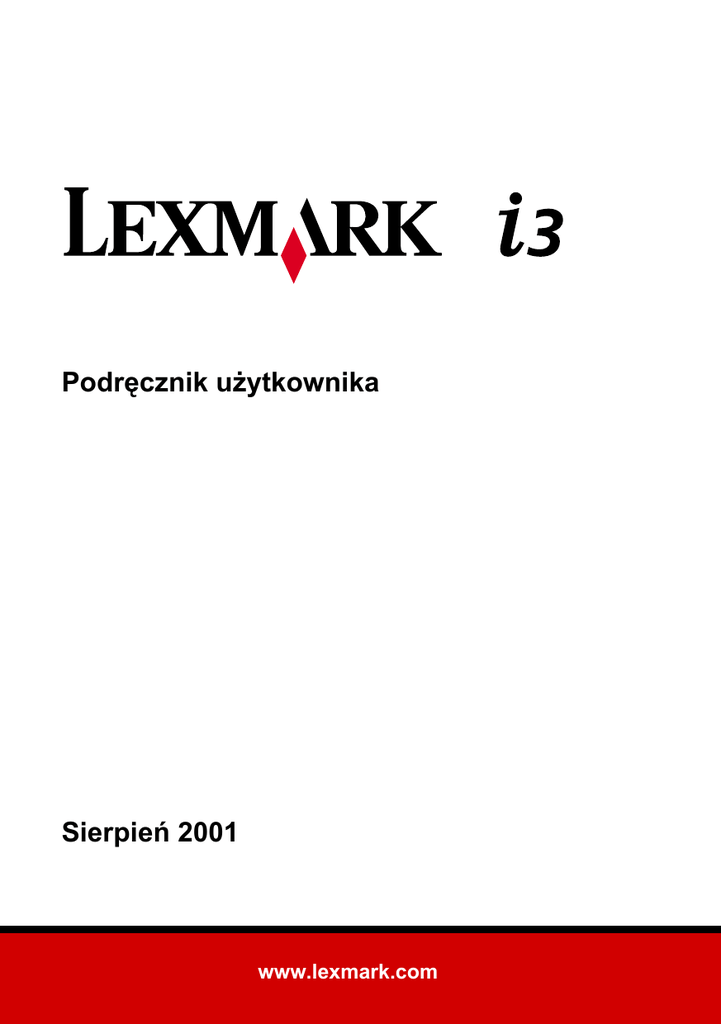 Podręcznik użytkownika Sierpień 2001 www.lexmark.com Wydanie: sierpień 2001 Niniejszy paragraf nie ma zastosowania w krajach, w których takie warunki są niezgodne z lokalnym prawem: FIRMA LEXMARK INTERNATIONAL, INC. DOSTARCZA TĘ PUBLIKACJĘ „W PRZEDSTAWIONEJ POSTACI”, BEZ ŻADNYCH GWARANCJI WYRANYCH LUB DOMNIEMANYCH, WŁĄCZAJĄC W TO RÓWNIEŻ DOMNIEMANE GWARANCJE PRZYDATNOŚCI HANDLOWEJ LUB PRZYDATNOŚCI DO KONKRETNEGO CELU. W niektórych krajach zrzeczenie się wyraźnych lub domniemanych gwarancji w pewnych przypadkach nie jest dozwolone, dlatego niniejsza klauzula nie będzie obowiązywać we wszystkich przypadkach. Niniejsza publikacja może zawierać nieścisłości lub błędy drukarskie. Przedstawione informacje podlegają okresowym zmianom; zmiany te będą uwzględniane w kolejnych wydaniach. Zmiany lub udoskonalenia opisanych produktów lub programów mogą być wprowadzone w dowolnym czasie. Uwagi dotyczące tej publikacji można kierować do firmy Lexmark International, Inc. na adres: Department F95/032-2, 740 West New Circle Road, Lexington, Kentucky 40550, USA. Na terenie Polski uwagi prosimy przesyłać na adres Lexmark, ul. J. Conrada 51, 31-357 Kraków. Firma Lexmark może wykorzystać lub rozpowszechniać każdą informację dostarczoną przez użytkownika w dowolny sposób uznany przez nią za właściwy, nie zaciągając żadnych zobowiązań wobec użytkownika. Dodatkowe egzemplarze publikacji związanych z tym produktem można nabyć w USA, dzwoniąc pod numer telefonu 1-800-553-9727. W innych krajach należy skontaktować się z punktem sprzedaży. Zamieszczone w niniejszej publikacji odniesienia do produktów, programów lub usług nie oznaczają, że producent zamierza je udostępniać we wszystkich krajach, w których prowadzi działalność. Jakiekolwiek odniesienie do produktu, programu lub usługi nie stanowi twierdzenia ani sugestii, że można korzystać tylko z danego produktu, programu lub usługi. Zamiennie można używać dowolnego funkcjonalnego odpowiednika produktu, programu lub usługi, o ile nie narusza to żadnych praw własności intelektualnej. Ocena i testowanie współdziałania z innymi produktami, programami lub usługami, poza wyraźnie wymienionymi przez producenta, odbywa się na odpowiedzialność użytkownika. Lexmark oraz Lexmark ze znakiem diamentu są znakami towarowymi firmy Lexmark International, Inc. zastrzeżonymi w USA i/lub innych krajach. Pozostałe znaki towarowe należą do odpowiednich właścicieli. © Copyright 2001 Lexmark International, Inc. Wszelkie prawa zastrzeżone. UNITED STATES GOVERNMENT RESTRICTED RIGHTS This software and documentation are provided with RESTRICTED RIGHTS. Use, duplication or disclosure by the Government is subject to restrictions as set forth in subparagraph (c)(1)(ii) of the Rights in Technical Data and Computer Software clause at DFARS 252.227-7013 and in applicable FAR provisions: Lexmark International, Inc., Lexington, KY 40550. Przepisy bezpieczeństwa • Należy używać tylko zasilacza dostarczonego wraz z tym produktem lub zatwierdzonego przez firmę Lexmark zasilacza zamiennego. • Kabel zasilający należy podłączyć do łatwo dostępnego gniazda elektrycznego, znajdującego się w pobliżu urządzenia. • Wszelkie naprawy i czynności serwisowe, oprócz opisanych w tym podręczniku, powinny być wykonywane przez wykwalifikowanych pracowników serwisu. Ostrzeżenie: Ostrzeżenie wskazuje sytuację, w której może nastąpić uszkodzenie sprzętu lub oprogramowania drukarki. Spis treści Lexmark i3 ........................................................................ 2 Instalacja .......................................................................... 3 Drukowanie ...................................................................... 9 Przy użyciu podajnika papieru .......................................................9 Przy użyciu szczeliny podawania ręcznego ................................10 Przy użyciu przystawki telewizyjnej .............................................12 Przy użyciu komputera ................................................................12 Konserwacja ................................................................... 14 Instalacja lub wymiana nabojów ..................................................14 Wyrównywanie nabojów przy użyciu komputera .........................16 Czyszczenie dysz naboju ............................................................17 Przechowywanie nabojów ...........................................................18 Wyjmowanie zasilacza ................................................................19 Rozwiązywanie problemów .......................................... 20 Migające lampki ...........................................................................20 Lampki świecące w sposób ciągły ...............................................21 Uzyskiwanie dodatkowych informacji ..........................................22 Dodatek ........................................................................... 23 Uwagi dotyczące emisji elektronicznej ........................................23 ENERGY STAR ...........................................................................26 1 Lexmark i3 1 6 2 7 3 4 8 5 Lampki # Lampka… Zapala się, gdy… 3 lampka zasilania • zostanie naciśnięty przycisk zasilania w celu włączenia drukarki; • zostanie podłączony zasilacz. 4 lampka atramentu kolorowego w naboju z atramentem kolorowym poziom atramentu jest niski. 5 lampka atramentu czarnego w naboju z atramentem czarnym poziom atramentu jest niski. 6 lampka braku papieru • podajnik papieru jest pusty; • podajnik papieru zostanie wyjęty z drukarki. Części drukarki # Część… Służy do wykonywania tej czynności… 1 drzwiczki boczne uzyskiwanie dostępu do zakleszczonego papieru. 2 szczelina podawania ręcznego ładowanie arkusza nośnika specjalnego. 7 podajnik papieru ładowanie stosu zwy