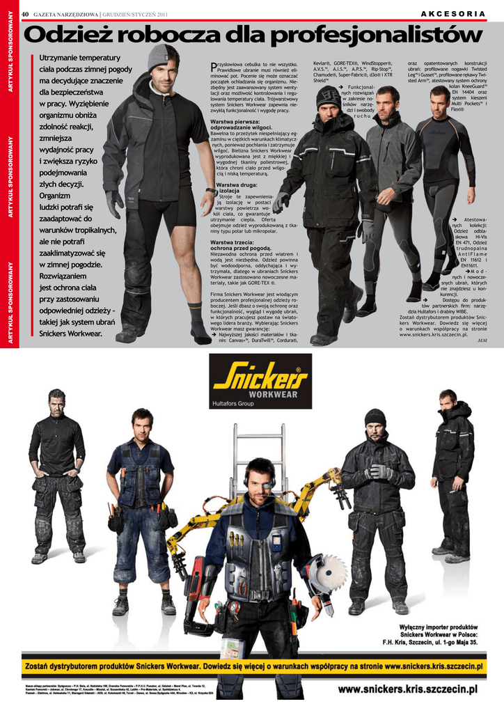 ARTYKUŁ SPONSOROWANY ARTYKUŁ SPONSOROWANY ARTYKUŁ SPONSOROWANY akcesoria 40 GAZETA NARZĘDZIOWA | GRUDZIEŃ/STYCZEŃ 2011 Odzież robocza dla profesjonalistów Utrzymanie temperatury ciała podczas zimnej pogody ma decydujące znaczenie dla bezpieczeństwa w pracy. Wyziębienie organizmu obniża zdolność reakcji, zmniejsza wydajność pracy i zwiększa ryzyko podejmowania złych decyzji. Organizm ludzki potrafi się zaadaptować do warunków tropikalnych, ale nie potrafi zaaklimatyzować się w zimnej pogodzie. Rozwiązaniem jest ochrona ciała przy zastosowaniu odpowiedniej odzieży – takiej jak system ubrań Snickers Workwear. P rzysłowiowa cebulka to nie wszystko. Prawidłowe ubranie musi również eliminować pot. Pocenie się może oznaczać początek ochładzania się organizmu. Niezbędny jest zaawansowany system wentylacji oraz możliwość kontrolowania i regulowania temperatury ciała. Trójwarstwowy system Snickers Workwear zapewnia niezwykłą funkcjonalność i wygodę pracy. Warstwa pierwsza: odprowadzanie wilgoci. Kevlar®, GORE-TEX®, WindStopper®, A.V.S.™, A.I.S.™, A.P.S.™, Rip-Stop™, Chamude®, Super-Fabric®, d3o® i XTR Shield™ ÎÎ Funkcjonalnych rozwiązań w zakresie nośników narzędzi i swobody ruchu oraz opatentowanych konstrukcji ubrań: profilowane nogawki Twisted Leg™ i Gusset™, profilowane rękawy Twisted Arm™, atestowany system ochrony kolan KneeGuard™ EN 14404 oraz system kieszeni Multi Pockets™ i Flexi® Bawełna to przeżytek niespełniający egzaminu w ciężkich warunkach klimatycznych, ponieważ pochłania i zatrzymuje wilgoć. Bielizna Snickers Workwear wyprodukowana jest z miękkiej i wygodnej tkaniny poliestrowej, która chroni ciało przed wilgocią i niską temperaturą. Warstwa druga: izolacja Stroje te zapewnieniają izolację w postaci warstwy powietrza wokół ciała, co gwarantuje utrzymanie ciepła. Oferta obejmuje odzież wyprodukowaną z tkaniny typu polar lub mikropolar. Warstwa trzecia: ochrona przed pogodą. Niezawodna ochrona przed wiatrem i wodą jest niezbędna. Odzież powinna być wodoodporna, oddychająca i wytrzymała, dlatego w ubraniach Snickers Workwear zastosowano nowoczesne materiały, takie jak GORE-TEX ®. Firma Snickers Workwear jest wiodącym producentem profesjonalnej odzieży roboczej. Jeśli dbasz o swoją ochronę oraz funkcjonalność, wygląd i wygodę ubrań, w których pracujesz postaw na światowego lidera branży. Wybierając Snickers Workwear masz gwarancję: ÎÎ Najwyższej jakości materiałów i tkanin: Canvas+™, DuraTwill™, Cordura®, ÎÎ Atestowanych kolekcji: Odzież odblaskowa Hi-Vis EN 471, Odzież tr u dno palna AntiFlame EN 11612 i EN11611. ÎÎM o d nych i nowoczesnych ubrań, których nie znajdziesz u konkurencji. ÎÎ Dostępu do produktów partnerskich firm: narzędzia Hultafors i drabiny WIBE. Zostań dystrybutorem produktów Snickers Workwear. Dowiedz się więcej o warunkach współpracy na stronie www.snickers.kris.szczecin.pl. MM