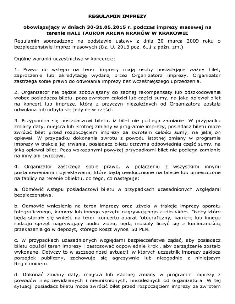 REGULAMIN IMPREZY obowiązujący w dniach 30-31.05.2015 r. podczas imprezy masowej na terenie HALI TAURON ARENA KRAKÓW W KRAKOWIE Regulamin sporządzono na podstawie ustawy z dnia 20 marca 2009 roku o bezpieczeństwie imprez masowych (Dz. U. 2013 poz. 611 z późn. zm.) Ogólne warunki uczestnictwa w koncercie: 1. Prawo do wstępu na teren imprezy mają osoby posiadające ważny bilet, zaproszenie lub akredytację wydaną przez Organizatora imprezy. Organizator zastrzega sobie prawo do odwołania imprezy bez wcześniejszego uprzedzenia. 2. Organizator nie będzie zobowiązany do żadnej rekompensaty lub odszkodowania wobec posiadacza biletu, poza zwrotem całości lub części sumy, na jaką opiewał bilet na koncert lub imprezę, która z przyczyn niezależnych od Organizatora została odwołana lub odbyła się jedynie w części. 3. Przypomina się posiadaczowi biletu, iż bilet nie podlega zamianie. W przypadku zmiany daty, miejsca lub istotnej zmiany w programie imprezy, posiadacz biletu może zwrócić bilet przed rozpoczęciem imprezy za zwrotem całości sumy, na jaką on opiewał. W przypadku dokonania zwrotu z powodu istotnej zmiany w programie imprezy w trakcie jej trwania, posiadacz biletu otrzyma odpowiednią część sumy, na jaką opiewał bilet. Poza wskazanymi powyżej przypadkami bilet nie podlega zamianie na inny ani zwrotowi. 4. Organizator zastrzega sobie prawo, w połączeniu z wszystkimi innymi postanowieniami i dyrektywami, które będą uwidocznione na bilecie lub umieszczone na tablicy na terenie obiektu, do tego, co następuje: a. Odmówić wstępu posiadaczowi biletu w przypadkach uzasadnionych względami bezpieczeństwa. b. Odmówić wniesienia na teren imprezy oraz użycia w trakcje imprezy aparatu fotograficznego, kamery lub innego sprzętu nagrywającego audio-video. Osoby które będą starały się wnieść na teren koncertu aparat fotograficzny, kamerę lub innego rodzaju sprzęt nagrywający audio video, będą musiały liczyć się z koniecznością przekazania go w depozyt, którego koszt wynosi 50 PLN. c. W przypadkach uzasadnionych względami bezpieczeństwa żądać, aby posiadacz biletu opuścił teren imprezy i zastosować odpowiednie kroki, aby zarządzenie zostało wykonane. Dotyczy to w szczególności sytuacji, w których uczestnik imprezy zakłóca porządek publiczny, zachowuje się agresywnie lub niezgodnie z niniejszym Regulaminem. d. Dokonać zmiany daty, miejsca lub istotnej zmiany w programie imprezy z powodów nieprzewidzianych i nieuniknionych, niezależnych od organizatora. W tej sytuacji posiadacz biletu może zwrócić bilet przed rozpoczęciem imprezy za zwrotem całości sumy, na jaką on opiewał. W przypadku dokonania zwrotu z powyższych przyczyn z powodu istotnej zmiany w programie imprezy w trakcie jej trwania, posiadacz biletu otrzyma odpowiednią część sumy, na jaką opiewał bilet. e. Odwołać lub zrezygnować z imprezy z przyczyn niezależnych od Organizatora bez obowiązku rekompensaty lub odszkodowania wobec posiadacza biletu, poza zwrotem całości lub części sumy, na jaką opiewał bilet na koncert lub imprezę, która się nie odbyła lub odbyła się jedynie w części. f. Odmówić wstępu na teren imprezy posiadaczom biletów, u których stwierdzono posiadanie broni, materiałów wybuchowych, wyrobów pirotechnicznych, materiałów pożarowo niebezpiecznych, napojów alkoholowych, środków odurzających lub substancji psychotropowych, napojów w opakowaniach szklanych, plastikowych, kartonowych i metalowych, artykułów spożywczych, noszących buty o metalowych zakończeniach, oraz jakiekolwiek inne przedmioty mogące stanowić zagrożenie. g. W przypadkach uzasadnionych względami bezpieczeństwa, za zgodą posiadacza biletu zamienić jego miejsce siedzące/stojące na inne. Posiadaczowi biletu zwrócona zostanie wówczas różnica w cenie lub, w przypadku nie wyrażenia przez niego zgody na zamianę, kwota, jaką zapłacił on za bilet. h. Posiadacze biletów mogą być narażeni na ciągłe przebywanie w strefie natężenia dźwięków mogących spowodować uszkodzenie słuchu. i. Wnoszenie niedozwolone. wskaźników laserowych oraz alkoholu na teren imprezy jest j. Oficjalne programy i gadżety będą sprzedawane wyłączne na terenie imprezy k. Zakupiony bilet należy traktować jako indywidualną zgodę Organizatora na wejście na koncert, która może być cofnięta w każdej chwili, z przyczyn związanych z koniecznością zachowania zasad bezpieczeństwa. Upoważnia to do otrzymania jedynie zwrotu całości lub części kwoty (ceny) wydrukowanej na bilecie, w zależności od tego, czy zgodę cofnięto przed wejściem na koncert, czy w jego trakcie. Odsprzedaż lub próba odsprzedaży w cenie wyższej niż wydrukowana lub użycie w nieautoryzowanej promocji unieważnia bilet, bez zwrotu należności poniesionej z tytułu jego zakupu. l. Wstęp osób małoletnich do lat 13 na teren imprezy masowej jest możliwy po okazaniu ważnego biletu wstępu i pod opieką opiekunów. m. Bilet jest ważny tylko z kuponem kontrolnym i upoważnia do jednorazowego wejścia na teren koncertu lub imprezy. Nie może być on również używany w akcjach reklamowych i promocyjnych (w tym w konkursach lub loteriach) czy do jakichkolwiek innych celów handlowych. 5. Miejsca nieprzeznaczone dla publiczności to: scena, zaplecze sceny, strefa produkcji, garderoby artystów, pomieszczenia techniczne i administracyjne Hali Tauron Kraków Arena. 6. Kto nie regulaminu porządkowe grzywny nie wykonuje polecenia porządkowego, wydanego na podstawie ustawy, obiektu (terenu) lub regulaminu imprezy masowej przez służby lub służby informacyjne, podlega karze ograniczenia wolności albo niższej niż 2 000 zł. 7.Kto w czasie trwania imprezy masowej przebywa w miejscu nieprzeznaczonym dla publiczności, podlega karze ograniczenia wolności albo grzywny nie niższej niż 2 000 zł. 8. Kto nie wykonuje polecenia wydanego przez P