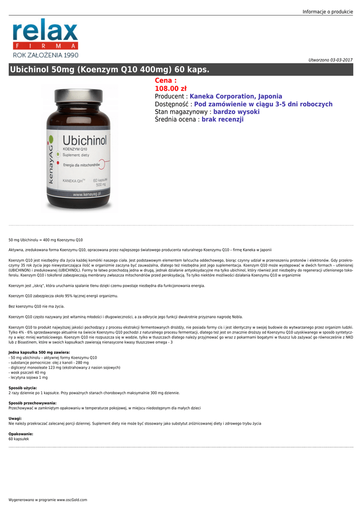 Informacje o produkcie Utworzono 03-03-2017 Ubichinol 50mg (Koenzym Q10 400mg) 60 kaps. Cena : 108.00 zł Producent : Kaneka Corporation, Japonia Dostępność : Pod zamówienie w ciągu 3-5 dni roboczych Stan magazynowy : bardzo wysoki Średnia ocena : brak recenzji 50 mg Ubichinolu = 400 mg Koenzymu Q10 Aktywna, zredukowana forma Koenzymu Q10, opracowana przez najlepszego światowego producenta naturalnego Koenzymu Q10 – firmę Kaneka w Japonii Koenzym Q10 jest niezbędny dla życia każdej komórki naszego ciała. Jest podstawowym elementem łańcucha oddechowego, biorąc czynny udział w przenoszeniu protonów i elektronów. Gdy przekroczymy 35 rok życia jego niewystarczająca ilość w organizmie zaczyna być zauważalna, dlatego też niezbędna jest jego suplementacja. Koenzym Q10 może występować w dwóch formach – utlenionej (UBICHINON) i zredukowanej (UBICHINOL). Formy te łatwo przechodzą jedna w drugą, jednak działanie antyoksydacyjne ma tylko ubichinol, który również jest niezbędny do regeneracji utlenionego tokoferolu. Koenzym Q10 i tokoferol zabezpieczają membrany zwłaszcza mitochondriów przed peroksydacją. To tylko niektóre możliwości działania Koenzymu Q10 w organizmie Koenzym jest „iskrą”, która uruchamia spalanie tlenu dzięki czemu powstaje niezbędna dla funkcjonowania energia. Koenzym Q10 zabezpiecza około 95% łącznej energii organizmu. Bez koenzymu Q10 nie ma życia. Koenzym Q10 często nazywany jest witaminą młodości i długowieczności, a za odkrycie jego funkcji dwukrotnie przyznano nagrodę Nobla. Koenzym Q10 to produkt najwyższej jakości pochodzący z procesu ekstrakcji fermentowanych drożdży, nie posiada formy cis i jest identyczny w swojej budowie do wytwarzanego przez organizm ludzki. Tylko 4% - 6% sprzedawanego aktualnie na świecie Koenzymu Q10 pochodzi z naturalnego procesu fermentacji, dlatego też jest on znacznie droższy od Koenzymu Q10 uzyskiwanego w sposób syntetyczny a więc mniej wartościowego. Koenzym Q10 nie rozpuszcza się w wodzie, tylko w tłuszczach dlatego należy przyjmować go wraz z pokarmami bogatymi w tłuszcz lub zażywać go równocześnie z NKO lub z Bioastinem, które w swoich kapsułkach zawierają nienasycone kwasy tłuszczowe omega - 3 Jedna kapsułka 500 mg zawiera: - 50 mg ubichinolu – aktywnej formy Koenzymu Q10 - substancje pomocnicze: olej z kanoli - 280 mg - digliceryl monooleate 123 mg (ekstrahowany z nasion sojowych) - wosk pszczeli 40 mg - lecytyna sojowa 1 mg Sposób użycia: 2 razy dziennie po 1 kapsułce. Przy poważnych stanach chorobowych maksymalnie 300 mg dziennie. Sposób przechowywania: Przechowywać w zamkniętym opakowaniu w temperaturze pokojowej, w miejscu niedostępnym dla małych dzieci Uwagi: Nie należy przekraczać zalecanej porcji dziennej. Suplement diety nie może być stosowany jako substytut zróżnicowanej diety i zdrowego trybu życia Opakowanie: 60 kapsułek Wygenerowano w programie www.oscGold.com
