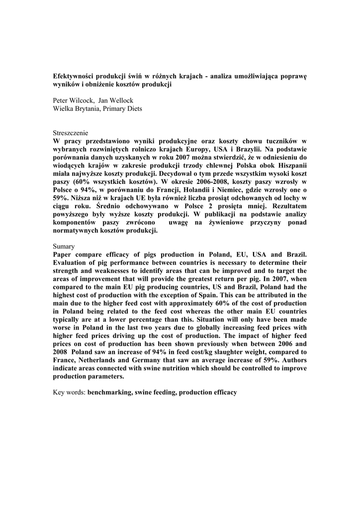 Efektywności produkcji świń w różnych krajach - analiza umożliwiająca poprawę wyników i obniżenie kosztów produkcji Peter Wilcock, Jan Wellock Wielka Brytania, Primary Diets Streszczenie W pracy przedstawiono wyniki produkcyjne oraz koszty chowu tuczników w wybranych rozwiniętych rolniczo krajach Europy, USA i Brazylii. Na podstawie porównania danych uzyskanych w roku 2007 można stwierdzić, że w odniesieniu do wiodących krajów w zakresie produkcji trzody chlewnej Polska obok Hiszpanii miała najwyższe koszty produkcji. Decydował o tym przede wszystkim wysoki koszt paszy (60% wszystkich kosztów). W okresie 2006-2008, koszty paszy wzrosły w Polsce o 94%, w porównaniu do Francji, Holandii i Niemiec, gdzie wzrosły one o 59%. Niższa niż w krajach UE była również liczba prosiąt odchowanych od lochy w ciągu roku. Średnio odchowywano w Polsce 2 prosięta mniej. Rezultatem powyższego były wyższe koszty produkcji. W publikacji na podstawie analizy komponentów paszy zwrócono uwagę na żywieniowe przyczyny ponad normatywnych kosztów produkcji. Sumary Paper compare efficacy of pigs production in Poland, EU, USA and Brazil. Evaluation of pig performance between countries is necessary to determine their strength and weaknesses to identify areas that can be improved and to target the areas of improvement that will provide the greatest return per pig. In 2007, when compared to the main EU pig producing countries, US and Brazil, Poland had the highest cost of production with the exception of Spain. This can be attributed in the main due to the higher feed cost with approximately 60% of the cost of production in Poland being related to the feed cost whereas the other main EU countries typically are at a lower percentage than this. Situation will only have been made worse in Poland in the last two years due to globally increasing feed prices with higher feed prices driving up the cost of production. The impact of higher feed prices on cost of production has been shown previously when between 2006 and 2008 Poland saw an increase of 94% in feed cost/kg slaughter weight, compared to France, Netherlands and Germany that saw an average increase of 59%. Authors indicate areas connected with swine nutrition which should be controlled to improve production parameters. Key words: benchmarking, swine feeding, production efficacy 2 W ostatnim czasie, analizując sytuację na światowym rynku trzody chlewnej, coraz więcej uwagi poświęca się na benchmarking - czyli porównywanie wyników produkcyjnych i kosztów produkcji pomiędzy poszczególnymi krajami. Robi się to po to, by wskazać mocne i słabe strony produkcji i na tej podstawie opracować strategię prowadzącą do poprawy wyników, a zarazem podniesienia opłacalności produkcji w przeliczeniu na zysk jednostkowy. W 2007 roku porównując koszty produkcji w gronie największych i najbardziej znaczących producentów świń na świecie można stwierdzić, że w porównaniu do wiodących krajów z Unii Europejskiej, USA i Brazylii, Polska miała najwyższe koszty produkcji z wyjątkiem Hiszpanii (wykres 1). Wynika to przede wszystkim z wysokiego udziału kosztu paszy w ogólnych kosztach produkcji, które w Polsce wynoszą ok. 60% ogółu kosztów, co oznacza że są one wyższe od ponoszonych w grupie najlepszych państw europejskich, gdzie z reguły są one niższe. (Hoste i Puister, 2008). Rycina 1. Porównanie kosztów produkcji świń w 2007r. Pod tabelą zmienić podpisy: Feed = pasza, Labor = robocizna, Housing utrzymanie pomieszczeń, Capital = odsetki kredytów; Other = inne Dla Polski sytuacja w dwóch kolejnych latach jeszcze bardziej się pogorszyła z powodu globalnie rosnących kosztów paszy, które windowały w górę koszty całkowite. Wpływ wysokich kosztów paszy na ogólne nakłady na produkcję stał się zauważalny w latach 2006 - 2008, kiedy w Polsce koszty paszy w przeliczeniu na kg przyrostu wzrosły o 94%, w porównaniu do Francji, Holandii i Niemiec, gdzie koszty te wzrosły o 59%. (ADHB Meat Services et al 2009). Przede wszystkim jest to skutkiem gorszych wyników produkcyjnych w porównaniu do pozostałych krajów (wykres 2), zwłaszcza w takich parametrach, jak wskaźnik wykorzystania paszy oraz liczba odsadzonych od lochy 2 3 prosiąt. Gorsze wykorzystanie paszy przekłada się na zwiększony jeszcze wpływ na wzrost kosztów produkcji w sytuacji drożejącej jednostki paszy. Analizując wyniki w produkcji prosiąt, liczba prosiąt odsadzonych, a raczej uzyskanych w odchowie 25-kg warchlaków od lat była na niższym poziomie w porównaniu do krajów UE (ponad 2 prosięta od lochy w 2004 r.). To skutkuje jednocześnie mniejszą produkcją mięsa od lochy rocznie w polskich gospodarstwach. Rezultatem tego wszystkie koszty stałe w produkcji świń muszą być rozłożone na mniejszą ilość wyprodukowanego mięsa, czyniąc ją jednocześnie droższą - co obrazują wyniki przedstawione na wykresie 1 (Hoste and Puister, 2008). Rycina 2. Współczynnik wykorzystania paszy na fermie w produkcji świń w wybranych krajach w roku 2007 3.4 3.2 3.21 PL US 2.86 DE 2.9 3.03 FR 2.75 2.6 3 2.8 3.24 3.14 FCR 3 2.4 NL DK ES BR Po części wyższe koszty produkcji w polskich fermach można wytłumaczyć wielkością gospodarstw i efektem skali (ekonomia skali). W porównaniu do rynku europejskiego polskie gospodarstwa produkujące trzodę chlewną są zdecydowanie mniejsze i jest ich jednocześnie znacznie więcej. Trzeba jednak zaznaczyć, że te małe gospodarstwa statystycznie obciążają generalne wyniki dla Polski, ale niekoniecznie muszą znajdować odzwierciedlenie w większych fermach, produkujących w nowoczesnych systemach, których w Polsce nie brakuje. Średnia wielkość stada podstawowego mieści się pomiędzy 25 a 50 loch i wynika przede wszystkim z dużej liczby gospodarstw utrzymujących 1 - 2 albo kilka loch, których wciąż w Polsce jest całkiem sporo. Tam produkcja jest dosy