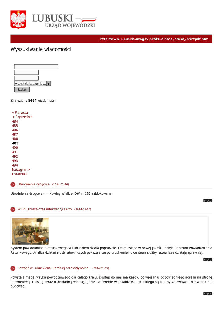 http://www.lubuskie.uw.gov.pl/aktualnosci/szukaj/printpdf.html Wyszukiwanie wiadomości wszystkie kategorie ... ▼ Szukaj Znaleziono 8464 wiadomości. « Pierwsza < Poprzednia 484 485 486 487 488 489 490 491 492 493 494 Następna > Ostatnia » Utrudnienia drogowe (2014-01-16) Utrudnienia drogowe - m.Nowiny Wielkie, DW nr 132 zablokowana więcej WCPR skraca czas interwencji służb (2014-01-15) System powiadamiania ratunkowego w Lubuskiem działa poprawnie. Od miesiąca w nowej jakości, dzięki Centrum Powiadamiania Ratunkowego. Analiza działań służb ratowniczych pokazuje, że po uruchomieniu centrum służby ratownicze działają sprawniej. więcej Powódź w Lubuskiem? Bardziej przewidywalna! (2014-01-15) Powstała mapa ryzyka powodziowego dla całego kraju. Dostęp do niej ma każdy, po wpisaniu odpowiedniego adresu na stronę internetową. Łatwiej teraz o dokładną wiedzę, gdzie na terenie województwa lubuskiego są tereny zalewowe i nie wolno nic budować. więcej Gminy już dostają środki na dożywianie (2014-01-15) Trwa realizacja wieloletniego programu wspierania finansowego gmin w zakresie dożywiania „Pomoc państwa w zakresie dożywiania”. Program był realizowany od 2006 r. ze środków budżetu państwa oraz budżetów gmin. W grudniu ubiegłego roku Rząd zdecydował przedłużyć okres działania programu na lata 2014-2020. więcej Program „Pomoc państwa w zakresie dożywiania” jest realizowany (2014-01-15) Trwa realizacja wieloletniego programu wspierania finansowego gmin w zakresie dożywiania „Pomoc państwa w zakresie dożywiania”. Program był realizowany od 2006 r. ze środków budżetu państwa oraz budżetów gmin. więcej Duże inwestycje WIOŚ (2014-01-15) Efektywne i skuteczne funkcjonowanie WIOŚ związane jest z przeprowadzeniem niezbędnych inwestycji. W najbliższych latach WIOŚ ma zamiar przeznaczyć na ten cel 17,5 mln zł. więcej Konkurs Ministra Spraw Zagranicznych na realizację zadania publicznego (2014-01-15) Ministerstwo Spraw Zagranicznych ogłosiło konkurs dla organizacji pozarządowych i samorządów na realizację zadania publicznego pn. „Wsparcie obywatelskiego i samorządowego wymiaru polskiej polityki zagranicznej 2014”. więcej Obniżenie umieralności okołoporodowej - kierunki działań (2014-01-15) Kierunki działań, wobec niepokojącego wzrostu wskaźnika umieralności okołoporodowej w województwie lubuskim stanowiły przedmiot konferencji zorganizowanej z inicjatywy wojewody Jerzego Ostroucha. Społeczny wymiar zjawiska wzbudził konieczność jego szczegółowej analizy w celu zminimalizowania problemu stając jednym z priorytetów działań wojewody oraz Wydziału Zdrowia LUW. więcej "Kibic na 6" w obiektywie Wojewody (2014-01-14) Program „Kibic na 6” to temat specjalnego wydania programu „W obiektywie Wojewody” w TVP Gorzów Wlkp. Wojewoda Jerzy Ostrouch przybliżył założenia, cele i sposób realizacji programu. więcej Sprawdzone w Lubuskiem, używane w Polsce (2014-01-14) Algorytmy sprawdzon w Lubuskiem przez policjantów, pracowników pomocy społecznej i samorządowców są już używane w całej Polsce. Kwestionariusz programu przeciwdziałania przemocy w rodzinie pozwoli szybciej i efektywniej reagować w sytuacji, gdy dochodzi do przemocy domowej. Właśnie zakończyło się szkolenie 35 tysięcy funkcjonariuszy. więcej « Pierwsza < Poprzednia 484 485 486 487 488 489 490 491 492 493 494 Następna > Ostatnia »