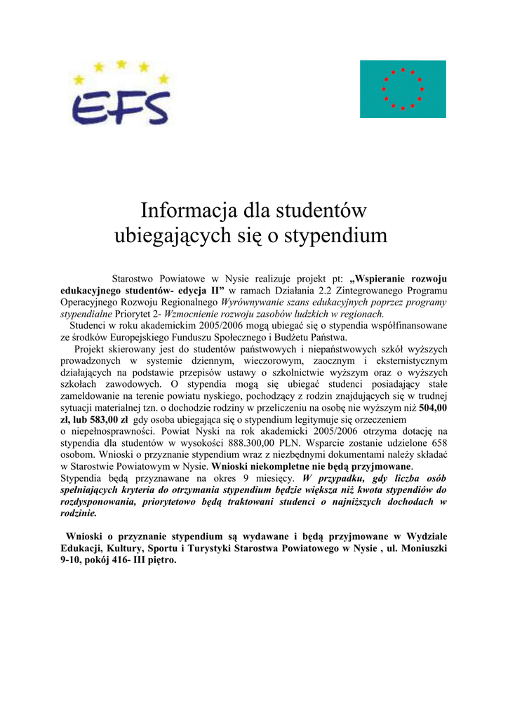 Informacja dla studentów ubiegających się o stypendium Starostwo Powiatowe w Nysie realizuje projekt pt: „Wspieranie rozwoju edukacyjnego studentów- edycja II” w ramach Działania 2.2 Zintegrowanego Programu Operacyjnego Rozwoju Regionalnego Wyrównywanie szans edukacyjnych poprzez programy stypendialne Priorytet 2- Wzmocnienie rozwoju zasobów ludzkich w regionach. Studenci w roku akademickim 2005/2006 mogą ubiegać się o stypendia współfinansowane ze środków Europejskiego Funduszu Społecznego i Budżetu Państwa. Projekt skierowany jest do studentów państwowych i niepaństwowych szkół wyższych prowadzonych w systemie dziennym, wieczorowym, zaocznym i eksternistycznym działających na podstawie przepisów ustawy o szkolnictwie wyższym oraz o wyższych szkołach zawodowych. O stypendia mogą się ubiegać studenci posiadający stałe zameldowanie na terenie powiatu nyskiego, pochodzący z rodzin znajdujących się w trudnej sytuacji materialnej tzn. o dochodzie rodziny w przeliczeniu na osobę nie wyższym niż 504,00 zł, lub 583,00 zł gdy osoba ubiegająca się o stypendium legitymuje się orzeczeniem o niepełnosprawności. Powiat Nyski na rok akademicki 2005/2006 otrzyma dotację na stypendia dla studentów w wysokości 888.300,00 PLN. Wsparcie zostanie udzielone 658 osobom. Wnioski o przyznanie stypendium wraz z niezbędnymi dokumentami należy składać w Starostwie Powiatowym w Nysie. Wnioski niekompletne nie będą przyjmowane. Stypendia będą przyznawane na okres 9 miesięcy. W przypadku, gdy liczba osób spełniających kryteria do otrzymania stypendium będzie większa niż kwota stypendiów do rozdysponowania, priorytetowo będą traktowani studenci o najniższych dochodach w rodzinie. Wnioski o przyznanie stypendium są wydawane i będą przyjmowane w Wydziale Edukacji, Kultury, Sportu i Turystyki Starostwa Powiatowego w Nysie , ul. Moniuszki 9-10, pokój 416- III piętro.