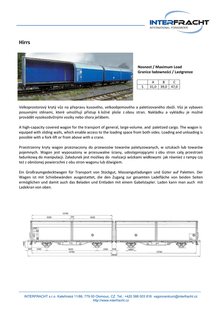Hirrs Nosnost / Maximum Load Granice ładowności / Lastgrenze S A 31,0 B 39,0 C 47,0 Velkoprostorový krytý vůz na přepravu kusového, velkoobjemového a paletizovaného zboží. Vůz je vybaven posuvnými stěnami, které umožňují přístup k ložné ploše z obou stran. Nakládku a vykládku je možné provádět vysokozdvižnými vozíky nebo shora jeřábem. A high-capacity covered wagon for the transport of general, large-volume, and paletized cargo. The wagon is equiped with sliding walls, which enable access to the loading space from both sides. Loading and unloading is possible with a fork-lift or from above with a crane. Przestrzenny kryty wagon przeznaczony do przewozów towarów paletyzowanych, w sztukach lub towarów pojemnych. Wagon jest wyposażony w przesuwalne ściany, udostępniającymi z obu stron całą przestrzeń ładunkową do manipulacji. Załadunek jest możliwy do realizacji wózkami widłowymi jak również z rampy czy też z obniżonej powierzchni z obu stron wagonu lub dźwigiem. Ein Großraumgedecktwagen für Transport von Stückgut, Massengutladungen und Güter auf Paletten. Der Wagen ist mit Schiebewänden ausgestattet, die den Zugang zur gesamten Ladefläche von beiden Seiten ermöglichen und damit auch das Beladen und Entladen mit einem Gabelstapler. Laden kann man auch mit Ladekran von oben. INTERFRACHT s.r.o Kateřinská 11/86, 779 00 Olomouc, CZ Tel.: +420 588 003 816 [email protected] http://www.interfracht.cz Technické parametry / Technical details / Danne techniczne / Technische Daten Ložná délka / Loading length / Długość ładunkowa / Ladelänge 2x12 760 mm Ložná šířka / Loading width / Szerokość ładunkowa / Ladebreite 2 900 mm Ložná výška / Loading height / Wysokość ładunkowa/ Ladehöhe 2 670 mm Ložná plocha / Loading space / Powierzchnia ładunkowa / Ladefläche 2x37,0 m² Ložný objem / Cargo volume / Objętność ładunkowa / Laderaum 2x98 m³ Europalety / Europallets / Europalety / Europaletten (0.8 x 1.2 m) 70 Průmyslové palety / Industrial pallets / Palety przemysłowe / Industriepaletten (1 x 1.2 m) 48 Hmotnost prázdného vozu / Net weight / Waga własna wagonu / Eigengewicht cca 30,75 t Délka přes nárazníky / Length over buffers / Długość całkowita / Länge über Puffer 28 040 mm Ložení europalet / Loading of europallets / Ładowanie europalet / Beladung der Europaletten Ložení průmyslových palet / Loading of Industrypallets / Ładowanie przemyselnych palet / Beladung der Industriepaletten INTERFRACHT s.r.o Kateřinská 11/86, 779 00 Olomouc, CZ Tel.: +420 588 003 816 [email protected] http://www.interfracht.cz Průřez ložným prostorem / Profile of loading space / Przekrój przestrzeni ładunkowej / Profil des Laderaumes INTERFRACHT s.r.o Kateřinská 11/86, 779 00 Olomouc, CZ Tel.: +420 588 003 816 [email protected] http://www.interfracht.cz