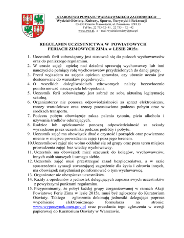 STAROSTWO POWIATU WARSZAWSKIEGO ZACHODNIEGO Wydział Oświaty, Kultury, Sportu, Turystyki i Rekreacji 05-850 OŜarów Mazowiecki, ul. Poznańska 129/133 Tel/fax. 22 733-72- 41, 22 733 – 72 - 42 www.pwz.pl, e – mail [email protected] REGULAMIN UCZESTNICTWA W POWIATOWYCH FERIACH ZIMOWYCH ZIMA w LESIE 2015r. 1. Uczestnik ferii zobowiązany jest stosować się do poleceń wychowawców oraz do poniŜszego regulaminu. 2. W czasie zajęć opiekę nad dziećmi sprawują wychowawcy lub inni nauczyciele pełniący rolę wychowawców przydzielonych do danej grupy. 3. Przed wyjazdem na zajęcia opiekun sprawdza, czy ubranie ucznia jest dostosowane do warunków pogodowych. 4. O wszelkich dolegliwościach zdrowotnych naleŜy bezzwłocznie poinformować nauczyciela lub opiekuna. 5. Uczestnik ferii zobowiązany jest zabrać ze sobą aktualną legitymację szkolną. 6. Organizatorzy nie ponoszą odpowiedzialności za sprzęt elektroniczny, rzeczy wartościowe oraz rzeczy pozostawione podczas pobytu oraz w środkach transportu. 7. Podczas pobytu obowiązuje zakaz palenia tytoniu, picia alkoholu i uŜywania środków odurzających. 8. Rodzice lub opiekunowie ponoszą odpowiedzialność za szkody wyrządzone przez uczestnika podczas podróŜy i pobytu. 9. Uczestnik zajęć ma obowiązek dbać o czystość i porządek oraz powierzone mienie w miejscu prowadzenia zajęć i poza jego terenem. 10.Uczestnikowi zajęć nie wolno oddalać się od grupy oraz poza teren miejsca prowadzenia zajęć bez wiedzy wychowawcy. 11. Uczestnik ma obowiązek mieć szacunek do kolegów, wychowawców, innych osób starszych i samego siebie. 12. Uczestnik zajęć musi przestrzegać zasad bezpieczeństwa, a w razie spostrzeŜenia sytuacji stwarzającej zagroŜenie dla Ŝycia i zdrowia innych, ma obowiązek natychmiast poinformować o tym wychowawcę. 13. Organizator nie ubezpiecza uczestników. 14. KaŜdy z opiekunów z jednostek delegujących zapozna swych uczestników z powyŜszymi punktami regulaminu. 15. Przypominamy, Ŝe pobyt kaŜdej grupy zorganizowanej w ramach Akcji Powiatowe Ferie Zima w lesie 2015r. musi być zgłoszony do Kuratorium Oświaty. Takiego zgłoszenia dokonują jednostki delegujące poprzez wypełnienie elektronicznego formularza na stronie: www.wypoczynek.men.gov.pl oraz przesłania tego zgłoszenia w wersji papierowej do Kuratorium Oświaty w Warszawie.