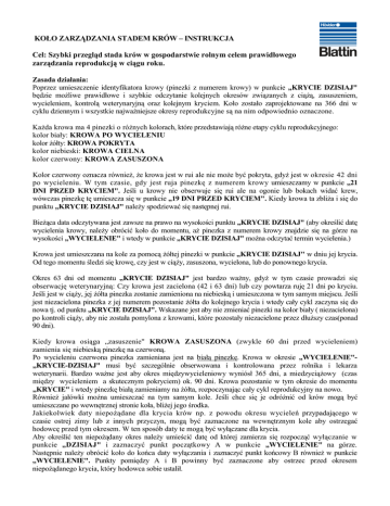 KOŁO ZARZĄDZANIA STADEM KRÓW – INSTRUKCJA Cel: Szybki przegląd stada krów w gospodarstwie rolnym celem prawidłowego zarządzania reprodukcją w ciągu roku. Zasada działania: Poprzez umieszczenie identyfikatora krowy (pinezki z numerem krowy) w punkcie „KRYCIE DZISIAJ" będzie moŜliwe prawidłowe i szybkie odczytanie kolejnych okresów związanych z ciąŜą, zasuszeniem, wycieleniem, kontrolą weterynaryjną oraz kolejnym kryciem. Koło zostało zaprojektowane na 366 dni w cyklu dziennym i wszystkie najwaŜniejsze okresy reprodukcyjne są na nim odpowiednio oznaczone. KaŜda krowa ma 4 pinezki o róŜnych kolorach, które przedstawiają róŜne etapy cyklu reprodukcyjnego: kolor biały: KROWA PO WYCIELENIU kolor Ŝółty: KROWA POKRYTA kolor niebieski: KROWA CIELNA kolor czerwony: KROWA ZASUSZONA Kolor czerwony oznacza równieŜ, Ŝe krowa jest w rui ale nie moŜe być pokryta, gdyŜ jest w okresie 42 dni po wycieleniu. W tym czasie, gdy jest ruja pinezkę z numerem krowy umieszczamy w punkcie „21 DNI PRZED KRYCIEM". Jeśli u krowy nie obserwuje się rui ale na ogonie lub bokach widać krew, wówczas pinezkę tę umieszcza się w punkcie „19 DNI PRZED KRYCIEM". Kiedy krowa ta zbliŜa i się do punktu „KRYCIE DZISIAJ" naleŜy spodziewać się następnej rui. BieŜąca data odczytywana jest zawsze na prawo na wysokości punktu „KRYCIE DZISIAJ" (aby określić datę wycielenia krowy, naleŜy obrócić koło do momentu, aŜ pinezka z numerem krowy znajdzie się na górze na wysokości „WYCIELENIE" i wtedy w punkcie „KRYCIE DZISIAJ" moŜna odczytać termin wycielenia.) Krowa jest umieszczana na kole za pomocą Ŝółtej pinezki w punkcie „KRYCIE DZISIAJ" w dniu jej krycia. Od tego momentu śledzi się krowę, czy jest w ciąŜy, zasuszona, wycielona, lub do ponownego krycia. Okres 63 dni od momentu „KRYCIE DZISIAJ" jest bardzo waŜny, gdyŜ w tym czasie prowadzi się obserwację weterynaryjną: Czy krowa jest zacielona (42 i 63 dni) lub czy powtarza ruję 21 dni po kryciu. Jeśli jest w ciąŜy, jej Ŝółta pinezka zostanie zamieniona na niebieską i umieszczona w tym samym miejscu. Jeśli jest niezacielona pinezka z jej numerem pozostanie Ŝółta do kolejnego krycia i wtedy cały cykl zaczyna się do nowa tj. od punktu „KRYCIE DZISIAJ". Wskazane jest aby nie zmieniać pinezki na kolor biały ( niezacielona) po kontroli ciąŜy, aby nie została pomylona z krowami, które pozostały niezacielone przez dłuŜszy czas(ponad 90 dni). Kiedy krowa osiąga „zasuszenie" KROWA ZASUSZONA (zwykle 60 dni przed wycieleniem) zamienia się niebieską pinezkę na czerwoną. Po wycieleniu czerwona pinezka zamieniana jest na białą pinezkę. Krowa w okresie „WYCIELENIE"„KRYCIE-DZISIAJ" musi być szczególnie obserwowana i kontrolowana przez rolnika i lekarza weterynarii. Bardzo waŜne jest aby okres międzywycieleniowy wyniósł 365 dni, a miedzyciąŜowy (czas między wycieleniem a skutecznym pokryciem) ok. 90 dni. Krowa pozostanie w tym okresie do momentu „KRYCIE" i wtedy pinezkę białą zamieniamy na Ŝółta, rozpoczynając cały cykl reprodukcyjny na nowo. RównieŜ jałówki moŜna umieszczać na tym samym kole. Jeśli chce się je odróŜnić od krów mogą być umieszczane po wewnętrznej stronie koła, bliŜej jego środka. Jakiekolwiek daty niepoŜądane dla krycia krów np. z powodu okresu wycieleń przypadającego w czasie ostrej zimy lub z innych przyczyn, mogą być zaznaczone na wewnętrznym kole aby ostrzegać hodowcę przed tym okresem. W ten sposób daty te mogą być wyłączane dla krycia. Aby określić ten niepoŜądany okres naleŜy umieścić datę od której zamierza się rozpocząć wyłączanie w punkcie „DZISIAJ" i zaznaczyć punkt początkowy A w punkcie „WYCIELENIE" na górze. Następnie naleŜy obrócić koło do końca daty wyłączania i zaznaczyć punkt końcowy B równieŜ w punkcie „WYCIELENIE". Punkty pomiędzy A i B powinny być zaznaczone aby ostrzec przed okresem niepoŜądanego krycia, który hodowca sobie ustalił.