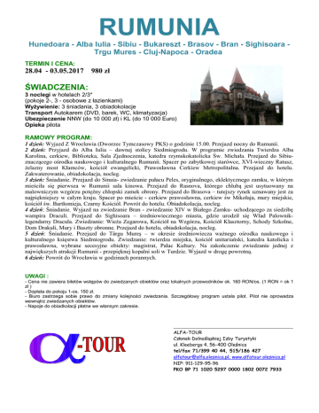 RUMUNIA Hunedoara - Alba Iulia - Sibiu - Bukareszt - Brasov - Bran - Sighisoara Trgu Mures - Cluj-Napoca - Oradea TERMIN I CENA: 28.04 - 03.05.2017 980 zł ŚWIADCZENIA: 3 noclegi w hotelach 2/3* (pokoje 2-, 3 - osobowe z łazienkami) Wyżywienie: 3 śniadania, 3 obiadokolacje Transport Autokarem (DVD, barek, WC, klimatyzacja) Ubezpieczenie NNW (do 10 000 zł) i KL (do 10 000 Euro) Opieka pilota RAMOWY PROGRAM: 1 dzień: Wyjazd Z Wrocławia (Dworzec Tymczasowy PKS) o godzinie 15.00. Przejazd nocny do Rumunii. 2 dzień: Przyjazd do Alba Iulia – dawnej stolicy Siedmiogrodu. W programie zwiedzania Twierdza Alba Karolina, cerkiew, Biblioteka, Sala Zjednoczenia, katedra rzymskokatolicka Św. Michała. Przejazd do Sibiuznaczącego ośrodka naukowego i kulturalnego Rumunii. Spacer po zabytkowej starówce, XVI-wieczny Ratusz, żelazny most Kłamców, kościół ewangelicki, Prawosławna Cerkiew Metropolitalna. Przejazd do hotelu. Zakwaterowanie, obiadokolacja, nocleg. 3 dzień: Śniadanie. Przejazd do Sinaia- zwiedzanie pałacu Peles, oryginalnego, eklektycznego zamku, w którym mieściła się pierwsza w Rumunii sala kinowa. Przejazd do Rasnova, którego chlubą jest usytuowany na malowniczym wzgórzu potężny chłopski zamek obrony. Przejazd do Brasova – tutejszy rynek uznawany jest za najpiękniejszy w całym kraju. Spacer po mieście - cerkiew prawosławna, cerkiew św Mikołaja, mury miejskie, kościół św. Bartłomieja, Czarny Kościół. Powrót do hotelu. Obiadokolacja, nocleg. 4 dzień: Śniadanie. Wyjazd na zwiedzanie Bran - zwiedzanie XIV w Białego Zamku- uchodzącego za siedzibę wampira Draculi. Przejazd do Sighisoara – średniowiecznego miasta, gdzie urodził się Wlad Palowniklegendarny Dracula. Zwiedzanie: Wieża Zegarowa, Kościół na Wzgórzu, Kościół Klasztorny, Schody Szkolne, Dom Drakuli, Mury i Baszty obronne. Przejazd do hotelu, obiadokolacja, nocleg. 5 dzień: Śniadanie. Przejazd do Târgu Mureş – w okresie średniowiecza ważnego ośrodka naukowego i kulturalnego księstwa Siedmiogrodu. Zwiedzanie: twierdza miejska, kościół unitariański, katedra katolicka i prawosławna, wybrane secesyjne obiekty: magistrat, Pałac Kultury. Na zakończenie zwiedzanie jednej z największych atrakcji Rumunii - przepięknej kopalni soli w Turdzie. Wyjazd w drogę powrotną. 6 dzień: Powrót do Wrocławia w godzinach porannych. UWAGI : - Cena nie zawiera biletów wstępów do zwiedzanych obiektów oraz lokalnych przewodników ok. 160 RON/os. (1 RON = ok 1 zł ) - Dopłata do pokoju 1-os. 150 zł. - Biuro zastrzega sobie prawo do zmiany kolejności zwiedzania. Szczegółowy program ustala pilot. Pilot nie oprowadza wewnątrz zwiedzanych obiektów. - Napoje do obiadkolacji płatne we włansym zakresie. ALFA-TOUR Członek Dolnośląskiej Izby Turystyki ul. Kleeberga 4, 56-400 Oleśnica tel/fax 71/399 40 44, 515/186 427 [email protected]; www.alfatour.olesnica.pl NIP: 911-129-95-96 PKO BP 71 1020 5297 0000 1802 0072 7933