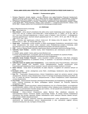 REGULAMIN UDZIELANIA KREDYTÓW i POŻYCZEK HIPOTECZNYCH PRZEZ EURO BANK S.A. Rozdział 1 - Postanowienia ogólne § 1. 1. Niniejszy Regulamin określa zasady i warunki udzielania oraz spłaty Kredytów i Pożyczek hipotecznych, osobom fizycznym przez Euro Bank SA, a także warunki zmiany Regulaminu. Postanowienia niniejszego Regulaminu są dla Stron wiążące, o ile Strony w Umowie nie ustaliły odmiennie swoich praw i obowiązków. 2. W sprawach nieuregulowanych w Umowie i Regulaminie zastosowanie mają odpowiednie przepisy Ustawy z dnia 29.08.1997 r. Prawo bankowe, Ustawy z dnia 12.05.2011 r. o kredycie konsumenckim, Ustawy z dnia 23.04.1964 r. Kodeks cywilny oraz inne powszechnie obowiązujące przepisy prawa. § 2. [Definicje] Użyte w Regulaminie terminy oznaczają: 1. Bank – Euro Bank S.A. 2. Bazy danych – zbiory danych prowadzone dla celów oceny ryzyka kredytowego przez instytucje, o których mowa w art. 105 ust. 4 Ustawy z dnia 29.08.1997 r. Prawo bankowe (Dz. U. z 2002 r. Nr 72, poz. 665, ze zm.), oraz biura informacji gospodarczej, o których mowa w Ustawie z dnia 9.04.2010 r. o udostępnianiu informacji gospodarczych i wymianie danych gospodarczych (Dz. U. z 2010 r. Nr 81, poz. 530, Nr 182, poz. 1228 i Nr 217, poz. 1427). 3. BTE – bankowy tytuł egzekucyjny, o którym mowa w art. 96 Ustawy z dnia 29 sierpnia 1997 r. Prawo bankowe (Dz.U. z 1997 r. Nr 140 poz.939 z późn. zm.). 4. Cesja praw - nieodwołalna umowa przelewu na Bank przysługującej Kredytobiorcy wierzytelności z tytułu umów ubezpieczenia i/lub innych umów zawartych przez Kredytobiorcę w związku z inwestycją, jeżeli wierzytelności z tych umów mają stanowić zabezpieczenie Kredytu lub Pożyczki hipotecznej. 5. COK – Centrum Obsługi Klienta; jednostka organizacyjna Banku prowadząca telefoniczną obsługę Klienta. 6. Całkowity koszt Kredytu – wszelkie koszty, które Kredytobiorca jest zobowiązany ponieść w związku z Umową: 6.1 odsetki, opłaty, podatki i marże, jeżeli są znane Bankowi oraz 6.2 koszty usług dodatkowych, w przypadku, gdy ich poniesienie jest niezbędne do uzyskania Kredytu, - z wyjątkiem kosztów opłat notarialnych ponoszonych przez Kredytobiorcę. 7. Całkowita kwota Kredytu/ Pożyczki – suma wszystkich środków pieniężnych, które Bank udostępnia Pożyczkobiorcy/Kredytobiorcy na podstawie Umowy, w wysokości i na warunkach określonych w Umowie oraz Regulaminie. 8. Całkowita kwota do zapłaty przez Kredytobiorcę – suma Całkowitej kwoty Pożyczki/Kredytu, naliczonych przez Bank odsetek oraz wszelkich innych niekredytowanych kosztów ponoszonych przez Pożyczkobiorcę/Kredytobiorcę, których wysokość i warunki naliczania zostały określone w Umowie. 9. Dzień roboczy – każdy dzień od poniedziałku do piątku włącznie, z wyjątkiem dni ustawowo wolnych od pracy. 10. Eurobank online – serwis udostępniany przez Bank, umożliwiający świadczenie usług bankowych za pośrednictwem Internetu. 11. Inne TU – Towarzystwo Ubezpieczeniowe, z którym Kredytobiorca zawarł lub zamierza zawrzeć umowę ubezpieczenia. Zawarcie umowy ubezpieczenia z Innym TU wymaga wcześniejszej akceptacji przez Bank. Za Inne TU uważa się również Towarzystwo Ubezpieczeniowe, z którym Kredytobiorca zawarł indywidualnie umowę ubezpieczenia. 12. Inny kredyt – dotychczasowe finansowe zobowiązania Wnioskodawcy lub Kredytobiorcy zaciągnięte w innym banku, instytucji finansowej lub Banku, podlegające spłacie Kredytem lub Pożyczką hipoteczną zaciągniętym w Banku. 13. Kanał(y) dostępu - sposób komunikacji i obsługi Kredytobiorcy inny niż w Placówce Banku, w szczególności za pośrednictwem telefonu (COK) lub Internetu (Eurobank online); składanie przez Kredytobiorcę wniosków (dyspozycji) za pośrednictwem Kanałów dostępu jest możliwe, o ile taki sposób komunikacji jest udostępniony dla danego rodzaju wnioskowanej czynności. 14. Karencja – okres, w którym Kredytobiorca spłaca Bankowi Raty odsetkowe stosownie do wykorzystanego w danym momencie kapitału przyznanego Kredytu. W okresie Karencji Kredytobiorca zobowiązany jest ponadto regulować bieżące zobowiązania z tytułu należnych Bankowi odsetek karnych, opłat, prowizji, składek ubezpieczeniowych. 15. Kontynuacja - obowiązek zawierania kolejnych wielomiesięcznych umów ubezpieczenia, w przypadku zakończenia się dotychczasowej ochrony ubezpieczeniowej w celu zachowania ciągłości ochrony ubezpieczeniowej przez cały, wymagany Umową okres,. 1 16. Koszty windykacji - zryczałtowane opłaty za podejmowane przez Bank działania windykacyjne określone w Umowie, w wysokości wskazanej w Tabeli opłat i prowizji, a także rzeczywiste poniesione przez Bank koszty sądowe i postępowań egzekucyjnych. 17. Kredyt hipoteczny / Kredyt – środki pieniężne, o których przyznanie wnioskuje Wnioskodawca lub które zostały oddane przez Bank do dyspozycji Kredytobiorcy w wysokości i na warunkach określonych w Umowie, z przeznaczeniem na konkretny cel: mieszkaniowy, refinansowanie kredytu mieszkaniowego, konsolidację zobowiązań finansowych, a także częściowo na dowolny cel konsumpcyjny, zabezpieczone w szczególności hipoteką na Nieruchomości. 18. Kredytobiorca / Pożyczkobiorca – osoba fizyczna, z którą Bank zawarł Umowę. Ilekroć w Regulaminie jest mowa o Kredytobiorcy rozumie się przez to również Pożyczkobiorcę, z wyłączeniem postanowień o finansowanej Kredytem inwestycji, kontroli wykorzystania środków z tytułu Kredytu, Wkładzie Własnym i Niskim Wkładzie Własnym. 19. Marża bazowa – składnik oprocentowania; stała wartość wyrażona w procentach, ustalana przez Bank i wskazana w Umowie. 20. Marża Banku – marża, uwzględniająca podwyżki Marży bazowej z tytułu ryzyk ponoszonych przez Banku, wskazana w Umowie. 21. Nieruchomość – część powierzchni ziemskiej stanowiąca odrębny przedmiot własności lub użytkowania wieczystego, jak równi