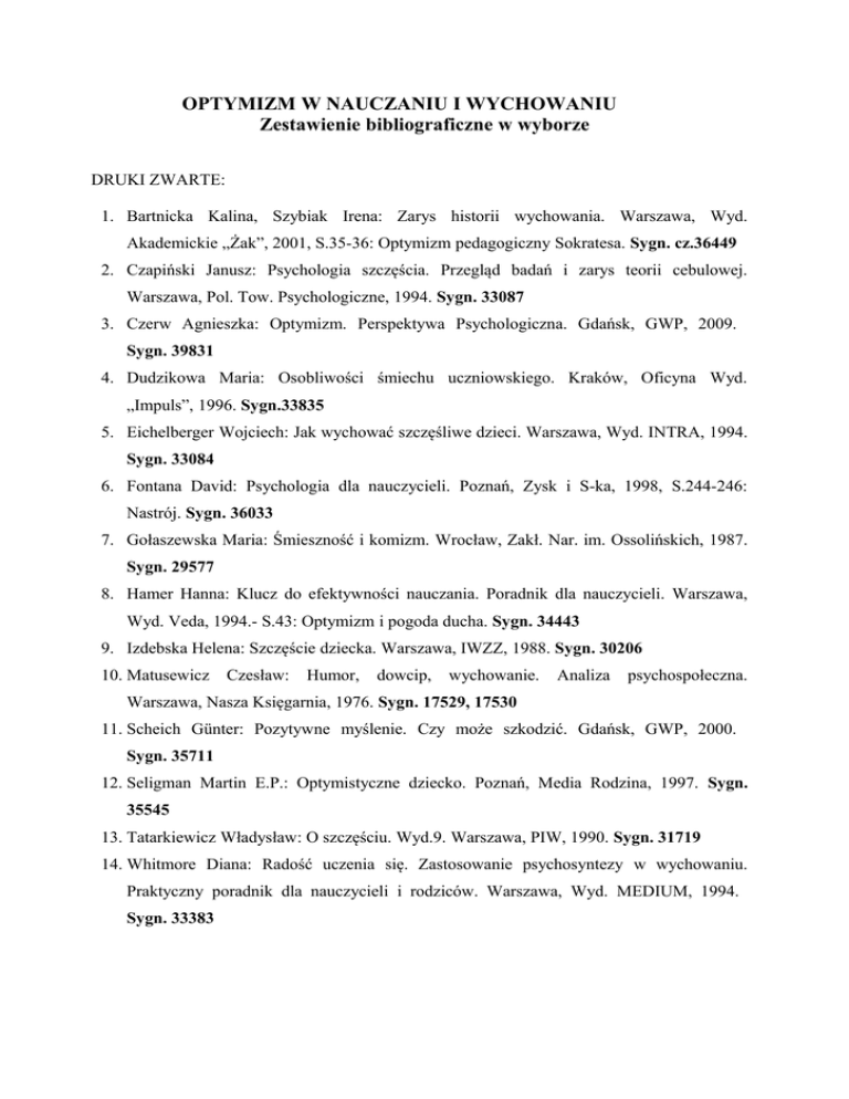 OPTYMIZM W NAUCZANIU I WYCHOWANIU Zestawienie bibliograficzne w wyborze DRUKI ZWARTE: 1. Bartnicka Kalina, Szybiak Irena: Zarys historii wychowania. Warszawa, Wyd. Akademickie „Żak”, 2001, S.35-36: Optymizm pedagogiczny Sokratesa. Sygn. cz.36449 2. Czapiński Janusz: Psychologia szczęścia. Przegląd badań i zarys teorii cebulowej. Warszawa, Pol. Tow. Psychologiczne, 1994. Sygn. 33087 3. Czerw Agnieszka: Optymizm. Perspektywa Psychologiczna. Gdańsk, GWP, 2009. Sygn. 39831 4. Dudzikowa Maria: Osobliwości śmiechu uczniowskiego. Kraków, Oficyna Wyd. „Impuls”, 1996. Sygn.33835 5. Eichelberger Wojciech: Jak wychować szczęśliwe dzieci. Warszawa, Wyd. INTRA, 1994. Sygn. 33084 6. Fontana David: Psychologia dla nauczycieli. Poznań, Zysk i S-ka, 1998, S.244-246: Nastrój. Sygn. 36033 7. Gołaszewska Maria: Śmieszność i komizm. Wrocław, Zakł. Nar. im. Ossolińskich, 1987. Sygn. 29577 8. Hamer Hanna: Klucz do efektywności nauczania. Poradnik dla nauczycieli. Warszawa, Wyd. Veda, 1994.- S.43: Optymizm i pogoda ducha. Sygn. 34443 9. Izdebska Helena: Szczęście dziecka. Warszawa, IWZZ, 1988. Sygn. 30206 10. Matusewicz Czesław: Humor, dowcip, wychowanie. Analiza psychospołeczna. Warszawa, Nasza Księgarnia, 1976. Sygn. 17529, 17530 11. Scheich Günter: Pozytywne myślenie. Czy może szkodzić. Gdańsk, GWP, 2000. Sygn. 35711 12. Seligman Martin E.P.: Optymistyczne dziecko. Poznań, Media Rodzina, 1997. Sygn. 35545 13. Tatarkiewicz Władysław: O szczęściu. Wyd.9. Warszawa, PIW, 1990. Sygn. 31719 14. Whitmore Diana: Radość uczenia się. Zastosowanie psychosyntezy w wychowaniu. Praktyczny poradnik dla nauczycieli i rodziców. Warszawa, Wyd. MEDIUM, 1994. Sygn. 33383 15. Żywczok Alicja: Filozoficzne korzenie pedagogii radości. Kraków, Oficyna Wyd. „Impuls”, 2000. Sygn. 36057 16. Żywczok Alicja: Wychowanie do radości życia. Warszawa, Wyd. Akademickie „Żak”, 2004. Sygn. 37187 ARTYKUŁY Z CZASOPISM: 1. Byra Stanisława, Parchomiuk Monika: Optymizm dyspozycjonalny młodzieży niepełnosprawnej – wybrane konteksty. CHOWANNA 2009, nr 1, s.115-131 2. Demel Maciej: O myśleniu pozytywnym i źródłach optymizmu. WYCHOWANIE FIZYCZNE I ZDROWOTNE 1998, nr 3, s.100-102 3. Dudzikowa Maria: Z optymizmem o potędze optymizmu. PROBLEMY OPIEKUŃCZOWYCHOWAWCZE 2005, nr 2, S.40-44 4. Garczyński Stefan: Wychowanie dla radości. PROBLEMY OPIEKUŃCZO- WYCHOWAWCZE 1981, nr 2, (wkładka) s.(34)-(39) 5. Jałowiecka Aneta: O dysleksji … optymistycznie. NAUCZANIE POCZĄTKOWE 2008/2009, nr 2, s.29-36 6. Karczewska Joanna: Podmiotowość ucznia warunkiem jego radości i optymizmu. NAUCZANIE POCZĄTKOWE 2008/2009, nr 2, s.22-28 7. Kozłowski Tomasz: Radość życia, czyli przedmiot, którego nie ma. PSYCHOLOGIA W SZKOLE 2013, nr 3, s.77-82 8. Krajewska-Zięba Anna, Kucińska Magdalena: Optymizm-pesymizm a hierarchia wartości jednostki (Przegląd teoretycznych i empirycznych ustaleń). PSYCHOLOGIA WYCHOWAWCZA 1995, nr 1, s.28-37 9. Mądrzycki Tadeusz, Retowski Sylwiusz: Temperament a optymizm-pesymizm. PSYCHOLOGIA WYCHOWAWCZA 1992, nr 4, s.209-217 10. Palka Stanisław: Kształtowanie poczucia i optymizmu u uczniów klas początkowych. NAUCZANIE POCZĄTKOWE 2008/2009, nr 2, s.8-16 11. Pisarski Marek: Optymizm i nadzieja. WYCHOWAWCA 1998, nr 7-8, s.23 12. Pluskota-Lewandowska Anna: Fenomen optymizmu-pesymizmu młodzieży w kontekście emancypacyjnej roli edukacji. KULTURA I EDUKACJA 2009, nr 3, s.22-37 13. Stańczak Irena: Optymizm i radość w szkole. NAUCZANIE POCZĄTKOWE 2008/2009, nr 2, s.7 14. Stańczak Irena: Szkoła a humor i optymizm uczniów. NAUCZANIE POCZĄTKOWE 2008/2009, nr 2, s.17-21 15. Stawiak-Ososińska Małgorzata: Czy szkoła może być miejscem szczęśliwym i radosnym? NAUCZANIE POCZĄTKOWE 2008/2009, nr 2, s.48-53 16. Sytnik-Czetwertyński Janusz: O praktycznej stronie optymizmu. NAUCZANIE POCZĄTKOWE 2008/2009, nr 2, s.89-94 17. Trębicka Katarzyna: Optymizm w poezji Joanny Kulmowej – refleksje. NAUCZANIE POCZĄTKOWE 2008/2009, nr 2, s.43-47 18. Zięba Alicja: Potęga optymizmu. NOWA SZKOŁA 2001, nr 4, s.50-51 19. Żywczok Alicja: Nauczyciele o wychowaniu w duchu radości. PROBLEMY OPIEKUŃCZO-WYCHOWAWCZE 1995, nr 8, s.15-18 20. Żywczok Alicja: O wychowaniu szczęśliwego człowieka. PROBLEMY OPIEKUŃCZOWYCHOWAWCZE 2003, nr 1, s.17-21 21. Żywczok Alicja: Profilaktyka pesymizmu i negacji życia w wychowaniu szkolnym. NAUCZYCIEL I SZKOŁA.- 2004, nr 3-4, s.76-90 22. Żywczok Alicja: Przeciw nudzie – naprzeciw radości życia. WYCHOWANIE NA CO DZIEŃ 2003, nr 3, s.3-4 23. Żywczok Alicja: Radość życia – kategoria pedagogiczna. EDUKACJA I DIALOG 1998, nr 10, s.36-40 24. Żywczok Alicja: Rodzinne wychowanie do radości życia. MAŁŻEŃSTWO I RODZINA 2003, nr 1, s.18-21