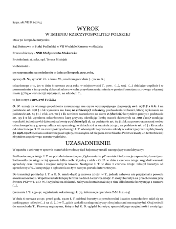 Sygn. akt VII K 657/15 WYROK W IMIENIU RZECZYPOSPOLITEJ POLSKIEJ Dnia 30 listopada 2015 roku Sąd Rejonowy w Białej Podlaskiej w VII Wydziale Karnym w składzie: Przewodniczący - SSR Małgorzata Makarska Protokolant: st. sekr. sąd. Teresa Misiejuk w obecności po rozpoznaniu na posiedzeniu w dniu 30 listopada 2015 roku, sprawy O. N., syna W. i L. z domu W., urodzonego w dniu (...) w m. K.; oskarżonego o to, że: w dniu 6 czerwca 2015 roku w miejscowości T., pow. (...), woj. (...) działając wspólnie i w porozumieniu z inną osobą dokonał zaboru w celu przywłaszczenia mienia w postaci bursztynu surowego o łącznej masie 5,7 kg o wartości 52 098,09 zł., na szkodę I. T., to jest o czyn z art. 278 § 1 k.k.; O. N. uznaje za winnego popełnienia zarzucanego mu czynu wyczerpującego dyspozycję art. 278 § 1 k.k. i na podstawie art. 278 § 1 kk wymierza mu karę 10 (dziesięć) miesięcy pozbawienia wolności, której wykonanie na podstawie art. 69 § 1 i 2 kk, art. 70 § 1 kk zawiesza warunkowo na okres 2 (dwóch) lat tytułem próby; n podstawie art. 33 § 2 kk wymierza oskarżonemu karę grzywny określając liczbę stawek dziennych na 100 (sto) ustalając wysokość jednej stawki dziennej na kwotę 10 (dziesięć) zł; na podstawie art. 63 § 1 kk na poczet orzeczonej wobec oskarżonego kary grzywny zalicza zatrzymanie go w dniach 10 i 11 września 2015r.; na podstawie art. 46 § 1 kk orzeka od oskarżonego O. N. na rzecz pokrzywdzonego I. T. obowiązek naprawienia szkody w całości poprzez zapłatę kwoty 52 098,09 zł; zwalania oskarżonego od opłaty, zaś zasądza od niego na rzecz Skarbu Państwa kwotę 40 (czterdzieści) zł tytułem częściowego zwrotu wydatków. UZASADNIENIE W oparciu o zebrany w sprawie materiał dowodowy Sąd Rejonowy ustalił następujący stan faktyczny: Pod koniec maja 2015r. I. T. na portalu internetowym „Ogłoszenia 24 pl” zamieścił informacje o sprzedaży bursztynu. Zadzwoniło do niego w tej sprawie kilka osób. Z jedną z nich - O. N. w dniu 1 czerwca 2015r. uzgodnił warunki sprzedaży oraz termin i miejsce nabycia towaru. Następnie I. T. w dniu 2 czerwca 2015r. zakupił bursztyn od sprzedawcy z W., korzystając z ogłoszenia na tym samym portalu internetowym. Do transakcji pomiędzy I. T. a O. N. miało dojść 3 czerwca 2015r. w T., jednak nabywca nie przyjechał z powodu awarii samochodu. Wspólnie ustalił kolejny termin na dzień 6 czerwca 2015r. T. złożył bursztyn na przechowaniu przy dworcu PKP w T. u D. W. i wyjechał na Białoruś. Nabywca kontaktował się z nim kilkukrotnie korzystając z numeru (...). (zeznania I. T. k.3v-4v, wyjaśnienia oskarżonego k. 79, informacja operatora T-M. k.21-24) W dniu 6 czerwca 2015r. przed godz. 13.00 I. T. odebrał bursztyn z przechowalni i swoim samochodem udał się na parking przy sklepie (...) na ul. (...) w T., gdzie czekali na niego nabywcy: dwaj nieznani mu mężczyźni. Obaj wsiedli do samochodu T.. Pierwszy mężczyzna, którym był O. N. oglądał bursztyn, sprawdził jego oryginalność i zważył go. Stwierdził, że dokona zakupu bursztynu za uzgodniona kwotę 14100 USD. Po tym włożył go do reklamówki i przekazał drugiemu mężczyźnie, który z bursztynem oddalił się w nieznanym kierunku. O. N. zagadywał zbywcę i oświadczył, że chce zamienić złotówki na dolary. Udali się więc do pobliskiego kantoru w Galerii (...) w T., ale według twierdzenia N., kurs był nieodpowiedni. Następnie wraz z T. do drugiego kantoru. Idąc ul. (...) nagle zaczął uciekać pomiędzy blokami. I. T. gonił go jeszcze przez ok. 50 metrów. Kiedy nie udało się zatrzymać mężczyzny wrócił do samochodu i pojechał na komisariat policji. (zeznania I. T. k.3v-4v, wyjaśnienia oskarżanego k. 79, protokół oględzin k.11-12, dokumentacja fotograficzna k.24, protokół oględzin zapisu monitoringu k. 29-30) W wyniku sprawdzenia i analizy połączeń telefonicznych z numerem (...) ustalono i zatrzymano mężczynę, którym okazał się O. N.. Został on również rozpoznany przez pokrzywdzonego. Łączna masa bursztynu surowego, w bryłach o nieregularnych kształtach i wadze od 5 do 50 gr, wynosiła 5,7 kg, a jego wartość została wyceniona przez pokrzywdzonego na kwotę 52098,09 zł – czyli 14000 USD. (zeznania I. T. k,3v-4v, fotografie k.6,7, informacja o kursie dolara k.9, protokół okazania k. 81-82, protokół oględzin k. 97-98) O. N. jest obywatelem Ukrainy, który od lutego 2015r. przebywa w Polsce. Zamieszkuje w M. i pozostaje w konkubinacie z E. W.. Z zawodu jest murarzem, lecz pracuje u córki swojej konkubiny jako pomoc domowa. Ma jedno dziecko. Wcześniej był karany. (dane o osobie k. 78-79, dane o karalności k. 94) Powyższy stan faktyczny Sąd ustalił w oparciu o wymienione wyżej dowody. Oskarżony O. N. w postępowaniu przygotowawczym (k.78-79) przyznał się do popełniania zarzucanego mu przestępstwa. Złożył szczegółowe wyjaśnienia, w których wskazał, że kradzież bursztynu zaplanował wraz ze znajomym S., którego poznał w rejonie Dworca Zachodniego w W.. Sprzedającego bursztyn znalazł na portalu ogłoszeń S., on zaś kontaktował się telefonicznie z T.. Uzgodnił, ze nabędzie ok.5 kg bursztynu za cenę 40-50 tys. zł zależnie od wielkości i jakości surowca. Oskarżony przyznał, że do T. pojechał nie posiadając pieniędzy i że osobiście rozmawiał ze sprzedającym i zgodził się na nabycie bursztynu. Po uzgodnieniu ceny S. odszedł wraz z bursztynem on zaś zaproponował zbywcy wyjście do kantoru i po drodze uciekł. Podał, że S. miał sprzedać bursztyn, a po sprzedaży rozliczyć się z nim. Ostatecznie przekazał mu jedynie 1500 zł. Oświadczył, że nie ma żadnego kontaktu z S.. Sąd zważył, co następuje: Wyjaśnia oskarżonego O. N. zasługują w całości na wiarę. Nie ma podstaw, by kwestionować szczerość i logikę jego twierdzeń, bowiem nie pojawiły się w sprawie żadne dowody przeciwne. Swoją postaw