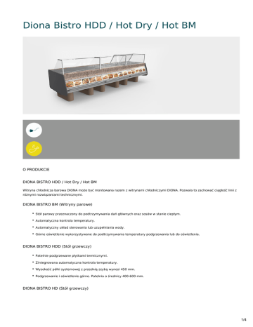 Diona Bistro HDD / Hot Dry / Hot BM O PRODUKCIE DIONA BISTRO HDD / Hot Dry / Hot BM Witryna chłodnicza barowa DIONA może być montowana razem z witrynami chłodniczymi DIONA. Pozwala to zachować ciągłość linii z różnymi rozwiązaniami technicznymi. DIONA BISTRO BM (Witryny parowe) Stół parowy przeznaczony do podtrzymywania dań głównych oraz sosów w stanie ciepłym. Automatyczna kontrola temperatury. Automatyczny układ sterowania lub uzupełniania wody. Górne oświetlenie wykorzystywane do podtrzymywania temperatury podgrzewania lub do oświetlenia. DIONA BISTRO HDD (Stół grzewczy) Patelnie podgrzewane płytkami termicznymi. Zintegrowana automatyczna kontrola temperatury. Wysokość półki systemowej z przednią szybą wynosi 450 mm. Podgrzewanie i oświetlenie górne. Patelnia o średnicy 400-600 mm. DIONA BISTRO HD (Stół grzewczy) 1/4 Płytki termiczne do podtrzymywania dań głównych oraz sosów w stanie ciepłym. Automatyczna kontrola temperatury. Wysokość półki systemowej z przednią szybą wynosi 450 mm. Podgrzewanie i oświetlenie górne. 2/4 RYSUNKI 3/4 SPECYFIKACJE TECHNICZNE temperatura C (+25 C, 60 % Model Długość z bokami mm H1, M2, M1 Diona Bistro HDD 1250 60…80°C 230V 1250 60…80°C 230V 1250 60…80°C 230V Diona Bistro Hot Dry Diona Bistro Hot BM RH) Obszar ekspozycji Оbjętość m² m³ Napicie znamionowe V 4/4