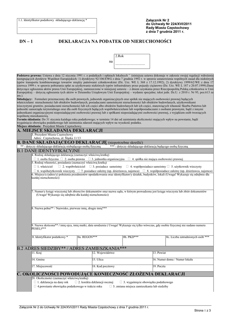 Załącznik Nr 2 do Uchwały Nr 224/XVI/2011 Rady Miasta Częstochowy z dnia 7 grudnia 2011 r. 1.1. Identyfikator podatkowy składającego deklarację * .................................................................................................... DN – 1 DEKLARACJA NA PODATEK OD NIERUCHOMOŚCI 2.Rok na .................................. Podstawa prawna: Ustawa z dnia 12 stycznia 1991 r. o podatkach i opłatach lokalnych 1 (niniejsza ustawa dokonuje w zakresie swojej regulacji wdroŜenia następujących dyrektyw Wspólnot Europejskich: 1) dyrektywy 92/106/EWG z dnia 7 grudnia 1992 r. w sprawie ustanowienia wspólnych zasad dla niektórych typów transportu kombinowanego towarów między państwami członkowskimi (Dz. Urz. WE L 368 z 17.12.1992), 2) dyrektywy 1999/62/WE z dnia 17 czerwca 1999 r. w sprawie pobierania opłat za uŜytkowanie niektórych typów infrastruktury przez pojazdy cięŜarowe (Dz. Urz. WE L 187 z 20.07.1999).Dane dotyczące ogłoszenia aktów prawa Unii Europejskiej, zamieszczone w niniejszej ustawie – z dniem uzyskania przez Rzeczpospolitą Polską członkostwa w Unii Europejskiej – dotyczą ogłoszenia tych aktów w Dzienniku Urzędowym Unii Europejskiej – wydanie specjalne; tekst jedn. Dz.U. z 2010 r. Nr 95, poz.613 ze zm.). Składający: Formularz przeznaczony dla osób prawnych, jednostek organizacyjnych oraz spółek nie mających osobowości prawnej będących właścicielami nieruchomości lub obiektów budowlanych, posiadaczami samoistnymi nieruchomości lub obiektów budowlanych, uŜytkownikami wieczystymi gruntów, posiadaczami nieruchomości lub ich części albo obiektów budowlanych lub ich części, stanowiących własność Skarbu Państwa lub jednostki samorządu terytorialnego oraz dla osób fizycznych będących współwłaścicielami lub współposiadaczami z osobami prawnymi, bądź z innymi jednostkami organizacyjnymi nieposiadającymi osobowości prawnej lub z spółkami nieposiadającymi osobowości prawnej, z wyjątkiem osób tworzących wspólnotę mieszkaniową. Termin składania: Do 31 stycznia kaŜdego roku podatkowego; w terminie 14 dni od zaistnienia okoliczności mających wpływ na powstanie, bądź wygaśnięcie obowiązku podatkowego lub zaistnienia zdarzeń mających wpływ na wysokość podatku. Miejsce składania: Prezydent Miasta Częstochowy. A. MIEJSCE SKŁADANIA DEKLARACJI 3. Prezydent Miasta Częstochowy Adres: Częstochowa, ul. Śląska 11/13 B. DANE SKŁADAJĄCEGO DEKLARACJĘ (niepotrzebne skreślić) ** - dotyczy składającego deklarację niebędącego osobą fizyczną *** - dotyczy składającego deklarację będącego osobą fizyczną B.1 DANE IDENTYFIKACYJNE 4. Rodzaj składającego deklarację (zaznaczyć właściwą kratkę) 1. osoba fizyczna 2. osoba prawna 3. jednostka organizacyjna 4. spółka nie mająca osobowości prawnej 5. Rodzaj własności, posiadania (zaznaczyć właściwą kratkę) 1. właściciel 2. współwłaściciel 3. posiadacz samoistny 4. współposiadacz samoistny 5. uŜytkownik wieczysty 6. współuŜytkownik wieczysty 7. posiadacz zaleŜny (np. dzierŜawca, najemca) 8. współposiadacz zaleŜny (np. dzierŜawca, najemca) 6. Miejsce/a (adres/y) połoŜenia przedmiotów opodatkowania oraz identyfikator/y działek, budynków, lokali (Uwaga! Wykazuje się odrębnie dla kaŜdej nieruchomości) 7. Numer/y księgi wieczystej lub zbioru/ów dokumentów oraz nazwa sądu, w którym prowadzona jest księga wieczysta lub zbiór dokumentów (Uwaga! Wykazuje się odrębnie dla kaŜdej nieruchomości) 8. Nazwa pełna** / Nazwisko, pierwsze imię, drugie imię*** 9. Nazwa skrócona** / imię ojca, imię matki, data urodzenia ( Uwaga! Wykazuje się tylko wówczas, gdy osobie fizycznej nie nadano numeru PESEL)*** 10. Identyfikator podatkowy * 10a. REGON*** 10b. PKD*** 10c. Liczba zatrudnionych osób *** B.2 ADRES SIEDZIBY** / ADRES ZAMIESZKANIA*** 11. Kraj 12. Województwo 13. Powiat 14. Gmina 15. Ulica 16. Numer domu / Numer lokalu 17. Miejscowość 18. Kod pocztowy 19. Poczta C. OKOLICZNOŚCI POWODUJĄCE KONIECZNOŚĆ ZŁOśENIA DEKLARACJI 20. Okoliczności (zaznaczyć właściwą kratkę) 1. deklaracja na dany rok 2. korekta deklaracji rocznej 3. wygaśnięcie obowiązku podatkowego 4.powstanie obowiązku podatkowego w trakcie roku 5. zmiana miejsca zamieszkania lub siedziby Załącznik Nr 2 do Uchwały Nr 224/XVI/2011 Rady Miasta Częstochowy z dnia 7 grudnia 2011 r. Strona 1 z 3 D. DANE DOTYCZĄCE PRZEDMIOTÓW OPODATKOWANIA (z wyjątkiem zwolnionych) Wyszczególnienie Podstawa opodatkowania Stawka podatku Kwota podatku wynikająca z w zł,gr Uchwały Rady Miasta Częstochowy (ogłoszona w Dz. U. Województwa Śląskiego w roku poprzedzającym dany rok podatkowy) w zł,gr D.1 POWIERZCHNIA GRUNTÓW (Uwaga! Wykazujemy z dokładnością do 1 m kw.) 1. związanych z prowadzeniem działalności gospodarczej, bez względu na sposób zakwalifikowania w ewidencji gruntów i budynków 21. 22. 23. ................... m .................,....... .................,....... 24. 25. 26. .................... ha .................,....... .................,....... 28. 29. .................,....... .................,....... 2 2. pod jeziorami, zajętych na zbiorniki wodne retencyjne lub elektrowni wodnych 3. pozostałe grunty, w tym zajęte na prowadzenie odpłatnej statutowej27. działalności poŜytku publicznego przez organizacje poŜytku publicznego ................... m2 D.2 POWIERZCHNIA UśYTKOWA BUDYNKÓW LUB ICH CZĘŚCI (*) 1. mieszkalnych - ogółem 30. 31. ..................... m2 .................,....... 32. .................,....... w tym: 34. 33. 35. - kondygnacji o wysokości od 1,40 do 2,20 m (zaliczyć 50% powierzchni) ........................... m2 ........................,........ ........................,........ - kondygnacji o wysokości powyŜej 2,20 m ........................... m2 ........................,........ ........................,........ 1a. od budynków przeznaczonych wyłączn