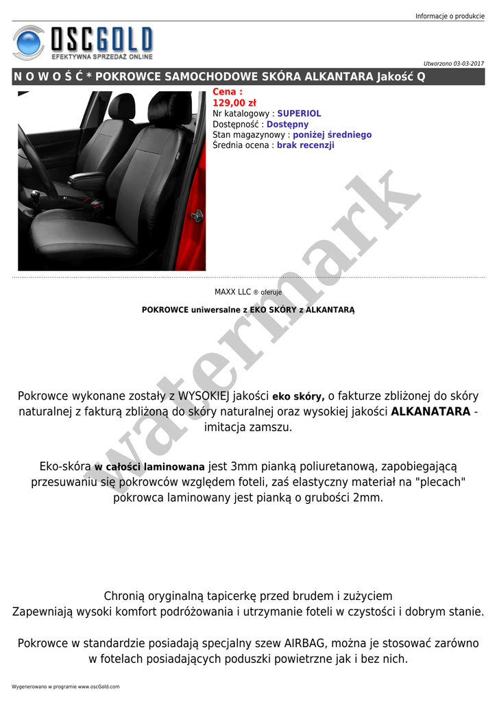 Informacje o produkcie Utworzono 03-03-2017 N O W O Ś Ć * POKROWCE SAMOCHODOWE SKÓRA ALKANTARA Jakość Q Cena : 129,00 zł er m ar k Nr katalogowy : SUPERIOL Dostępność : Dostępny Stan magazynowy : poniżej średniego Średnia ocena : brak recenzji MAXX LLC ® oferuje POKROWCE uniwersalne z EKO SKÓRY z ALKANTARĄ at Pokrowce wykonane zostały z WYSOKIEJ jakości eko skóry, o fakturze zbliżonej do skóry naturalnej z fakturą zbliżoną do skóry naturalnej oraz wysokiej jakości ALKANATARA imitacja zamszu. w Eko-skóra w całości laminowana jest 3mm pianką poliuretanową, zapobiegającą przesuwaniu się pokrowców względem foteli, zaś elastyczny materiał na "plecach" pokrowca laminowany jest pianką o grubości 2mm. Chronią oryginalną tapicerkę przed brudem i zużyciem Zapewniają wysoki komfort podróżowania i utrzymanie foteli w czystości i dobrym stanie. Pokrowce w standardzie posiadają specjalny szew AIRBAG, można je stosować zarówno w fotelach posiadających poduszki powietrzne jak i bez nich. Wygenerowano w programie www.oscGold.com Kolory odporne na światło i czyszczenie Zapakowane w praktyczną torbę do przenoszenia Pokrowce dostępne są w 4 w kolorach er m ar k czarny czarno-szary at ● w ● w at er m ar k Informacje o produkcie Komplet zawiera: 2 pokrowce na przednie fotele 1 pokrowiec na oparcie tylne 1 pokrowiec na siedzisko tylne 5 pokrowce na zagłówki haczyki montażowe Wygenerowano w programie www.oscGold.com UWAGA !!!! Po zakupie proszę określić który kolor i wzór mamy wysłać !!! w at er m ar k W pokrowcach użyty został dobrej jakości materiały typu EKO-SKÓRA, z fakturą zbliżoną do skóry naturalnej z fakturą zbliżoną do skóry naturalnej oraz wysokiej jakości ALKANATARA - imitacja zamszu w at er m ar k Informacje o produkcie Wygenerowano w programie www.oscGold.com er m ar k at w POSIADAJĄ VARIO SYSTEM+ - można stosować do kanap dzielonych i niedzielonych. Posiadają zamki w tylnej kanapie dzięki czemu pasują do większości dzieleń dostępnych na rynku, nie blokują użycia podłokietnika - Pokrowiec można założyć również na niedzieloną tylną kanapę. Informacje o produkcie er m ar k Pokrowce posiadają specjalne, bezpieczne szwy dla poduszek AIRBAG dzięki czemu przystosowane są do samochodów zarówno z bocznymi poduszkami powietrznymi w fotelach, jak i do standardowych siedzeń. w at Pokrowce zostały poddane rygorystycznym testom sprawdzającym, czy nie spowalniają czasu otwarcia się poduszki powietrznej umieszczonej w bocznej części foteli. Badania te zostały potwierdzone certyfikatem bezpieczeństwa PiMOT. Posiadamy atest uprawniający nas do oznaczania pokrowców znakiem bezpieczeństwa oraz używania oznaczeń, że pokrowce mogą być stosowane w samochodach wyposażonych w AIRBAG SYSTEM. Wygenerowano w programie www.oscGold.com er m ar k at w Informacje o produkcie w at er m ar k Pokrowce na przednie fotele posiadają gotowe, praktyczne otwory na zagłówki, dzięki czemu nie wymagają samodzielnego rozcinania materiału i związanego z tym ryzyka uszkodzenia pokrowca Pokrowce zasłaniają tył przednich foteli w całości Tył przednich pokrowców oraz obszycia tylnych siedzeń wykonane z dobranego kolorystycznie materiału. Wygenerowano w programie www.oscGold.com er m ar k at w UWAGA!!! OTWORY NA ZAGŁÓWKI, OTWORY NA DŹWIGNIE DO PODNOSZENIA FOTELA, OTWORY NA POKRĘTŁA REGULACYJNE, OTWORY NA OSŁONY PASÓW BEZPIECZEŃSTWA I INNE WYSTAJĄCE CZĘŚCI FOTELI WYKONUJEMY SAMEMU PODCZAS MONTAŻU. POKROWCE MOŻNA STOSOWAĆ DO SAMOCHODÓW: ALFA ROMEO 145 - 146 - 147 - 155 - 156 - 159 - 166 - ALFETTA - GUILETTA Informacje o produkcie 80 - 90 - 100 - A3 - A4 - A6 - A8 BMW SERIE 1 - 2 - 3 - 5 - 7 - X3 - X5 CHRYSLER 300 - NEON - PT CRUISER - SEBRING CITROEN BX - C3 - C4 - C5 - CX - XANTIA - XM - XSARA - ZX - BERLINGO - NEMO - C-ELYSSE - DS3 - DS4 - DS5 CHEVROLET LACETTI - CRUZE - EVANDA - CAPTIVA DACIA LOGAN - SANDERO - DUSTER - LODGY DAEWOO ESPERO - LANOS - LEGANZA - MATIZ - NEXIA - NUBIRA DAIHATSU CHARADE - GRAN MOVE - MOVE - SIRION - TERIOS FIAT BRAVA - BRAVO - CROMA - MAREA - PALIO - DOBLO - PUNTO - RITMO - STILO - TEMPRA - TIPO - GRANDE PUNTO - 500L - FREEMONT - LINEA - SEDICI FORD B-MAX - ESCORT - COUGAR - FIESTA - FOCUS - FUSION - MONDEO - ORION - PROBE - PUMA - SCORPIO SIERRA - KUGA HONDA ACCORD - CIVIC - CONCERTO - CRV - HRV - LEGEND - PRELUDE - QUINTET HYUNDAI ACCENT - MATRIX - XG - TERRACAN - GALLOPER - LANTRA - PONY - SCOUPE - SONATA - SANTA FE TUCSON - i20 - i30 - i40 - ix20 - ix35 KIA SEPHIA - CERATO - OPIRUS - RIO - SORENTO - CARENS - MAGENTIS - SHUMA - SPORTAGE - CEE'D - SOUL VENGA LADA 110 - 111 - NIVA - SAMARA LANCIA BETA - DEDRA - KAPPA - LYBRA - PRISMA - THEMA - Y - Y10 - THESIS - MUSA LEXUS GS - LS MAZDA 121 - 323 - 323F - 626 - 929 - RX - DEMIO - XEDOS - 3 - 5 - 6 MERCEDES 190 - 200 - 300 - CLASS A - CLASS C - CLASS E - CLASS ML - CLASS B MITSUBISCHI CARISMA - COLT (po 91) - GALANT - LANCER - SPACE RUNNER - OUTLANDER - SPACE STAR NISSAN ALMERA - BLUEBIRD - MAXIMA - MURANO - X TRAIL - PATHFINDER - TINO - SERENA - PRIMERA - SUNNY TERRANO - JUKE - QASHQAI - NOTE OPEL ASCONA - SIGNUM - ASTRA - CALIBRA - CORSA - FRONTIERA - KADETT - OMEGA - VECTRA - ZAFIRA ANTARA - INSIGNIA - MERIVA - MOKKA PEUGEOT 206 - 207 - 208 - 301 - 305 - 306 - 307 - 405 - 406 - 407 - 505 - 1007 - 605 - 607 - 2008 - 3008 - 5008 RENAULT CLIO - EXPRESS - LAGUNA - MEGANE - R11 - R19 - R21 - R25 - SAFRANE - CAPTUR - FLUENCE - KANGOO THALIA ROVER 45 - 75 - MONTEGO - 200 - 400 - 600 - 800 SAAB 9.3 - 9.5 SEAT ALTEA - CORDOBA - iBIZA - LEON - MALAGA - TOLEDO SKODA FAVORIT - FELICIA - FABIA - OCTAVIA - SUPERB - RAPID SUBARU FORESTER - OUTBACK - IMPREZA - LEGACY SUZUKI LIANA - WAGON R - BALENO - JIMNY - SWIFT - VITARA - GRAND VITARA - SX4 TOYOTA PRIUS - AVENSIS - COROLLA - STARLET - YARIS - RAV4 - AURIS VOLKSWAGEN BORA - GOLF - JETTA - NEW - BEETLE - PASSAT - POLO - SIROCCO - SANTANA - VENTO - CADDY - TIGUAN VOLVO S4