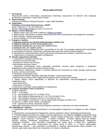 REGULAMIN WYŚCIGU I. Cel imprezy. Rozpoczęcie sezonu rowerowego, popularyzacja aktywnego wypoczynku na rowerach oraz integracja środowiska rowerzystów z terenu gminy Gniew II. Nazwa imprezy. „Wiosenny Przełajowy Wyścig Rowerowy”, zwany dalej Wyścigiem III. Organizator. Parafialny-Uczniowski Klub Sportowy „PIAST” adres: Piaseczno 11, 83-123 Piaseczno kontakt: [email protected], kom. 513 016 415 IV. Miejsce i termin Wyścigu. 1. Miejsce startu: Plac przy OSP w Rakowcu (zobacz na mapie) 2. Miejsce mety: Stare boisko na Bielicy (doprecyzowane przed rozpoczęciem poszczególnych wyścigów) 3. Biuro Wyścigu: siedziba organizatora 4. Termin Wyścigu: 27.04.2013 (sobota), V. Kategorie i dystans 1. Kategoria rodzinna, do 7 lat pod opieką dorosłych, dystans 2 km. 2. Kategoria dziecięca, od 8 do 10 lat, dystans 5 km. 3. Kategoria młodzieżowa, od 11 do 13 lat, dystans 10 km. 4. Kategoria open 13+, dystans 15 km. 5. W każdym wyścigu maksymalna ilość zawodników to 20 osób. W przypadku większej ilość zawodników w poszczególnym wyścigu Organizator zastrzega sobie prawo do zmiany podziału kategorii. 6. Zwycięzcami zostaną zawodnicy, którzy jako pierwsi pokonają trasę wyścigu i przekroczą linię mety. 7. Organizowany wyścig jest wyścigiem przełajowym. VI. Zasady rozgrywania zawodów. 1. Uczestnikom wyścigów zabrania się: • skracania wyznaczonej trasy, • korzystania z pomocy technicznej, • dokonywania wymiany roweru, • utrudniania wyprzedzania przez szybszego zawodnika, poprzez jazdę niezgodną z przepisami (zajeżdżanie drogi, gwałtowną zmianę kierunku jazdy). 2. Zawodnikom niebiorącym udziału w wyścigu zabrania się poruszania po trasie wyścigu podczas jego trwania, pod karą wykluczenia. 3. Zawodnicy zobowiązani są do: • respektowania poleceń Sędziego Głównego Wyścigu i komisji sędziowskiej, • stawienia się na miejscu startu najpóźniej pół godziny przed wyznaczonym startem. 4. Sędzia Główny może zastosować w stosunku do zawodników nieprzestrzegających przepisów następujące kary: • ustne upomnienie, • wykluczenie z wyścigu. 5. Zawodnicy otrzymują numery startowe od organizatora. VII. Program zawodów w dniu 27.04.2013r. Program zawodów : 10:00 – 11:00 zapisy 11:15 – start Kategorii open 13+ na trasie 15 km. 11:30 – start Kategorii młodzieżowej od 11 do 13 lat na trasie 10 km. 12:00 – start Kategorii dziecięcej, od 8 do 10 lat, dystans 5 km. 12:35 – start Kategorii rodzinnej do 7 lat pod opieką osób dorosłych na trasie 2 km. Po dotarciu na Metę, zimne napoje i poczęstunek. 13:30 - ogłoszenie wyników, wręczenie nagród. Organizator zastrzega możliwość zmiany programu zawodów, w zależności od liczby uczestników. VIII. Klasyfikacja i nagrody. 1. Klasyfikacja rajdu będzie przeprowadzona na poszczególne kategoriach ze względu na wiek i długość trasy. 2. Zwycięzcami w poszczególnych kategoriach zostaną zawodnicy, którzy najszybciej pokonają trasę. 3. W każdej kategorii pierwsze trzy miejsca zostaną nagrodzone. Za zdobycie I miejsca przewidziano kask rowerowy i zestaw oświetleniowy, za II miejsce - zestaw narzędzi rowerowych i zestaw oświetleniowy, za III miejsce - licznik rowerowy i ochraniacze - w każdej z kategorii . Ponadto nagrody takie jak medale, puchary, dyplomy. Dodatkowo przewidziano specjalne wyróżnienia w następujących kategoriach: "najstarszy uczestnik” - pod warunkiem uczestnictwa min. jednej osoby w wieku 50<, „najmłodszy uczestnik" – pod warunkiem uczestnictwa min. jednej osoby w wieku <7, a także "najliczniejsza reprezentacja rodziny" – pod warunkiem uczestnictwa w imprezie reprezentantów trzech pokoleń, np. dziecko, jego mama, jego babcia lub rodzeństwo, ich rodzice i dziadkowie. Organizator zastrzega brak możliwości wymiany nagród rzeczowych na ich równowartość w pieniądzu oraz dopuszcza konieczność pisemnego potwierdzenia ich odbioru. IX. Warunki uczestnictwa 1. Udział w Wyścigu jest bezpłatny 2. Prawo do startu w rajdzie mają osoby, które ukończyły 18 rok życia oraz zawodnicy niepełnoletni obowiązkowo za pisemną zgodą rodziców lub opiekunów prawnych. 3. Każdy uczestnik oświadcza na piśmie, że zna regulamin i startuje na własną odpowiedzialność. 4. Organizator zakłada się, że uczestnicy nie posiadają przeciwwskazań zdrowotnych uniemożliwiających im udział w Wyścigu. X. Informacje dodatkowe. 1.Wyścig odbędzie się bez względu na warunki atmosferyczne. 2.Organizator zastrzega sobie prawo do interpretacji i zmian niniejszego regulaminu. 3. Uczestnicy we własnym zakresie zapewniają dotarcie na i powrót z miejsca Wyścigu. 4. Organizatorzy nie ponoszą odpowiedzialności za zniszczenie, uszkodzenie czy zgubienie rowerów i rzeczy. XI. Zasady bezpieczeństwa. 1. Trasa będzie oznaczona w sposób, o którym Organizator poinformuje uczestników przed rozpoczęciem wyścigu. 2. Organizator poinformował służbę leśną a także pogotowie ratunkowe, straż pożarną, służbę leśną oraz policję o miejscu i terminie organizacji Wyścigu, tak aby służby te były przygotowane na ewentualną interwencję. 3. Organizator zaleca, aby zawodnicy biorący udział w Wyścigu korzystali z kasków. XI. Dane osobowe. Wszystkie dane podlegają ochronie przez ustawę o ochronie danych osobowych. Organizator gromadzi dane osobowe zawodników dla celów wyścigu i nie udostępnia ich osobom trzecim. Zawodnik zgłaszając się do udziału w wyścigu, zgadza się na wykorzystanie jego danych osobowych do celów informacyjnych i sprawozdawczych w zakresie niezbędnym do organizacji Wyścigu. W sposób jawny podane zostaną do wiadomości publicznej: imię, nazwisko, wiek zawodnika oraz kategoria startu i miejscowość zamieszkania. Udział w Wyścigu jest równoznaczny z wyrażeniem zgody na wykorzystanie wizerunku uczestnika Wyścigu w materiałach promocyjnych organizatora tej imprezy. WZORY OŚWIADCZEŃ Oś