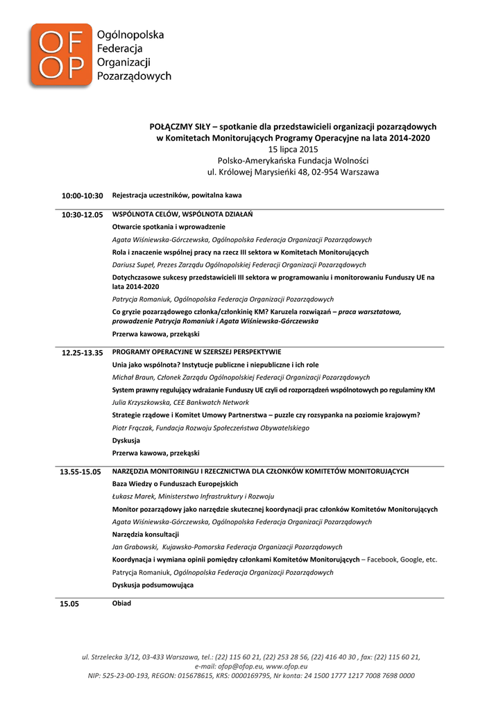 POŁĄCZMY SIŁY – spotkanie dla przedstawicieli organizacji pozarządowych w Komitetach Monitorujących Programy Operacyjne na lata 2014-2020 15 lipca 2015 Polsko-Amerykańska Fundacja Wolności ul. Królowej Marysieńki 48, 02-954 Warszawa 10:00-10:30 Rejestracja uczestników, powitalna kawa 10:30-12.05 WSPÓLNOTA CELÓW, WSPÓLNOTA DZIAŁAŃ Otwarcie spotkania i wprowadzenie Agata Wiśniewska-Górczewska, Ogólnopolska Federacja Organizacji Pozarządowych Rola i znaczenie wspólnej pracy na rzecz III sektora w Komitetach Monitorujących Dariusz Supeł, Prezes Zarządu Ogólnopolskiej Federacji Organizacji Pozarządowych Dotychczasowe sukcesy przedstawicieli III sektora w programowaniu i monitorowaniu Funduszy UE na lata 2014-2020 Patrycja Romaniuk, Ogólnopolska Federacja Organizacji Pozarządowych Co gryzie pozarządowego członka/członkinię KM? Karuzela rozwiązań – praca warsztatowa, prowadzenie Patrycja Romaniuk i Agata Wiśniewska-Górczewska Przerwa kawowa, przekąski 12.25-13.35 PROGRAMY OPERACYJNE W SZERSZEJ PERSPEKTYWIE Unia jako wspólnota? Instytucje publiczne i niepubliczne i ich role Michał Braun, Członek Zarządu Ogólnopolskiej Federacji Organizacji Pozarządowych System prawny regulujący wdrażanie Funduszy UE czyli od rozporządzeń wspólnotowych po regulaminy KM Julia Krzyszkowska, CEE Bankwatch Network Strategie rządowe i Komitet Umowy Partnerstwa – puzzle czy rozsypanka na poziomie krajowym? Piotr Frączak, Fundacja Rozwoju Społeczeństwa Obywatelskiego Dyskusja Przerwa kawowa, przekąski 13.55-15.05 NARZĘDZIA MONITORINGU I RZECZNICTWA DLA CZŁONKÓW KOMITETÓW MONITORUJĄCYCH Baza Wiedzy o Funduszach Europejskich Łukasz Marek, Ministerstwo Infrastruktury i Rozwoju Monitor pozarządowy jako narzędzie skutecznej koordynacji prac członków Komitetów Monitorujących Agata Wiśniewska-Górczewska, Ogólnopolska Federacja Organizacji Pozarządowych Narzędzia konsultacji Jan Grabowski, Kujawsko-Pomorska Federacja Organizacji Pozarządowych Koordynacja i wymiana opinii pomiędzy członkami Komitetów Monitorujących – Facebook, Google, etc. Patrycja Romaniuk, Ogólnopolska Federacja Organizacji Pozarządowych Dyskusja podsumowująca 15.05 Obiad ul. Strzelecka 3/12, 03-433 Warszawa, tel.: (22) 115 60 21, (22) 253 28 56, (22) 416 40 30 , fax: (22) 115 60 21, e-mail: [email protected], www.ofop.eu NIP: 525-23-00-193, REGON: 015678615, KRS: 0000169795, Nr konta: 24 1500 1777 1217 7008 7698 0000 Informacje dodatkowe: Kontakt do organizatorów: Agata Wiśniewska-Górczewska, tel. 601 719 488, [email protected] Patrycja Romaniuk, tel. 603 640 268, [email protected] Mapka dojazdu do PAFW znajduje się poniżej. Przydatne linki dla osób korzystających z transportu publicznego: Rozkład jazdy pociągów: http://www.rozklad.pkp.pl/ Rozkłady jazdy i trasy przejazdów komunikacji miejskiej w Warszawie: www.ztm.waw.pl Wyszukiwarka połączeń w Warszawie: http://warszawa.jakdojade.pl/ Spotkanie jest współfinansowane w ramach Programu „Wspieranie organizacji pozarządowych” Polsko-Amerykańskiej Fundacji Wolności. ul. Strzelecka 3/12, 03-433 Warszawa, tel.: (22) 115 60 21, (22) 253 28 56, (22) 416 40 30 , fax: (22) 115 60 21, e-mail: [email protected], www.ofop.eu NIP: 525-23-00-193, REGON: 015678615, KRS: 0000169795, Nr konta: 24 1500 1777 1217 7008 7698 0000