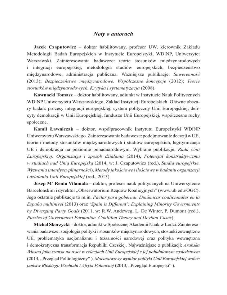 Noty o autorach Jacek Czaputowicz – doktor habilitowany, profesor UW, kierownik Zakładu Metodologii Badań Europejskich w Instytucie Europeistyki, WDiNP, Uniwersytet Warszawski. Zainteresowania badawcze: teorie stosunków międzynarodowych i integracji europejskiej, metodologia studiów europejskich, bezpieczeństwo międzynarodowe, administracja publiczna. Ważniejsze publikacje: Suwerenność (2013); Bezpieczeństwo międzynarodowe. Współczesne koncepcje (2012); Teorie stosunków międzynarodowych. Krytyka i systematyzacja (2008). Kownacki Tomasz – doktor habilitowany, adiunkt w Instytucie Nauk Politycznych WDiNP Uniwersytetu Warszawskiego, Zakład Instytucji Europejskich. Główne obszary badań: procesy integracji europejskiej, system polityczny Unii Europejskiej, deficyty demokracji w Unii Europejskiej, fundusze Unii Europejskiej, współczesne ruchy społeczne. Kamil Ławniczak – doktor, współpracownik Instytutu Europeistyki WDiNP Uniwersytetu Warszawskiego. Zainteresowania badawcze: podejmowanie decyzji w UE, teorie i metody stosunków międzynarodowych i studiów europejskich, legitymizacja UE i demokracja na poziomie ponadnarodowym. Wybrane publikacje: Rada Unii Europejskiej. Organizacja i sposób działania (2014), Potencjał konstruktywizmu w studiach nad Unią Europejską (2014, w: J. Czaputowicz (red.), Studia europejskie. Wyzwania interdyscyplinarności), Metody jakościowe i ilościowe w badaniu organizacji i działania Unii Europejskiej (red., 2013). Josep Mª Reniu Vilamala – doktor, profesor nauk politycznych na Uniwersytecie Barcelońskim i dyrektor „Obserwatorium Rządów Koalicyjnych” (www.ub.edu/OGC). Jego ostatnie publikacje to m.in. Pactar para gobernar. Dinámicas coalicionales en la España multinivel (2013) oraz ‘Spain is Different’: Explaining Minority Governments by Diverging Party Goals (2011, w: R.W. Andeweg, L. De Winter, P. Dumont (red.), Puzzles of Government Formation. Coalition Theory and Deviant Cases). Michał Skorzycki – doktor, adiunkt w Społecznej Akademii Nauk w Łodzi. Zainteresowania badawcze: socjologia polityki i stosunków międzynarodowych, stosunki zewnętrzne UE, problematyka nacjonalizmu i tożsamości narodowej oraz polityka wewnętrzna i demokratyczna transformacja Republiki Czeskiej. Najważniejsze z publikacji: Arabska Wiosna jako szansa na reset w relacjach Unii Europejskiej z jej południowym sąsiedztwem (2014, „Przegląd Politologiczny” ), Mocarstwowy wymiar polityki Unii Europejskiej wobec państw Bliskiego Wschodu i Afryki Północnej (2013, „Przegląd Europejski” ). Rafał Ulatowski – doktor, adiunkt w Instytucie Stosunków Międzynarodowych WDiNP Uniwersytetu Warszawskiego. Stopień doktora uzyskał w 2011 na Uniwersytecie w Bonn na podstawie rozprawy Die deutsch-polnischen Wirtschaftsbeziehungen in der europäischen Perspektive: 1990–2007. Stypendysta Fundacji Adenauera (2007– 2011), DAAD (2013 oraz 2014/2015) oraz czwartego konkursu na zagraniczne staże dla młodych doktorów w ramach Programu Nowoczesny Uniwersytet UW. Visiting Scholar na Kyungpook National University w Republice Korei. Zainteresowania badawcze: polityka zagraniczna Niemiec, gospodarka światowa, polsko-niemieckie stosunki gospodarcze, integracja europejska. Anna Wierzchowska – doktor, adiunkt w Instytucie Nauk Politycznych WDiNP Uniwersytetu Warszawskiego, w Zakładzie Instytucji Europejskich. Zainteresowania badawcze: system polityczny UE; rozwój instytucjonalny UE; teoria i praktyka demokracji; współczesne ruchy społeczne. Najważniejsze publikacje: System instytucjonalny Unii Europejskiej (2008); Studia europejskie z perspektywy nauk politycznych (2010, w: K.A. Wojtaszczyk, W. Jakubowski (red.), Studia europejskie. Zagadnienia metodologiczne); Istota zjawiska modernizacji. Modernizacja w kontekście procesu integracji europejskiej oraz Podmioty modernizacji (2011, w: K.A. Wojtaszczyk (red.), Modernizacja Unii Europejskiej); Deficyt demokracji a reprezentatywność i legitymizacja instytucji unijnych (2012, w: K.A. Wojtaszczyk, J. Szymańska (red.), Deficyt demokracji w Unii Europejskiej). About the authors Jacek Czaputowicz – Habilitated Doctor, an associate professor and the head of the Section of European Research Methodology of the Institute of European Studies, Faculty of Journalism and Political Science, University of Warsaw. Research interest: theories of international relations and European integration, international security, public administration. Important publications: Sovereignty (2013, in Polish); International security. Contemporary concepts (2012, in Polish); Theories of international relations. Critique and systematisation (2008, in Polish). Tomasz Kownacki – Habilitated doctor, an assistant professor at the Institute of Political Science, Faculty of Journalism and Political Science, University of Warsaw. Research interests: democratic deficit in the European Union, EU funds, contemporary social movements. Kamil Ławniczak – PhD, a research and teachingcontractor at the Institute of European Studies, Faculty of Journalism and Political Science, University of Warsaw. Research interests: decision making in the EU, theories and methods in IR and European studies, EU legitimacy and supranational democracy. Recent conference papers: Socialisation and Decision Making in the Council of the European Union (2014, CEEISA Convention), The state of European studies in Poland – analysis of PhD theses and scientific articles (2014, with J. Czaputowicz, ECPR General Conference). Josep Mª Reniu Vilamala – PhD in Political Science, a professor of political science at the University of Barcelona and the director of the “Observatory of Coalition Governments” (www.ub.edu/OGC). His latest works include Pactar para gobernar. Dinámicas coalicionales en la España multinivel (2013) and ‘Spain is Different’: Explaining Minority Governments by Diverging Party Goals (2011, in: R.W. Andeweg, L. De Wi