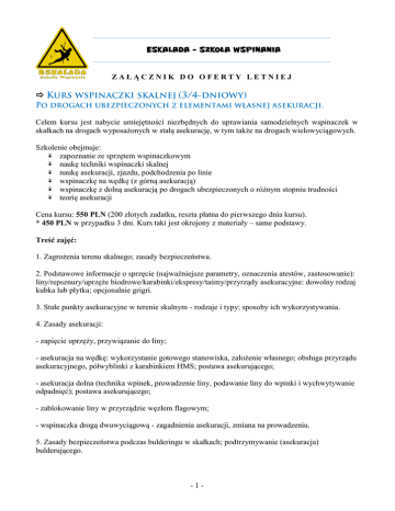 ESKALADA – SZKOŁA WSPINANIA ZAŁĄCZNIK DO OFERTY LETNIEJ Celem kursu jest nabycie umiejętności niezbędnych do uprawiania samodzielnych wspinaczek w skałkach na drogach wyposażonych w stałą asekurację, w tym także na drogach wielowyciągowych. Szkolenie obejmuje: q zapoznanie ze sprzętem wspinaczkowym q naukę techniki wspinaczki skalnej q naukę asekuracji, zjazdu, podchodzenia po linie q wspinaczkę na wędkę (z górną asekuracją) q wspinaczkę z dolną asekuracją po drogach ubezpieczonych o różnym stopniu trudności q teorię asekuracji Cena kursu: 550 PLN (200 złotych zadatku, reszta płatna do pierwszego dnia kursu). * 450 PLN w przypadku 3 dni. Kurs taki jest okrojony z materiały – same podstawy. Treść zajęć: 1. Zagrożenia terenu skalnego; zasady bezpieczeństwa. 2. Podstawowe informacje o sprzęcie (najważniejsze parametry, oznaczenia atestów, zastosowanie): liny/repsznury/uprzęże biodrowe/karabinki/ekspresy/taśmy/przyrządy asekuracyjne: dowolny rodzaj kubka lub płytka; opcjonalnie grigri. 3. Stałe punkty asekuracyjne w terenie skalnym - rodzaje i typy; sposoby ich wykorzystywania. 4. Zasady asekuracji: - zapięcie uprzęży, przywiązanie do liny; - asekuracja na wędkę: wykorzystanie gotowego stanowiska, założenie własnego; obsługa przyrządu asekuracyjnego, półwyblinki z karabinkiem HMS; postawa asekurującego; - asekuracja dolna (technika wpinek, prowadzenie liny, podawanie liny do wpinki i wychwytywanie odpadnięć); postawa asekurującego; - zablokowanie liny w przyrządzie węzłem flagowym; - wspinaczka drogą dwuwyciągową - zagadnienia asekuracji, zmiana na prowadzeniu. 5. Zasady bezpieczeństwa podczas bulderingu w skałkach; podtrzymywanie (asekuracja) bulderującego. -1- 6. Węzły i ich zastosowanie: ósemka, kluczka, taśmowy (równoległy), półwyblinka, wyblinka, flagowy, węzły zaciskowe, podwójny zderzakowy. Zwijanie i przenoszenie liny. 7. Nauczanie techniki wspinania: - wykorzystanie chwytów i stopni; - ustawienia ciała: pozycja frontalna i boczna; - technika skrętna/krzyżowa/rozpieraczki/na odciąg; - wspinaczka statyczna i dynamiczna; - zapoznanie z różnymi formacjami skalnymi i optymalnymi technikami ich pokonywania. 8. Podstawy technik linowych: - zjazdy na linie w wysokim przyrządzie - gotowe stanowiska zjazdowe; zjazd z pośrednim stanowiskiem; - zjazd na linie w dolnym przyrządzie. 9. Skale trudności używane w skałkach. Przewodniki i rejony wspinaczkowe. 10. Zasady uprawiania wspinaczki w Polsce, system szkolenia. -2- Celem kursu jest opanowanie wszelkich umiejętności niezbędnych do uprawiania samodzielnych wspinaczek w skałkach. Założeniem tego szkolenia jest również solidne przygotowanie do Kursu Wysokogórskiego (tatrzańskiego). Szkolenie obejmuje: q zapoznanie ze sprzętem wspinaczkowym q naukę techniki wspinaczki skalnej q naukę asekuracji, zjazdu, podchodzenia po linie q wspinaczkę na wędkę (z górną asekuracją) q wspinaczkę z dolną asekuracją po drogach ubezpieczonych i nie ubezpieczonych o różnym stopniu trudności q teorię asekuracji Zaliczenie szkolenia jest równoznaczne z otrzymaniem świadectwa ukończenia kursu wspinaczki skalnej uprawniającego do uczestnictwa w kursie tatrzańskim. Cena kursu: 500 PLN (150 złotych zadatku, reszta płatna do pierwszego dnia kursu). Program kursu wymaga znajomości materiału z zakres kursu 4-dniowego po drogach ubezpieczonych, poszerzony dodatkowo o 3-dniowe szkolenie z: 1. Sprzęt niezbędny do samodzielnego instalowania punktów asekuracyjnych (kostki, kostki mechaniczne itp.). 2. Normy etyczne obowiązujące w środowisku wspinaczy, zagadnienia ochrony przyrody. 3. Dobieranie sprzętu do konkretnej drogi i poprawne noszenie go; 4. Samodzielne zakładanie punktów asekuracyjnych (kostki, kostki mechaniczne itp.); - wykorzystanie punktów naturalnych; - łączenie punktów asekuracyjnch; - budowanie stanowisk asekuracyjnych dolnych, górnych i pośrednich. 5. Obsługa 2 przyrządów asekuracyjnych w zakresie podawania, wybierania, hamowania liny oraz jej blokowania i odblokowania; przyrządy: kubek lub płytka, półwyblinka z karabinkiem HMS; opcjonalnie grigri. 6. Właściwe rozmieszczanie punktów przelotowych. 7. Prawidłowe prowadzenie liny jednożyłowej; opcjonalnie dodatkowo dwużyłowej. 8. Wychodzenie po linie (prusikowanie). 9. Zjazdy; - zakładanie stanowisk zjazdowych; -3- - zjazd w wysokim przyrządzie wraz z odpowiednią autoasekuracją; - rozwiązywanie prostych sytuacji awaryjnych w trakcie zjazdu; - uwalnianie się na stanowisku od ciężaru wiszącego partnera. Cel obozu jest podniesienie umiejętności wspinaczkowych, nauka samodzielnej wspinaczki w skałkach, jak i też wyeliminowanie błędów czynionych podczas wspinaczki w skałach. Program obozu obejmuje: q podniesienie poziomu wspinania (OS, flash, RP) q doskonalenie umiejętności q budowanie stanowisk q węzły q zjazdy na linie q zastosowanie przyrządów asekuracyjno-zjazdowych q nauka bezpiecznych odpadnięć q wspinaczka dwuwyciągowa q elementy autoratownictwa – szkolenie z udzielanie pierwszej pomocy –GOPR* Możliwe jest zorganizowania u Grupy Jurajskiej GOPR szkolenia z udzielania pierwszej pomocy. Szkolenie dodatkowo płatne: 2-3h - wydany dyplom ukończenia - przy 6 osobach - płatne ~60 zł./os. -4-