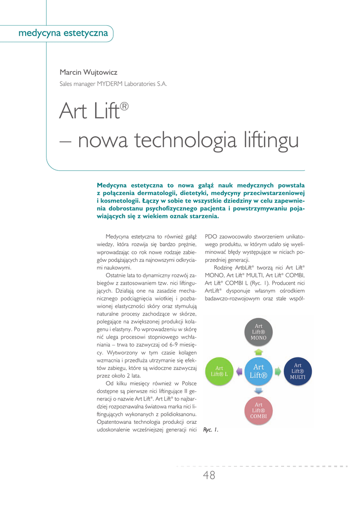medycyna estetyczna Marcin Wujtowicz Sales manager MYDERM Laboratories S.A. Art Lift® – nowa technologia liftingu Medycyna estetyczna to nowa gałąź nauk medycznych powstała z połączenia dermatologii, dietetyki, medycyny przeciwstarzeniowej i kosmetologii. Łączy w sobie te wszystkie dziedziny w celu zapewnienia dobrostanu psychofizycznego pacjenta i powstrzymywaniu pojawiających się z wiekiem oznak starzenia. Medycyna estetyczna to również gałąź wiedzy, która rozwija się bardzo prężnie, wprowadzając co rok nowe rodzaje zabiegów podążających za najnowszymi odkryciami naukowymi. Ostatnie lata to dynamiczny rozwój zabiegów z zastosowaniem tzw. nici liftingujących. Działają one na zasadzie mechanicznego podciągnięcia wiotkiej i pozbawionej elastyczności skóry oraz stymulują naturalne procesy zachodzące w skórze, polegające na zwiększonej produkcji kolagenu i elastyny. Po wprowadzeniu w skórę nić ulega procesowi stopniowego wchłaniania – trwa to zazwyczaj od 6-9 miesięcy. Wytworzony w tym czasie kolagen wzmacnia i przedłuża utrzymanie się efektów zabiegu, które są widoczne zazwyczaj przez około 2 lata. Od kilku miesięcy również w Polsce dostępne są pierwsze nici liftingujące II generacji o nazwie Art Lift®. Art Lift® to najbardziej rozpoznawalna światowa marka nici liftingujących wykonanych z polidioksanonu. Opatentowana technologia produkcji oraz udoskonalenie wcześniejszej generacji nici PDO zaowocowało stworzeniem unikatowego produktu, w którym udało się wyeliminować błędy występujące w niciach poprzedniej generacji. Rodzinę ArtbLift® tworzą nici Art Lift® MONO, Art Lift® MULTI, Art Lift® COMBI, Art Lift® COMBI L (Ryc. 1). Producent nici ArtLift® dysponuje własnym ośrodkiem badawczo-rozwojowym oraz stale współ- Ryc. 1. 48 pracuje z wiodącymi placówkami naukowymi na całym świecie. Wszystko to w celu zapewnienia najwyższej jakości oferowanych produktów oraz wdrażaniu nowych rozwiązań dających lepsze efekty estetyczne dla pacjenta. Dzięki temu produkty ArtLift® cechuje najwyższa jakość wykonania oraz wysoki profil bezpieczeństwa - cechy najistotniejsze w odniesieniu do wszystkich produktów stosowanych w medycynie estetycznej. Wszystkie nici z rodziny Art Lift® wykazują wspólne cechy: 1. natychmiastową korektę defektu estetycznego, 2. trwałość i przewidywalność efektu, 3. zminimalizowanie dyskomfortu zabiegu dzięki opatentowanemu systemowi atraumatycznej igły, 4. nici polidioksanonowe o zoptymalizowanej grubości, dzięki której możliwe jest osiągnięcie maksymalnego efektu zabiegu. Ce chy te są ewo lu cyj nym na stęp stwem badań prowadzonych na niciach polidioksanonowych I generacji, które stosowane są w zabiegach estetycznych od 2008 roku. O wyjątkowości nici Art Lift® świadczy fakt opatentowania procesu produkcji samego włókna polidioksanonowego, które w odróżnieniu od produktów konkurencji jest zbudowane z polimeru złożonego z makromolekuł polidioksanonu, taka budowa zapewnia lepsze właściwości stymulowania produkcji nowego kolagenu w miejscu zaimplantowania nici oraz zapewnia kontrolowany rozkład substancji bez ryzyka kapsulacji i tworzenia zrostów pozabiegowych. Igły stosowane w systemie Art Lift® są specjalnymi igłami o minimalnym stopniu traumatyzowania tkanek, wielokrotne szlifowanie ostrza oraz cienkościenność kanału igły sprawiają, że zabieg jest bardziej komfortowy zarówno dla lekarza, jak i pacjenta. Jak przedstawiają badania porównawcze produktów Art Lift® z pozostałymi nićmi polidioksanonowymi, taka budowa igły zmniejsza ryzyko obrzęków po za bie go wych o oko ło 60%. Zmniejsza się również ryzyko krwawień, a odczuwalny przez pacjenta dyskomfort w trakcie zabiegu jest oceniany przez ponad 80% badanych w przedziale 2-3 w 10stopniowej skali bólu. Kolejną innowacją zastosowaną w niciach Art Lift® jest sposób przeprowadzenia zabiegu. Dotychczas wszystkie nici polidioksanonowe były wprowadzane w skórę poprzez jedno nakłucie skóry i wprowadzenie linijne nici wzdłuż określonych wektorów napięcia skóry. Art Lift® łamie dotychczasowe zasady, umożliwiając wprowadzenie i wykłucie igły oraz przeciągnięcie nici polidioksanowej pomiędzy dwoma skrajnymi punktami obejmującymi korygowany obszar. Dzięki takiej innowacji możliwe jest uzyskanie optymalnej korekty przy zastosowaniu minimalnej ilości nici, co przekłada się na praktycznie bezbolesne przeprowadzenie zabiegu i brak powikłań pod postacią obrzęków czy krwiaków – tak charakterystycznych dla nici I generacji. Art Lift® MONO To najprostsza i podstawowa nić Art Line® Series. Nici Art Lift® MONO może być stosowana do korekty twarzy i ciała. Idea stosowania nici MONO nawiązuje do zabiegów wykonywanych nićmi polidioksanonowymi I generacji. Igłę zastosowaną w niciach Art Lift® MONO cechuje ostry koniec o specjalnej, opatentowanej powierzchni ostrza – w celu maksymalnego zmniejszenia traumatyzacji tkanek w trakcie zabiegu oraz optymalna równowaga między plastycznością i sztywnością igły – w zdecydowany sposób zwiększa to komfort pracy lekarza w porów- 50 Ryc. 2. naniu z produktami o igle zbyt miękkiej lub zbyt twardej. Art Lift® MULTI To typowy przedstawiciel nici liftingujących II generacji. Unikatowy, opatentowany sy stem ni ci po li dio ksa no no wej zło żo ny z dwudziestu skręconych monofilamentów (Ryc. 2). Taka budowa nici umożliwia lepszą odpowiedź ze strony organizmu pod postacią produkcji kolagenu, działa również w podobny sposób jak stosowane dotychczas nici SCREW lub DS, liftingując w łagodny sposób wiotką i pozbawioną elastyczności skórę. Najważniejszą jednak cechą nici Ryc. 3. 51 Art Lift® MULTI jest zdolność do samorozprężania się w tkankach i w efekcie unoszenia powierzchni zapadniętej skóry (Ryc. 3).Ta cecha produktu powoduje, że Art Lift® MULTI jest najwszechstronni