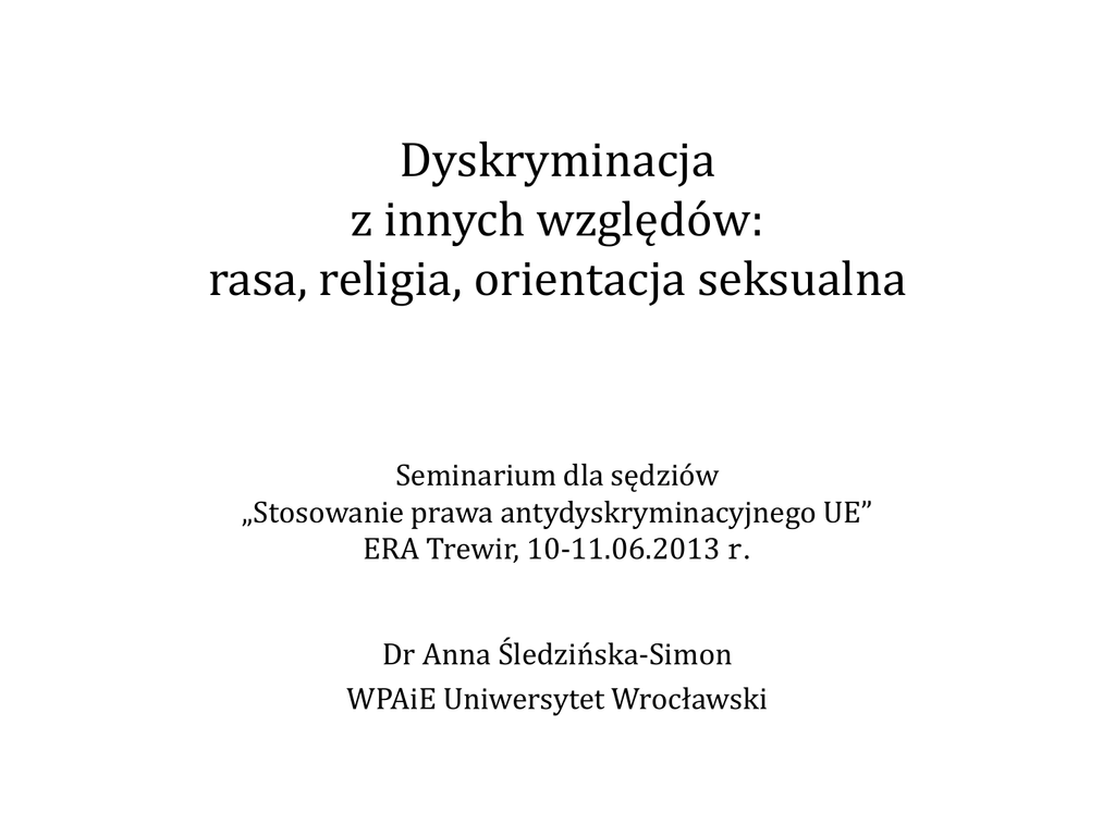 Dyskryminacja z innych względów: rasa, religia, orientacja seksualna Seminarium dla sędziów „Stosowanie prawa antydyskryminacyjnego UE” ERA Trewir, 10-11.06.2013 r. Dr Anna Śledzińska-Simon WPAiE Uniwersytet Wrocławski Rola sędziego w orzekaniu spraw z zakresu dyskryminacji Znać i stosować: • Prawo UE (zasada pierwszeństwa i bezpośredniego stosowania) oraz orzecznictwo Trybunału Sprawiedliwości UE • Prawo międzynarodowe (konwencje ONZ i Rady Europy) oraz orzecznictwo organów sądowych i quasi-sądowych w sprawach indywidualnych lub zbiorowych naruszeń praw jednostki Interpretować prawo krajowe w zgodzie ze prawem UE i prawem międzynarodowym Zadawać pytania prejudycjalne dotyczące ważności i wiążącej interpretacji prawa UE Nadawać skuteczność wyrokom sądów międzynarodowych Wielopoziomowa ochrona przed dyskryminacją ONZ • Międzynarodowy Pakt Praw Obywatelskich i Politycznych (1966) + indywidualna skarga do Komitetu Praw Człowieka • Konwencja ws. Likwidacji Dyskryminacji Rasowej (1965) + indywidualna skarga do Komitetu Dyskryminacji Rasowej • Inne konwencje i mechanizmy skargowe: CEDAW, CRC, CRPD, itd RADA EUROPY • Europejska Konwencja Praw Człowieka (1950) • Protokoły dodatkowe, w tym Protokół Nr 12 (2000) + indywidualna skarga do Europejskiego Trybunału Praw Człowieka • Europejska Karta Socjalna (1996) + skarga zbiorowa do Europejskiego Komitetu Praw Socjalnych Klauzule antydyskryminacyjne w pierwotnym prawie UE • Art. 10 TFUE zwalczanie dyskryminacji ze względu na płeć, rasę lub pochodzenie etniczne, religię lub światopogląd, niepełnosprawność, wiek i orientację seksualną we wszystkich działaniach i politykach UE. • Art. 19 TFUE kompetencja do podejmowania środków w celu zwalczania dyskryminacji ze względów wskazanych wyżej oraz harmonizacji prawa państw członkowskich w tym obszarze • Art. 21 Karty Praw Podstawowych Zakaz wszelkiej dyskryminacji w szczególności ze względu na płeć, rasę, kolor skóry, pochodzenie etniczne lub społeczne, cechy genetyczne, język , religię lub przekonania, poglądy polityczne lub wszelkie inne poglądy, przynależność do mniejszości narodowej, majątek, urodzenie, niepełnosprawność, wiek lub orientację seksualną. Prawo wtórne UE w zakresie równego traktowania ze względu na rasę, religię i orientację seksualną • Dyrektywa Równości Rasowej - Dyrektywa Rady 2000/43/WE z dnia 29 czerwca 2000 r. wprowadzająca w życie zasadę równego traktowania osób bez względu na pochodzenie rasowe lub etniczne • Dyrektywa Ramowa - Dyrektywa Rady 2000/78/WE z dnia 27 listopada 2000 r. ustanawiająca ogólne warunki ramowe równego traktowania w zakresie zatrudnienia i pracy • w oczekiwaniu: • projekt Komisji Europejskiej z 2 lipca 2008 r. – Dyrektywa Rady w sprawie wprowadzenia w życie zasady równego traktowania osób bez względu na religię lub światopogląd, niepełnosprawność, wiek lub orientację seksualną, KOM (2008) 426. Dyrektywa Równości Rasowej 2000/43/WE • Dyskryminacja bezpośrednia i pośrednia • Molestowanie, nakłanianie do dyskryminacji • Zakres przedmiotowy – bardzo szeroki – zastosowanie do sektora publicznego i prywatnego • Istotne i determinujące wymagania zawodowe • Działania pozytywne • Minimalne wymagania na poziomie krajowym • Skuteczne środki odwoławcze • Przeniesienie ciężaru dowodu • Zakaz wiktymizacji • Utworzenie organu ds. równego traktowania Dyrektywa Równości Rasowej 2000/43/WE Zakres przedmiotowy: - warunki dostępu do zatrudnienia, wykonywania pracy na własny rachunek i wykonywania zawodu, w tym kryteria selekcji i warunki rekrutacji - dostęp do szkolenia zawodowego - warunki zatrudnienia i pracy - członkostwo w związkach zawodowych - ochrony społecznej, zabezpieczenia społecznego i ochrony zdrowia - świadczeń społecznych - szkolnictwa - dostępu do dóbr i usług publicznie dostępnych, w tym mieszkalnictwa. Dyrektywa Ramowa 2000/78/WE • Dyskryminacja bezpośrednia i pośrednia • Molestowanie, nakłanianie do dyskryminacji • Zakres przedmiotowy – wąski, ale zastosowanie do sektora publicznego i prywatnego • Istotne i determinujące wymagania zawodowe • Działania pozytywne • Minimalne wymagania na poziomie krajowym • Skuteczne środki odwoławcze • Przeniesienie ciężaru dowodu • Zakaz wiktymizacji Dyrektywa Ramowa 2000/78/WE • Zakaz dyskryminacji ze względu na religię lub światopogląd, niepełnosprawność, wiek i orientację seksualną • Zakres przedmiotowy - warunki dostępu do zatrudnienia, wykonywania pracy na własny rachunek i wykonywania zawodu, w tym kryteria selekcji i warunki rekrutacji - dostęp do szkolenia zawodowego - warunki zatrudnienia i pracy - członkostwo w związkach zawodowych • Brak postępu ws. przyjęcia dyrektywy horyzontalnej (!) Hierarchia cech prawnie chronionych w UE PRZYNALEŻNOŚĆ PAŃSTWOWA RASA I POCHODZENIE ETNICZNE PŁEĆ RELIGIA, NIEPEŁNOSPRAWNOŚĆ, WIEK, ORIENTACJA SEKSUALNA Hierarchia cech prawnie chronionych UE ZATRUDNIENIE ZABEZPIECZENIE DOSTĘP DO SPOŁECZNE DÓBR I USŁUG SZKOLNICTWO RASA I POCHODZENIE ETNICZNE 2000/43/WE 2000/43/WE 2000/43/WE 2000/43/WE PŁEĆ 2006/54/WE 79/7/EWG 2004/113/WE 2000/78/WE RELIGIA NIEPEŁNOSPRA WNOŚĆ WIEK ORIENTACJA SEKSUALNA Skutki hierarchii cech prawnie chronionych w prawie krajowym • Jeżeli przyjęto standard minimalny: • brak ochrony przed dyskryminacją ze względu na religię lub światopogląd, niepełnosprawność, wiek lub orientację seksualną w zakresie: • ochrony społecznej, zabezpieczenia społecznego i ochrony zdrowia • świadczeń społecznych • szkolnictwa • dostępu do dóbr i usług publicznie dostępnych, w tym mieszkalnictwa Klauzule antydyskryminacyjne w EKPCz • Art. 14 EKPCz Korzystanie z praw i wolności wymienionych w niniejszej Konwencji powinno być zapewnione bez dyskryminacji wynikającej z takich powodów jak płe