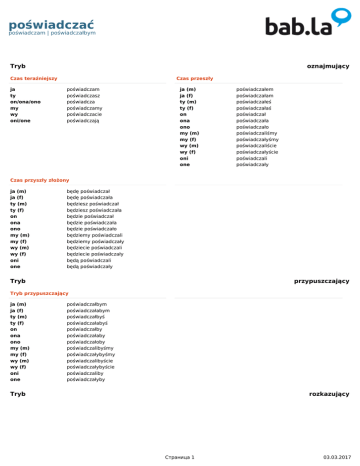 poświadczać poświadczam | poświadczałbym Tryb oznajmujący Czas teraźniejszy ja ty on/ona/ono my wy oni/one Czas przeszły poświadczam poświadczasz poświadcza poświadczamy poświadczacie poświadczają ja (m) ja (f) ty (m) ty (f) on ona ono my (m) my (f) wy (m) wy (f) oni one poświadczałem poświadczałam poświadczałeś poświadczałaś poświadczał poświadczała poświadczało poświadczaliśmy poświadczałyśmy poświadczaliście poświadczałyście poświadczali poświadczały Czas przyszły złożony ja (m) ja (f) ty (m) ty (f) on ona ono my (m) my (f) wy (m) wy (f) oni one będę poświadczał będę poświadczała będziesz poświadczał będziesz poświadczała będzie poświadczał będzie poświadczała będzie poświadczało będziemy poświadczali będziemy poświadczały będziecie poświadczali będziecie poświadczały będą poświadczali będą poświadczały Tryb przypuszczający Tryb przypuszczający ja (m) ja (f) ty (m) ty (f) on ona ono my (m) my (f) wy (m) wy (f) oni one poświadczałbym poświadczałabym poświadczałbyś poświadczałabyś poświadczałby poświadczałaby poświadczałoby poświadczalibyśmy poświadczałybyśmy poświadczalibyście poświadczałybyście poświadczaliby poświadczałyby Tryb rozkazujący Страница 1 03.03.2017 poświadczać poświadczam | poświadczałbym Tryb rozkazujący ty on/ona/ono my wy oni/one poświadczaj niech poświadcza poświadczajmy poświadczajcie niech poświadczają Imiesłowy Imiesłów przymiotnikowy teraźniejszy czynny poświadczający Imiesłów przymiotnikowy przeszły bierny poświadczany Imiesłów przysłówkowy współczesny poświadczając Страница 2 Powered by TCPDF (www.tcpdf.org) 03.03.2017