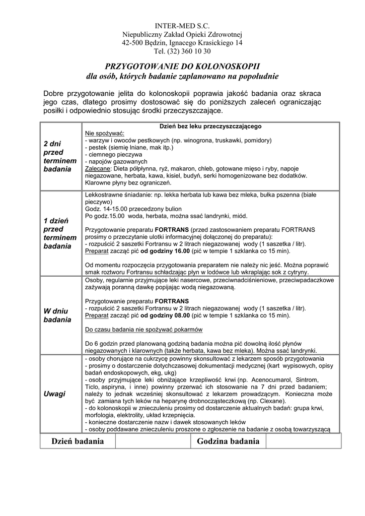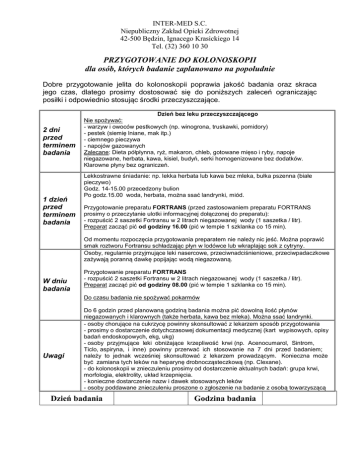 INTER-MED S.C. Niepubliczny Zakład Opieki Zdrowotnej 42-500 Będzin, Ignacego Krasickiego 14 Tel. (32) 360 10 30 PRZYGOTOWANIE DO KOLONOSKOPII dla osób, których badanie zaplanowano na popołudnie Dobre przygotowanie jelita do kolonoskopii poprawia jakość badania oraz skraca jego czas, dlatego prosimy dostosować się do poniższych zaleceń ograniczając posiłki i odpowiednio stosując środki przeczyszczające. 2 dni przed terminem badania 1 dzień przed terminem badania Dzień bez leku przeczyszczającego Nie spożywać: - warzyw i owoców pestkowych (np. winogrona, truskawki, pomidory) - pestek (siemię lniane, mak itp.) - ciemnego pieczywa - napojów gazowanych Zalecane: Dieta półpłynna, ryż, makaron, chleb, gotowane mięso i ryby, napoje niegazowane, herbata, kawa, kisiel, budyń, serki homogenizowane bez dodatków. Klarowne płyny bez ograniczeń. Lekkostrawne śniadanie: np. lekka herbata lub kawa bez mleka, bułka pszenna (białe pieczywo) Godz. 14-15.00 przecedzony bulion Po godz.15.00 woda, herbata, można ssać landrynki, miód. Przygotowanie preparatu FORTRANS (przed zastosowaniem preparatu FORTRANS prosimy o przeczytanie ulotki informacyjnej dołączonej do preparatu): - rozpuścić 2 saszetki Fortransu w 2 litrach niegazowanej wody (1 saszetka / litr). Preparat zacząć pić od godziny 16.00 (pić w tempie 1 szklanka co 15 min). Od momentu rozpoczęcia przygotowania preparatem nie należy nic jeść. Można poprawić smak roztworu Fortransu schładzając płyn w lodówce lub wkraplając sok z cytryny. Osoby, regularnie przyjmujące leki nasercowe, przeciwnadciśnieniowe, przeciwpadaczkowe zażywają poranną dawkę popijając wodą niegazowaną. W dniu badania Przygotowanie preparatu FORTRANS - rozpuścić 2 saszetki Fortransu w 2 litrach niegazowanej wody (1 saszetka / litr). Preparat zacząć pić od godziny 08.00 (pić w tempie 1 szklanka co 15 min). Do czasu badania nie spożywać pokarmów Uwagi Do 6 godzin przed planowaną godziną badania można pić dowolną ilość płynów niegazowanych i klarownych (także herbata, kawa bez mleka). Można ssać landrynki. - osoby chorujące na cukrzycę powinny skonsultować z lekarzem sposób przygotowania - prosimy o dostarczenie dotychczasowej dokumentacji medycznej (kart wypisowych, opisy badań endoskopowych, ekg, ukg) - osoby przyjmujące leki obniżające krzepliwość krwi (np. Acenocumarol, Sintrom, Ticlo, aspiryna, i inne) powinny przerwać ich stosowanie na 7 dni przed badaniem; należy to jednak wcześniej skonsultować z lekarzem prowadzącym. Konieczna może być zamiana tych leków na heparynę drobnocząsteczkową (np. Clexane). - do kolonoskopii w znieczuleniu prosimy od dostarczenie aktualnych badań: grupa krwi, morfologia, elektrolity, układ krzepnięcia. - konieczne dostarczenie nazw i dawek stosowanych leków - osoby poddawane znieczuleniu proszone o zgłoszenie na badanie z osobą towarzyszącą Dzień badania Godzina badania