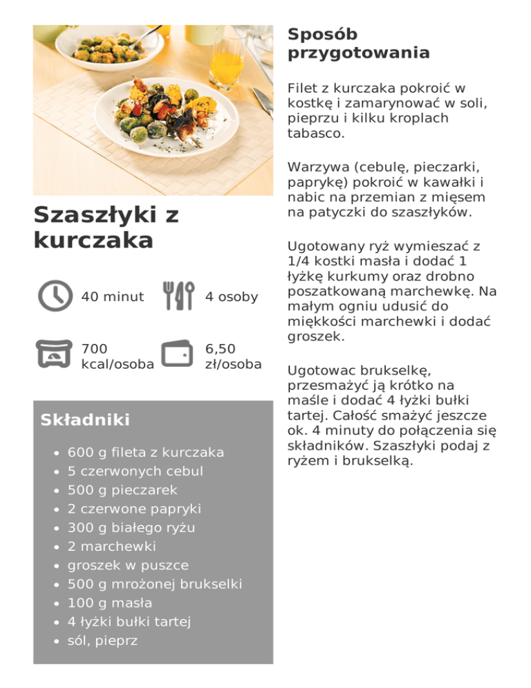 Sposób przygotowania Filet z kurczaka pokroić w kostkę i zamarynować w soli, pieprzu i kilku kroplach tabasco. Warzywa (cebulę, pieczarki, paprykę) pokroić w kawałki i nabic na przemian z mięsem na patyczki do szaszłyków. Szaszłyki z kurczaka 40 minut 4 osoby 700 kcal/osoba 6,50 zł/osoba Składniki 600 g fileta z kurczaka 5 czerwonych cebul 500 g pieczarek 2 czerwone papryki 300 g białego ryżu 2 marchewki groszek w puszce 500 g mrożonej brukselki 100 g masła 4 łyżki bułki tartej sól, pieprz Ugotowany ryż wymieszać z 1/4 kostki masła i dodać 1 łyżkę kurkumy oraz drobno poszatkowaną marchewkę. Na małym ogniu udusić do miękkości marchewki i dodać groszek. Ugotowac brukselkę, przesmażyć ją krótko na maśle i dodać 4 łyżki bułki tartej. Całość smażyć jeszcze ok. 4 minuty do połączenia się składników. Szaszłyki podaj z ryżem i brukselką. tabasco kurkuma