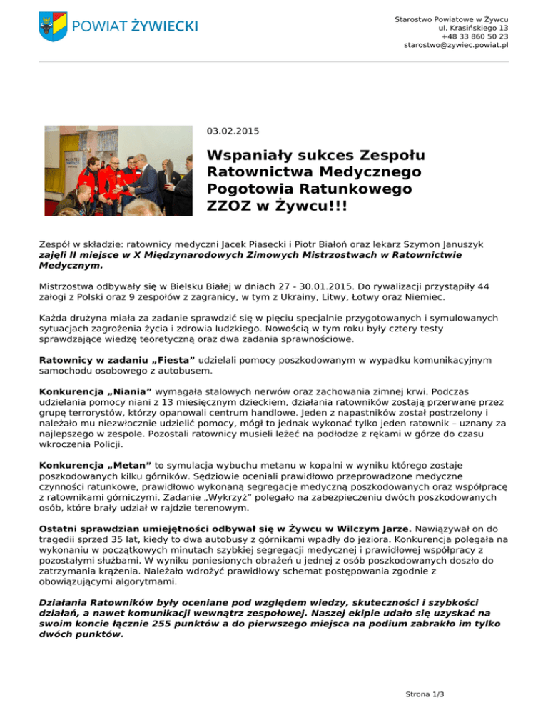Starostwo Powiatowe w Żywcu ul. Krasińskiego 13 +48 33 860 50 23 [email protected] 03.02.2015 Wspaniały sukces Zespołu Ratownictwa Medycznego Pogotowia Ratunkowego ZZOZ w Żywcu!!! Zespół w składzie: ratownicy medyczni Jacek Piasecki i Piotr Białoń oraz lekarz Szymon Januszyk zajęli II miejsce w X Międzynarodowych Zimowych Mistrzostwach w Ratownictwie Medycznym. Mistrzostwa odbywały się w Bielsku Białej w dniach 27 - 30.01.2015. Do rywalizacji przystąpiły 44 załogi z Polski oraz 9 zespołów z zagranicy, w tym z Ukrainy, Litwy, Łotwy oraz Niemiec. Każda drużyna miała za zadanie sprawdzić się w pięciu specjalnie przygotowanych i symulowanych sytuacjach zagrożenia życia i zdrowia ludzkiego. Nowością w tym roku były cztery testy sprawdzające wiedzę teoretyczną oraz dwa zadania sprawnościowe. Ratownicy w zadaniu „Fiesta” udzielali pomocy poszkodowanym w wypadku komunikacyjnym samochodu osobowego z autobusem. Konkurencja „Niania” wymagała stalowych nerwów oraz zachowania zimnej krwi. Podczas udzielania pomocy niani z 13 miesięcznym dzieckiem, działania ratowników zostają przerwane przez grupę terrorystów, którzy opanowali centrum handlowe. Jeden z napastników został postrzelony i należało mu niezwłocznie udzielić pomocy, mógł to jednak wykonać tylko jeden ratownik – uznany za najlepszego w zespole. Pozostali ratownicy musieli leżeć na podłodze z rękami w górze do czasu wkroczenia Policji. Konkurencja „Metan” to symulacja wybuchu metanu w kopalni w wyniku którego zostaje poszkodowanych kilku górników. Sędziowie oceniali prawidłowo przeprowadzone medyczne czynności ratunkowe, prawidłowo wykonaną segregacje medyczną poszkodowanych oraz współpracę z ratownikami górniczymi. Zadanie „Wykrzyż” polegało na zabezpieczeniu dwóch poszkodowanych osób, które brały udział w rajdzie terenowym. Ostatni sprawdzian umiejętności odbywał się w Żywcu w Wilczym Jarze. Nawiązywał on do tragedii sprzed 35 lat, kiedy to dwa autobusy z górnikami wpadły do jeziora. Konkurencja polegała na wykonaniu w początkowych minutach szybkiej segregacji medycznej i prawidłowej współpracy z pozostałymi służbami. W wyniku poniesionych obrażeń u jednej z osób poszkodowanych doszło do zatrzymania krążenia. Należało wdrożyć prawidłowy schemat postępowania zgodnie z obowiązującymi algorytmami. Działania Ratowników były oceniane pod względem wiedzy, skuteczności i szybkości działań, a nawet komunikacji wewnątrz zespołowej. Naszej ekipie udało się uzyskać na swoim koncie łącznie 255 punktów a do pierwszego miejsca na podium zabrakło im tylko dwóch punktów. Strona 1/3 Starostwo Powiatowe w Żywcu ul. Krasińskiego 13 +48 33 860 50 23 [email protected] Nasi Reprezentanci w powyższym składzie mieli okazję po raz drugi uczestniczyć w podobnych zawodach. W tym roku w klasyfikacji generalnej zajęli II miejsce, ale również: zdobyli puchar za najlepiej wykonane zadanie „Fiesta”, w którym nie mieli sobie równych, oraz puchar za zadanie sprawnościowe „MMM”. Wielotygodniowe przygotowania, najwyższej klasy prezentacja naszej ekipy oraz zdobyte drugie miejsce w X Międzynarodowych Zimowych Mistrzostwach w Ratownictwie Medycznym Bielsko Biała 2015 uhonorowane Pucharem Ministra Pracy i Polityki Społecznej zasługują na WIELKIE GRATULACJE! Jesteśmy z Nich bardzo dumni i trzymamy kciuki za dalsze sukcesy. Piotr Dziedzic Kierownik Działu Pomocy Doraźnej Władze Powiatu Żywieckiego serdecznie gratulują Zespołowi Ratownictwa Medycznego Pogotowia Ratunkowego ZZOZ w Żywcu zajęcia II miejsce w X Międzynarodowych Zimowych Mistrzostwach w Ratownictwie Medycznym. Życzymy wszystkim Ratownikom Medycznym wytrwałości w wykonywaniu odpowiedzialnego i trudnego zawodu. Niech ta służba dla mieszkańców naszego Powiatu przynosi Wam satysfakcję i radość. Strona 2/3 Starostwo Powiatowe w Żywcu ul. Krasińskiego 13 +48 33 860 50 23 [email protected] Strona 3/3 Powered by TCPDF (www.tcpdf.org)
