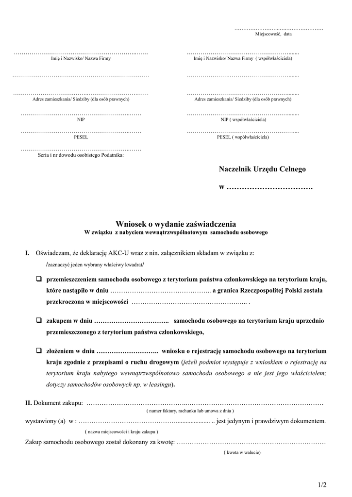……………………..….………………… Miejscowość, data ………………………….…………………………..…… ………………………….…………………....... Imię i Nazwisko/ Nazwa Firmy Imię i Nazwisko/ Nazwa Firmy ( współwłaściciela) …………………….……………………………………… ………………….…………………………....... ………………………….……..…………………….…… ……………………………………………........ Adres zamieszkania/ Siedziby (dla osób prawnych) Adres zamieszkania/ Siedziby (dla osób prawnych) ………………………………………………..…… ……………………………………………........ NIP NIP ( współwłaściciela) ………………………………………………..…… ……………………………………………….... PESEL PESEL ( współwłaściciela) ………………………………………………..…… Seria i nr dowodu osobistego Podatnika: Naczelnik Urzędu Celnego w ……………………………. Wniosek o wydanie zaświadczenia W związku z nabyciem wewnątrzwspólnotowym samochodu osobowego I. Oświadczam, że deklarację AKC-U wraz z nin. załącznikiem składam w związku z: /zaznaczyć jeden wybrany właściwy kwadrat/ przemieszczeniem samochodu osobowego z terytorium państwa członkowskiego na terytorium kraju, które nastąpiło w dniu ……………………………………….. a granica Rzeczpospolitej Polski została przekroczona w miejscowości ………………………………………….….. . zakupem w dniu …………………………….. samochodu osobowego na terytorium kraju uprzednio przemieszczonego z terytorium państwa członkowskiego, złożeniem w dniu ……………………….. wniosku o rejestrację samochodu osobowego na terytorium kraju zgodnie z przepisami o ruchu drogowym (jeżeli podmiot występuje z wnioskiem o rejestrację na terytorium kraju nabytego wewnątrzwspólnotowo samochodu osobowego a nie jest jego właścicielem; dotyczy samochodów osobowych np. w leasingu). II. Dokument zakupu: ………………………………………..……………………………………………………… ( numer faktury, rachunku lub umowa z dnia ) wystawiony (a) w : ………………………………………..................... .. jest jedynym i prawdziwym dokumentem. ( nazwa miejscowości i kraju zakupu ) Zakup samochodu osobowego został dokonany za kwotę: …………………………………………………………… ( kwota w walucie) 1/2 III. Przedmiotem czynności podlegającej opodatkowaniu jest samochód osobowy: 1. Marka samochodu: …………………………………………………………….. 2. Model: …………………………………………………………………………. 3. Numer nadwozia: 4. Typ*: Sedan Kombi Hatchback Coupe Cabrliolet Van 5. Ilość drzwi: .………. Ilość miejsc siedzących………… 6. Rodzaj skrzyni biegów*: Manualna 7. Rodzaj napędu*: Przedni 8. Rodzaj paliwa*: Benzyna Tylny Automatyczna Ilość biegów do przodu………… 4x4 Olej napędowy Gaz Inne 9. Pojemność silnika (cm³): .......................................Moc silnika [kW]: ………………………… 10. Rok produkcji: .................................... 11. Stan licznika na dzień powstania obowiązku podatkowego (przebieg) …………..………... km 12. Inne informacje: …………………………………………………………………………………………………………………… …………………………………………………………………………………………………………………… …………………………………………………………………………………………………………………… …………………………………………………………………………………………………………………… …………………………………………………………………………………………………………………… …………………………………………………………………………………………………………………… …………………………………………………………………………………………………………………… ………………………………………………………………………………………………………………… * zaznaczyć właściwe IV. Dokumenty dołączone do wniosku: 1. Rachunek /faktura/ umowa z dnia ……………………………………………………………… 2. Książka pojazdu/ zagraniczny dokument rejestracyjny nr ……………………………………… 3. Dowód wpłaty akcyzy wg. K-103/BDW Nr ………………………. 4. Dowód uiszczenia opłaty skarbowej w kwocie …….. zł wg. K-103/BDW Nr …………..…….. 5. …………………………………………………………………………….…………….…..….... 6. ........................................................................................................................................................ .…………………………………… (podpis podatnika) 2/2
